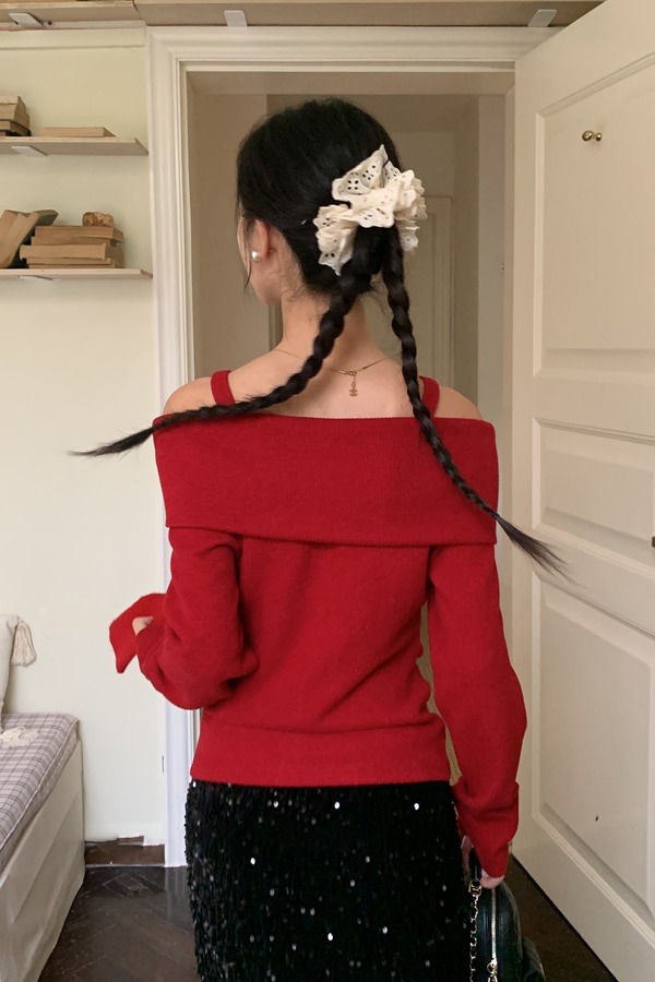 SIA SAYLOR 显白红色一字肩气质蝴蝶结针织上衣 21939