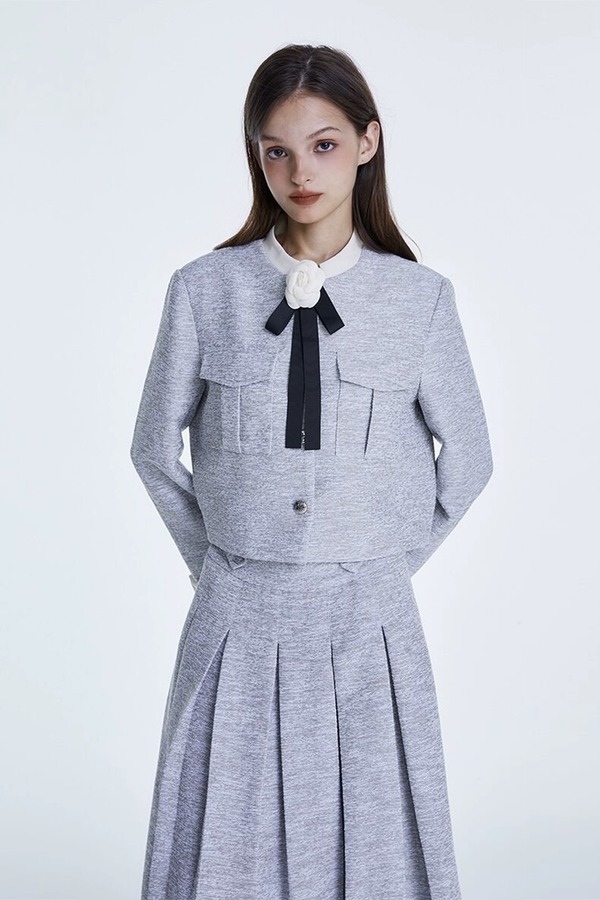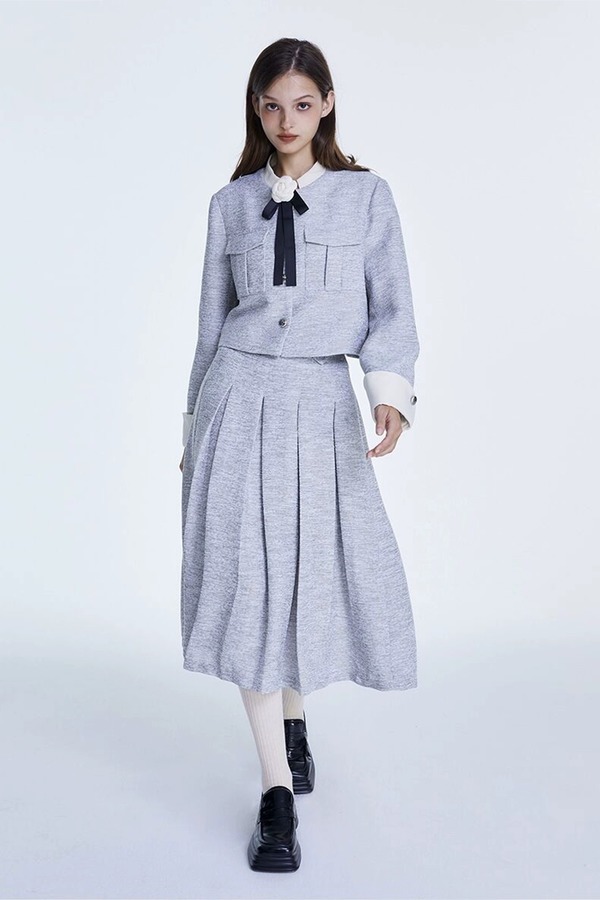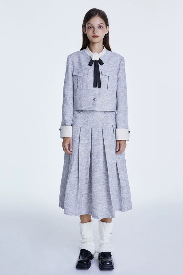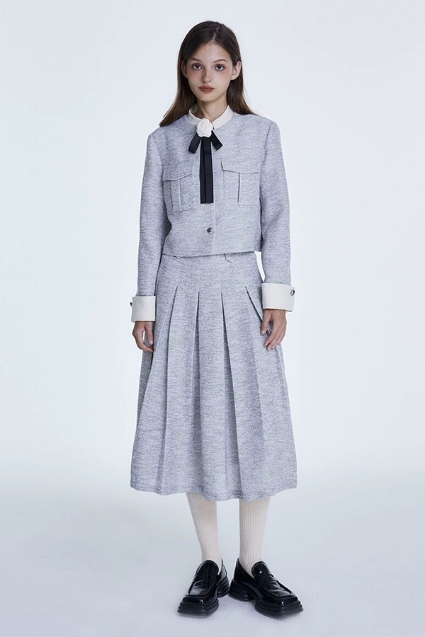 Le Malene 蓝灰色拼接式小香风外套半裙套装 19348