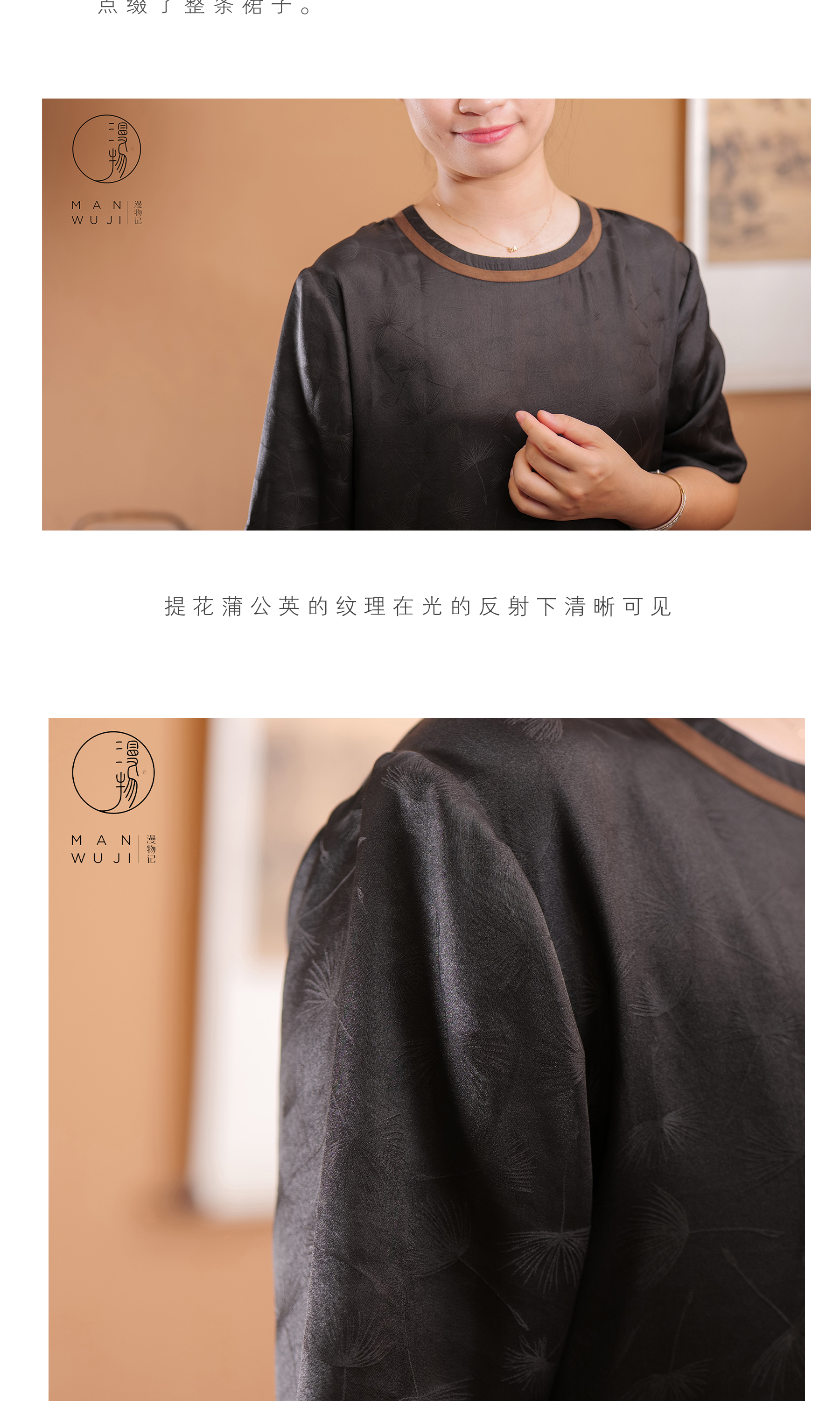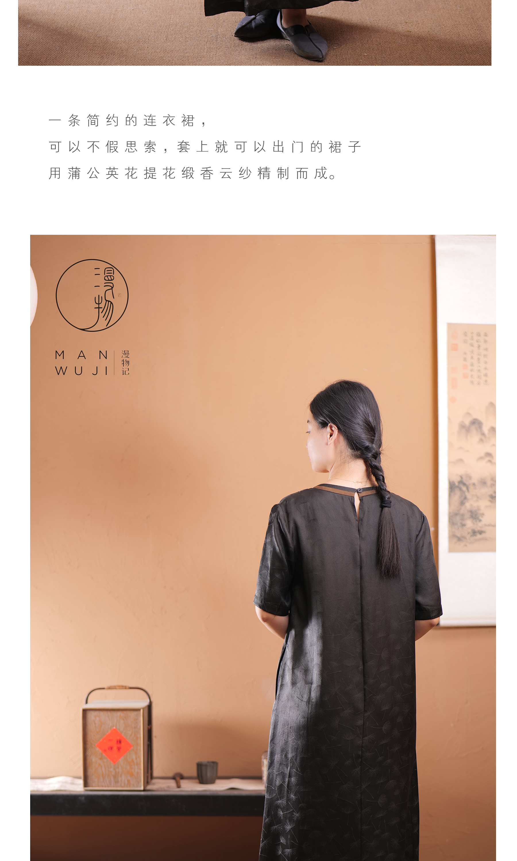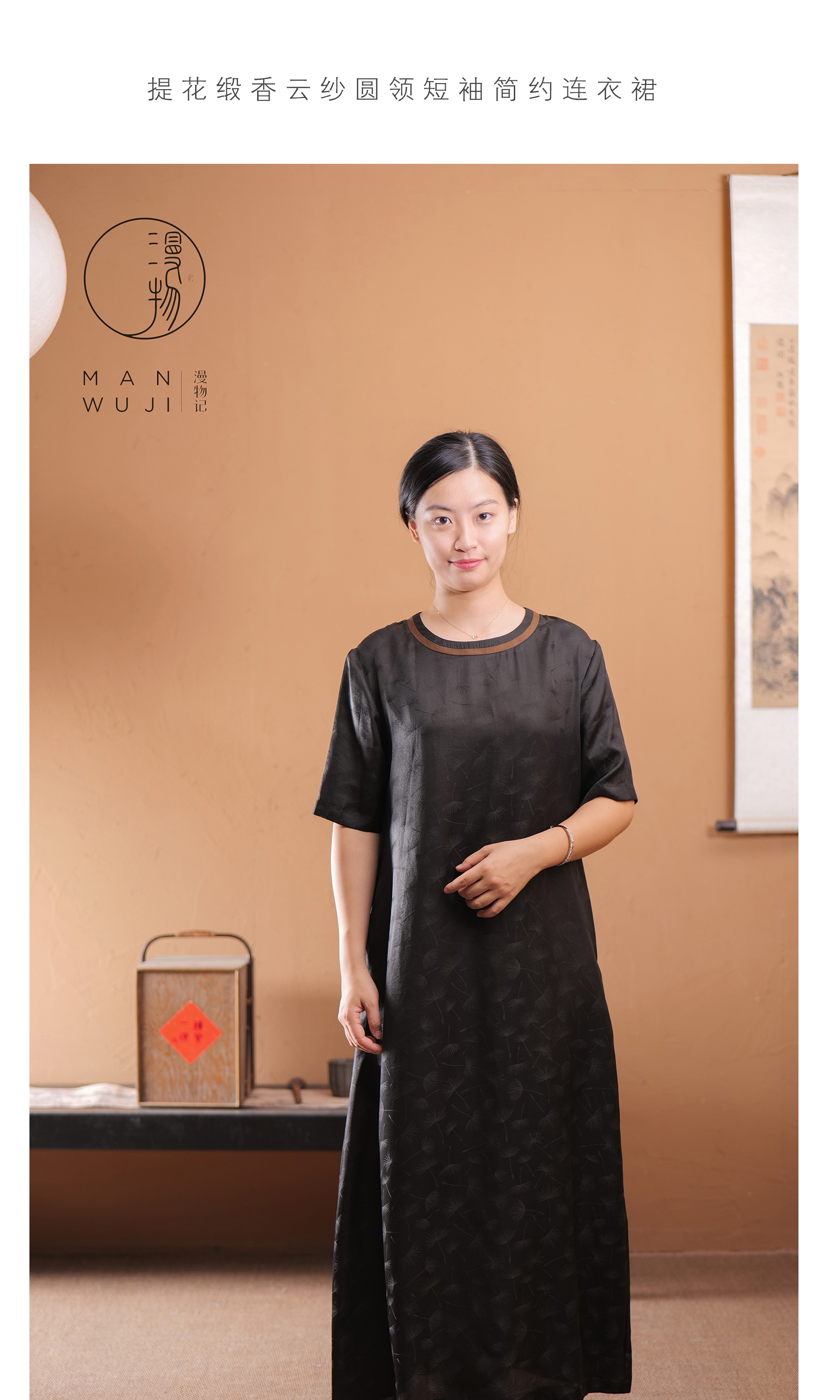 漫物记提花缎香云纱圆领短袖简约连衣裙XYS-089