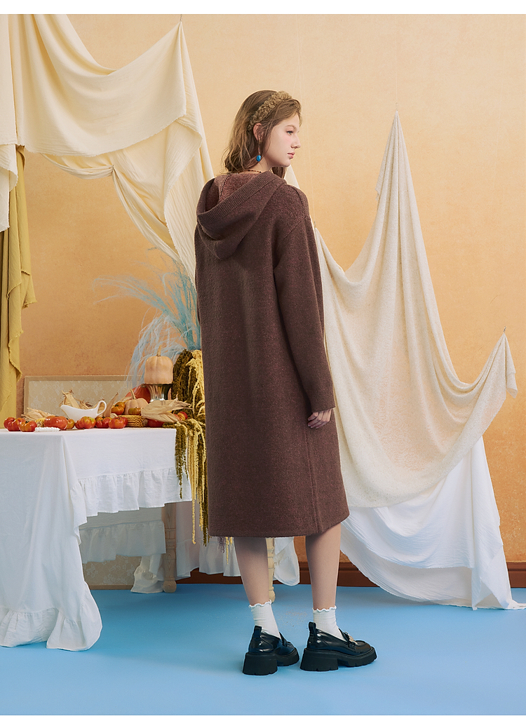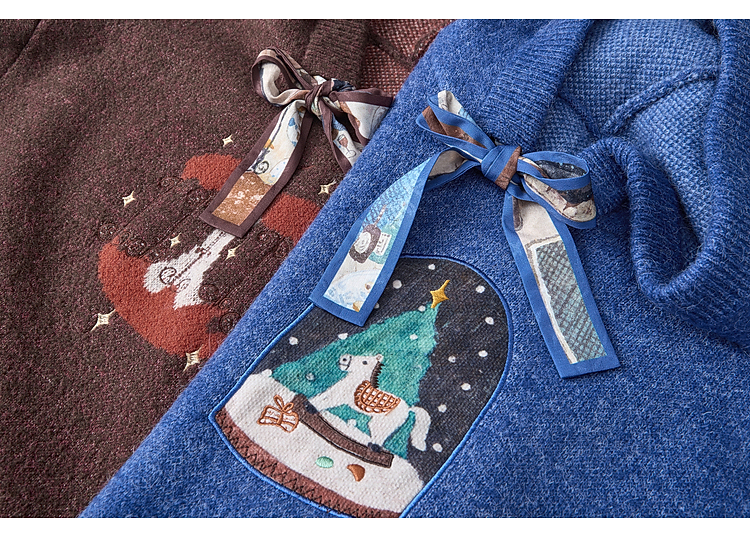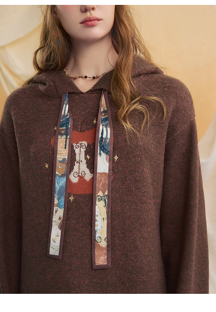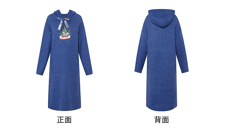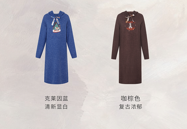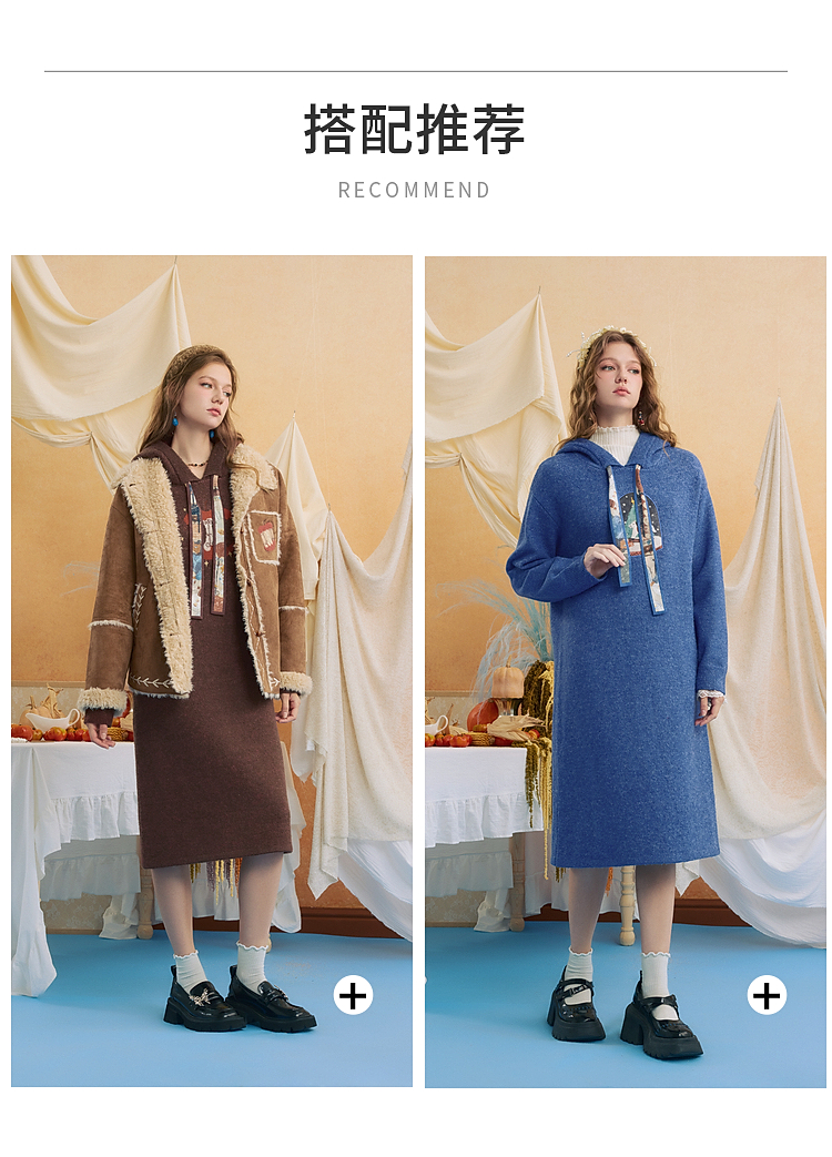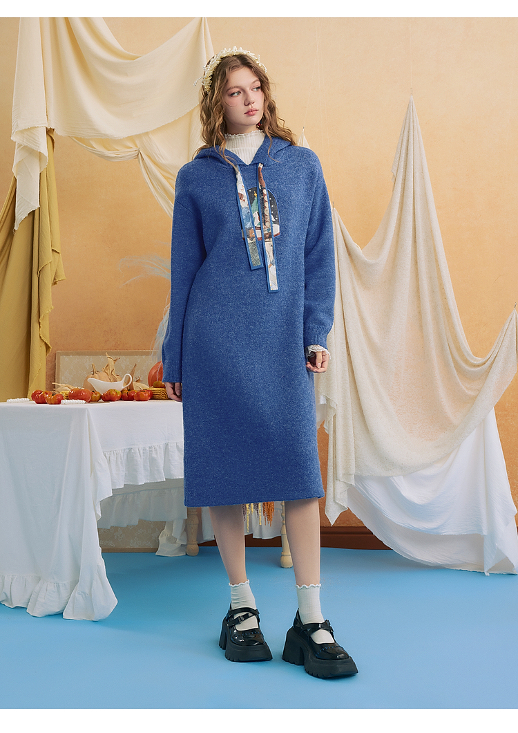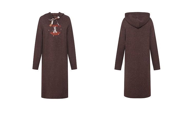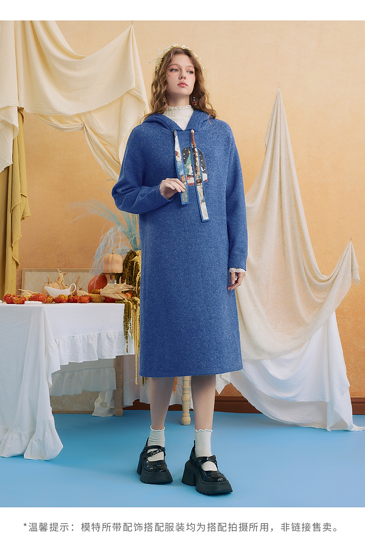 两三事绵延温柔2025冬季新款卡通刺绣印花抽绳连帽毛衣裙连衣裙
