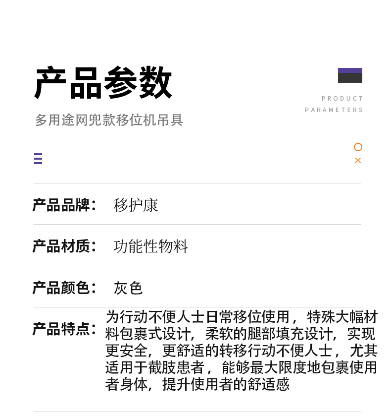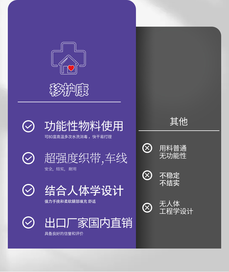 移护康养老用品生产厂家,旗下品牌:移互康专业销售老人转移及日常护理系列产品,包括移位机吊具,转移床垫,防褥疮脚套 ,防抓伤手套,扶抱腰带,长者餐具等产品 。