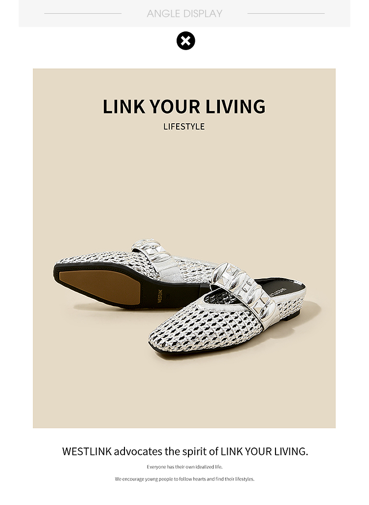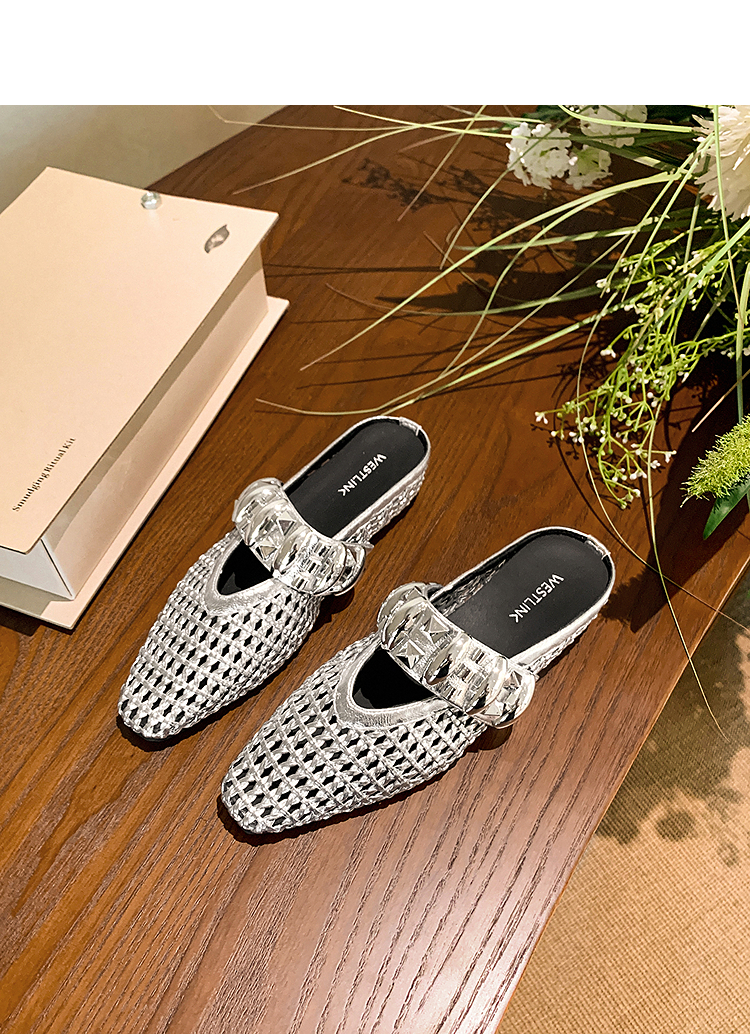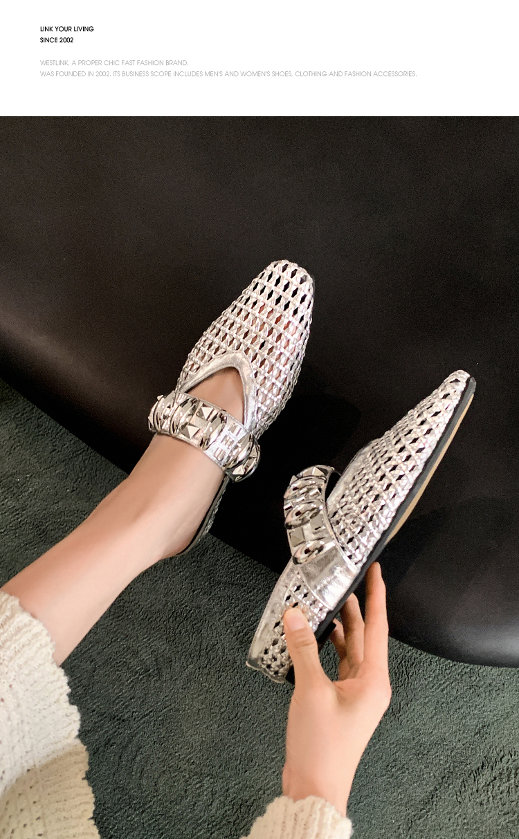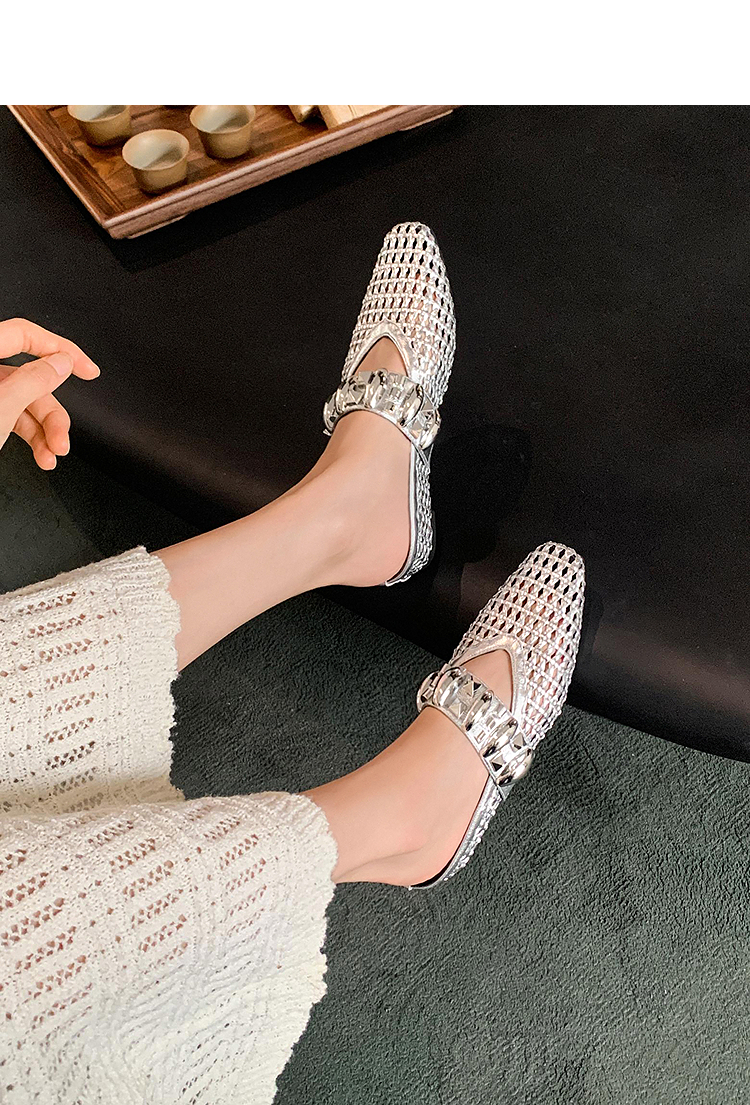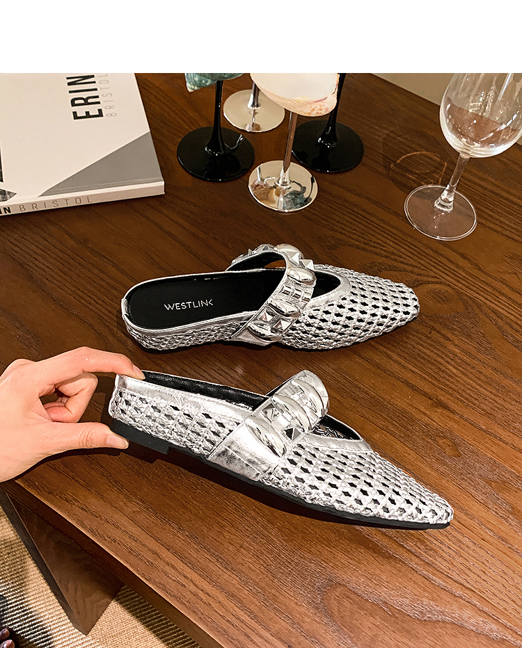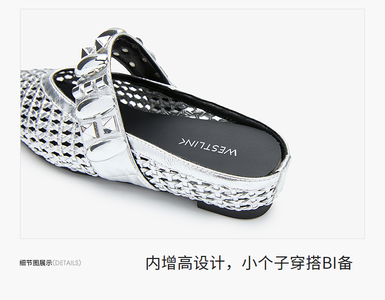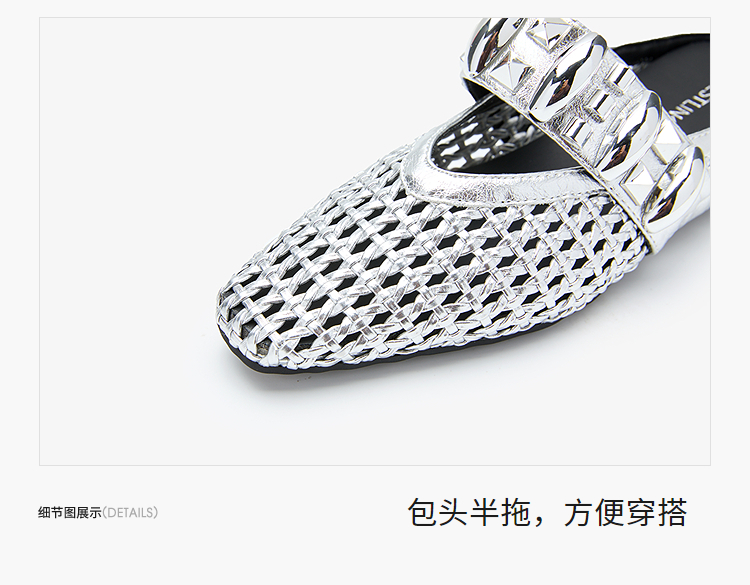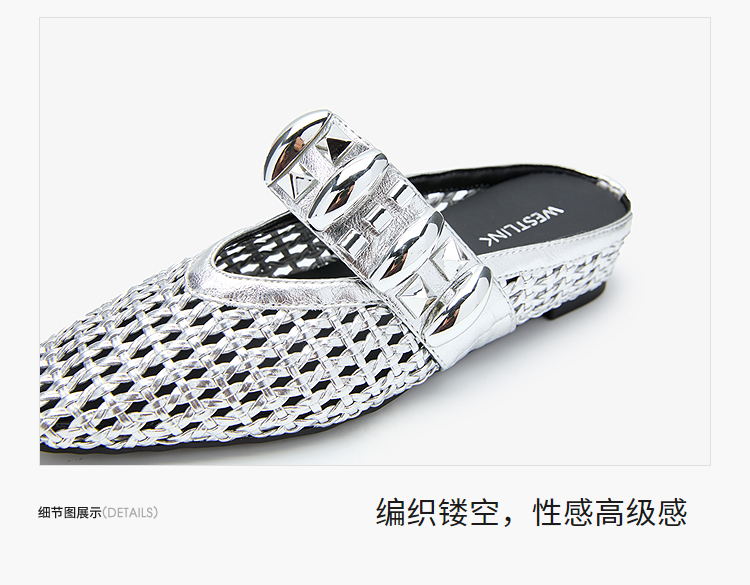 西遇一脚蹬包头半拖女新款秋季绝美编织镂空银色单鞋外穿拖鞋V1456906