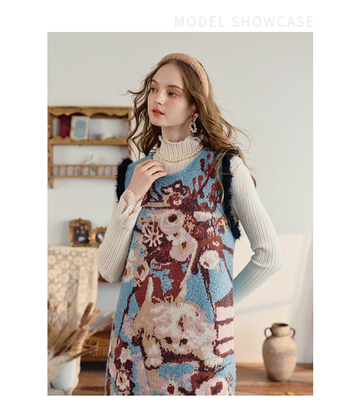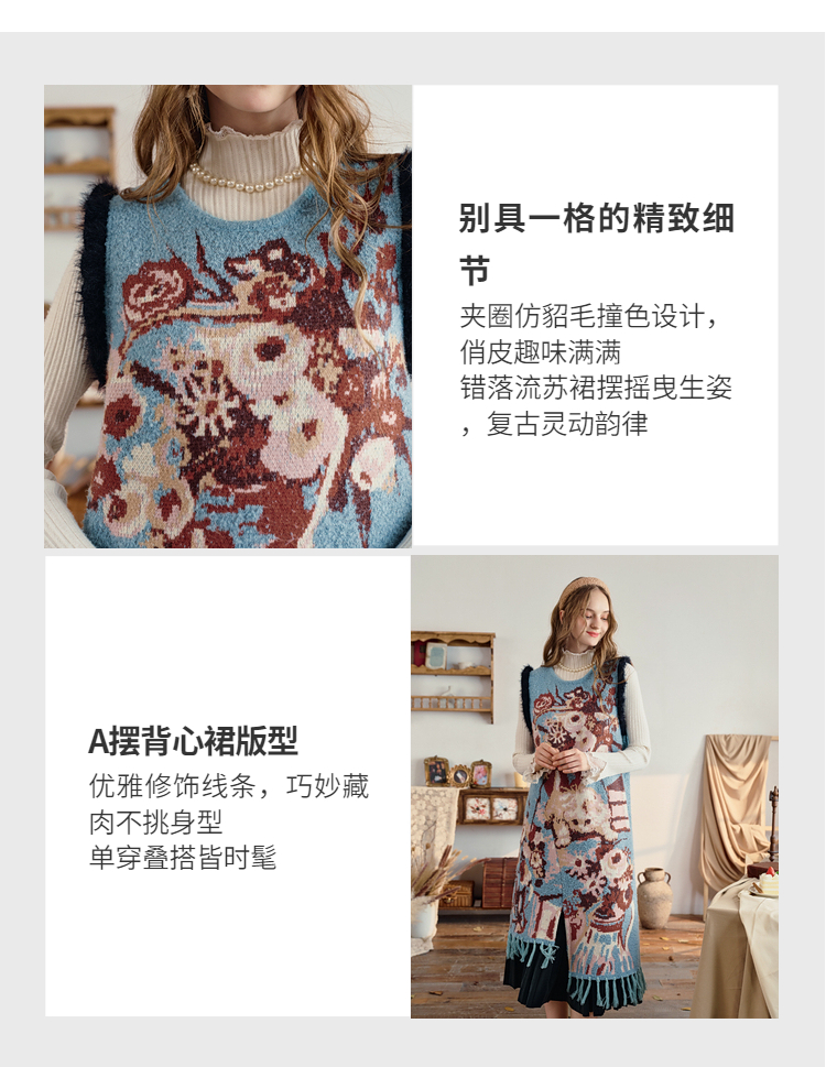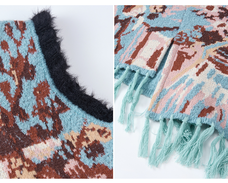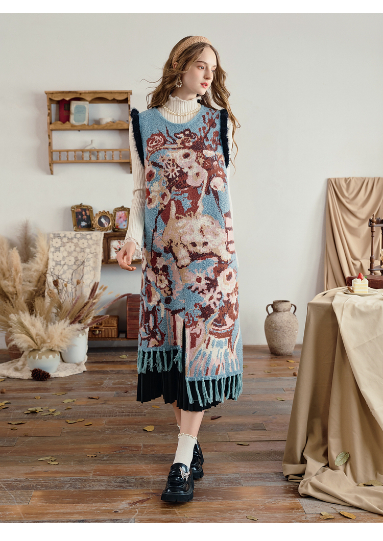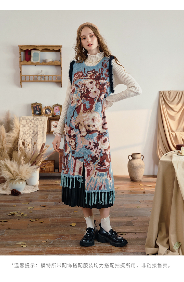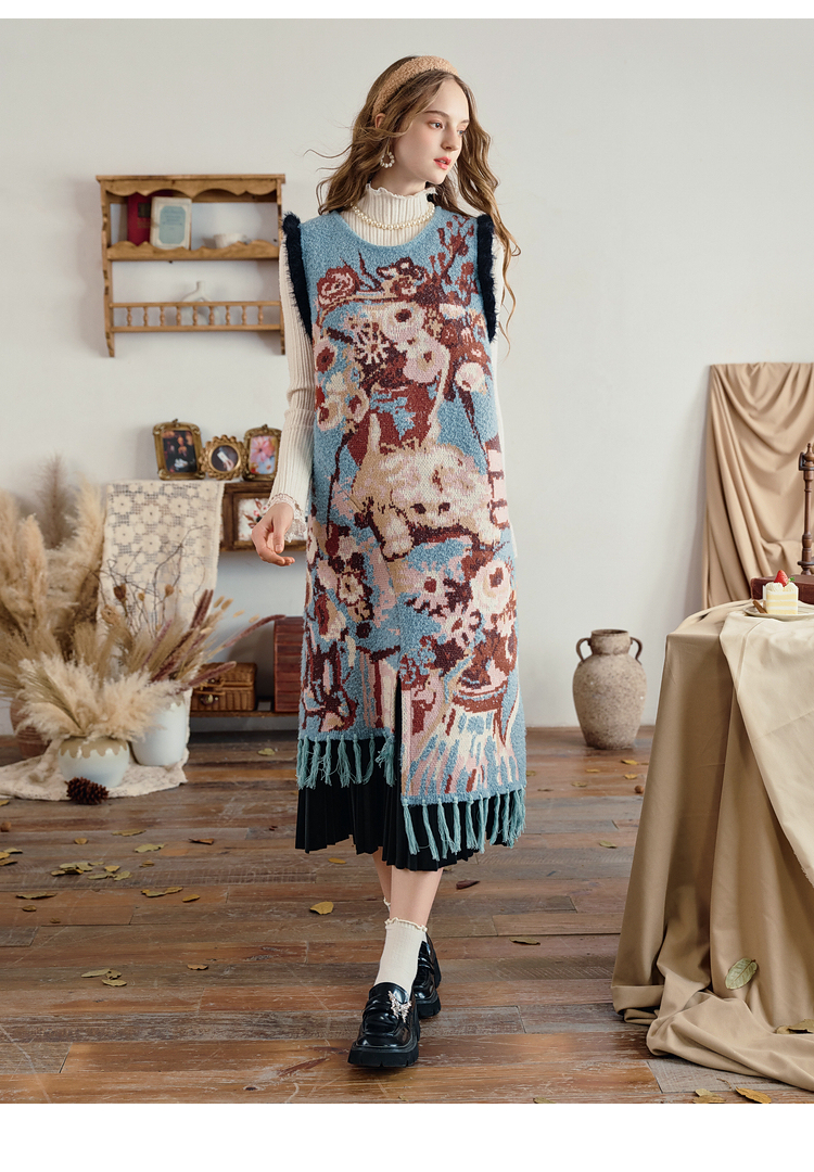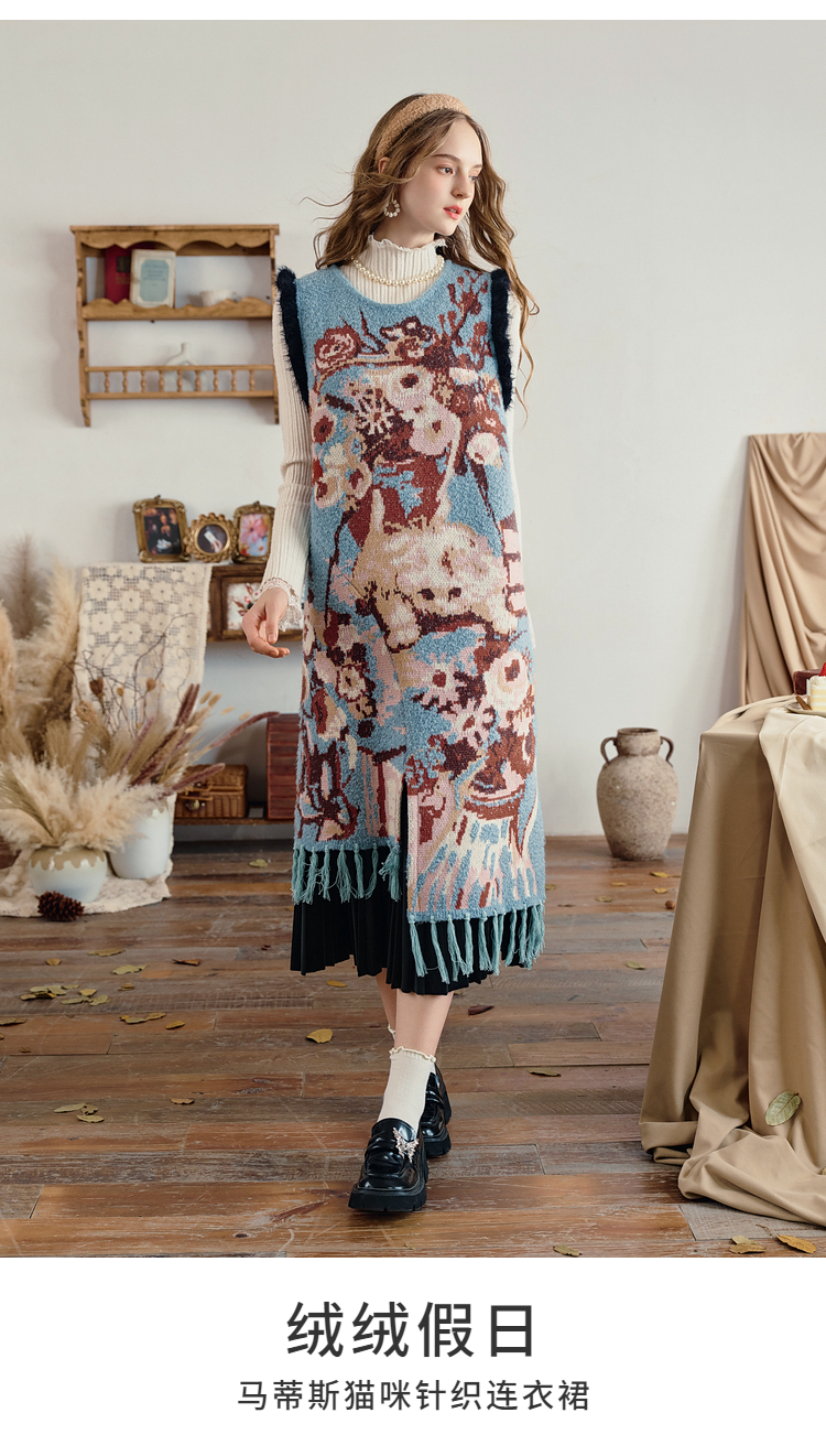 两三事绒绒假日2025冬季新款复古流苏不对称下摆花色毛衣裙连衣裙
