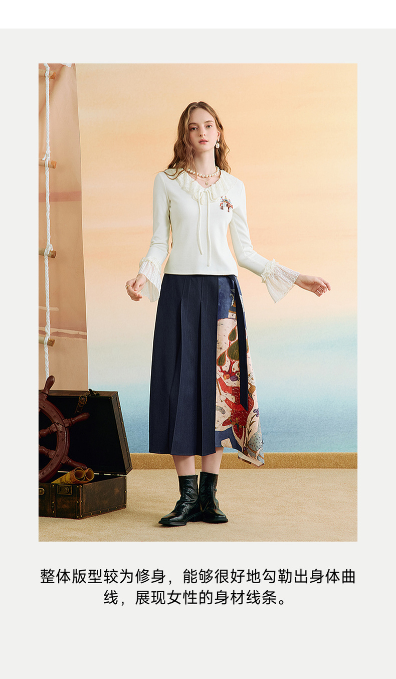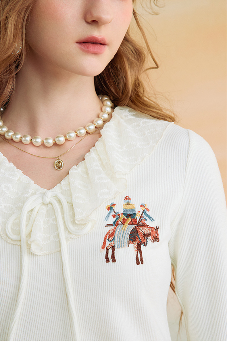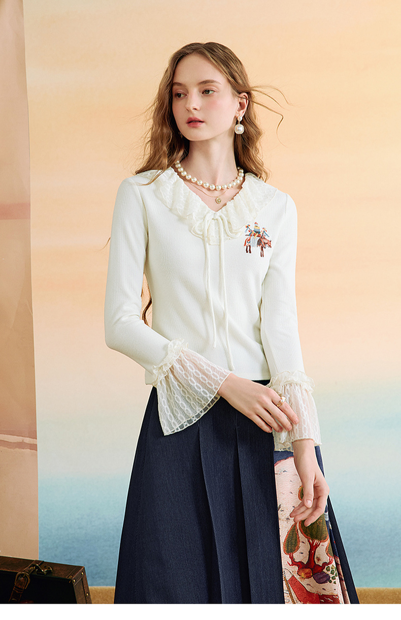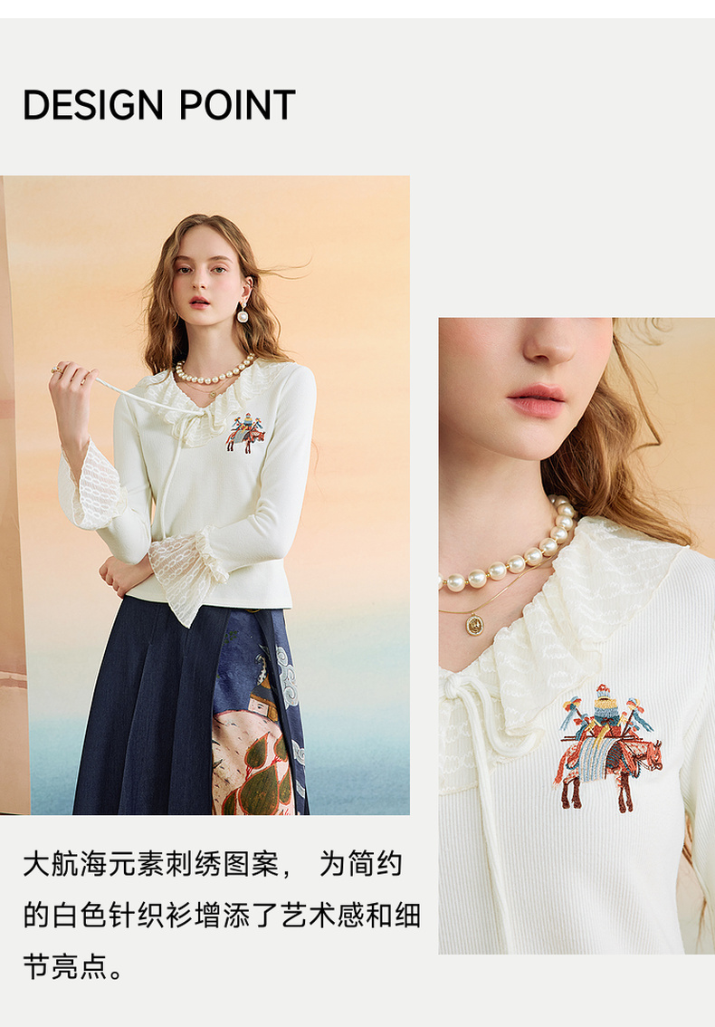 两三事 风中之城 2025秋季新款甜美蕾丝拼接刺绣打底针织衫女