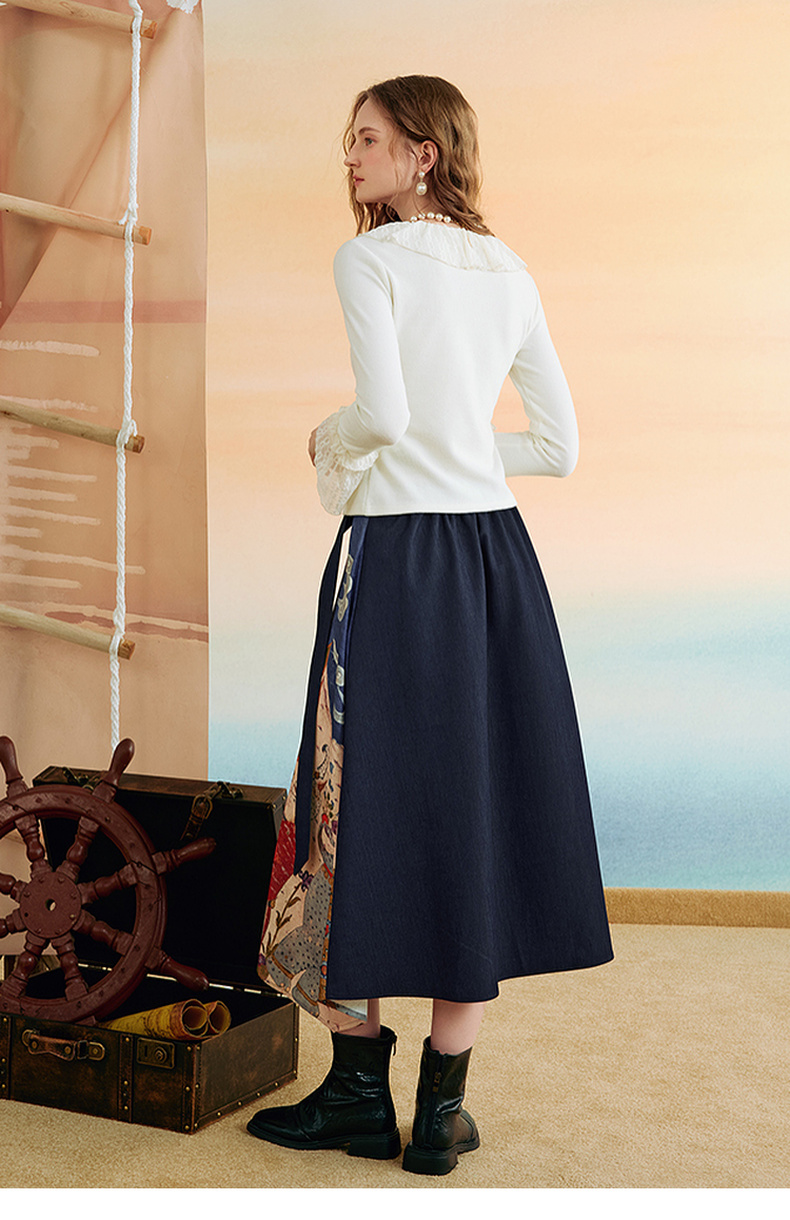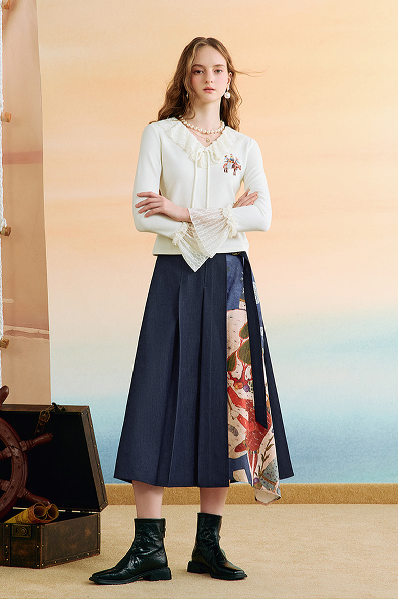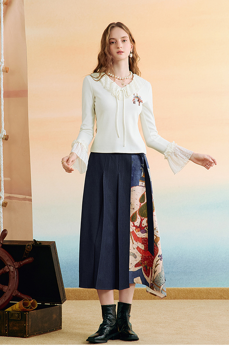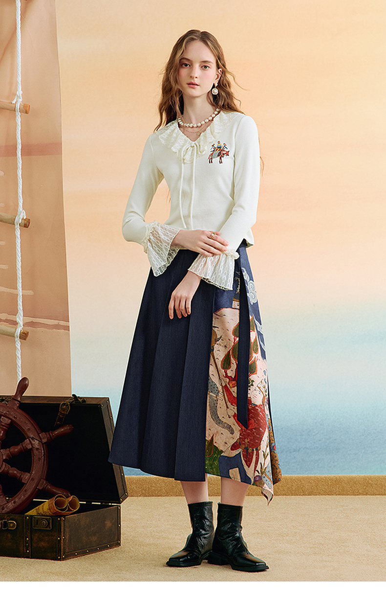 两三事 风中之城 2025秋季新款甜美蕾丝拼接刺绣打底针织衫女
