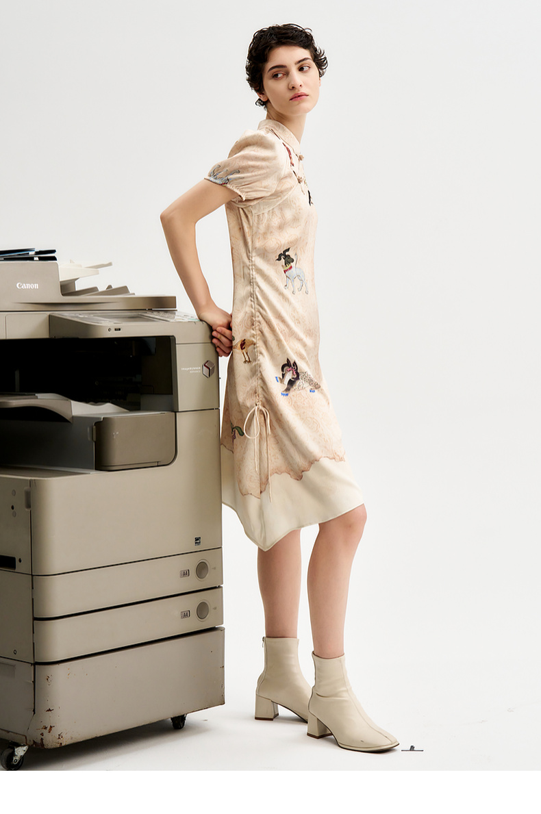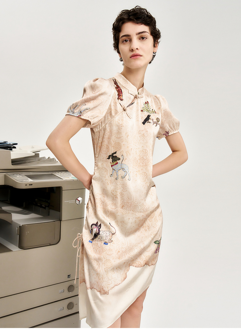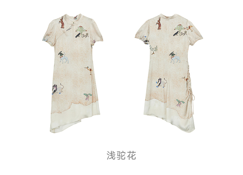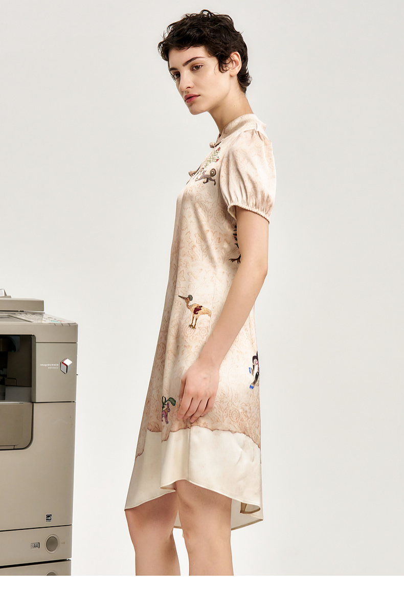 谜底旗袍裙女2024秋新品新中式主题印花修身连衣裙短袖243ML1071