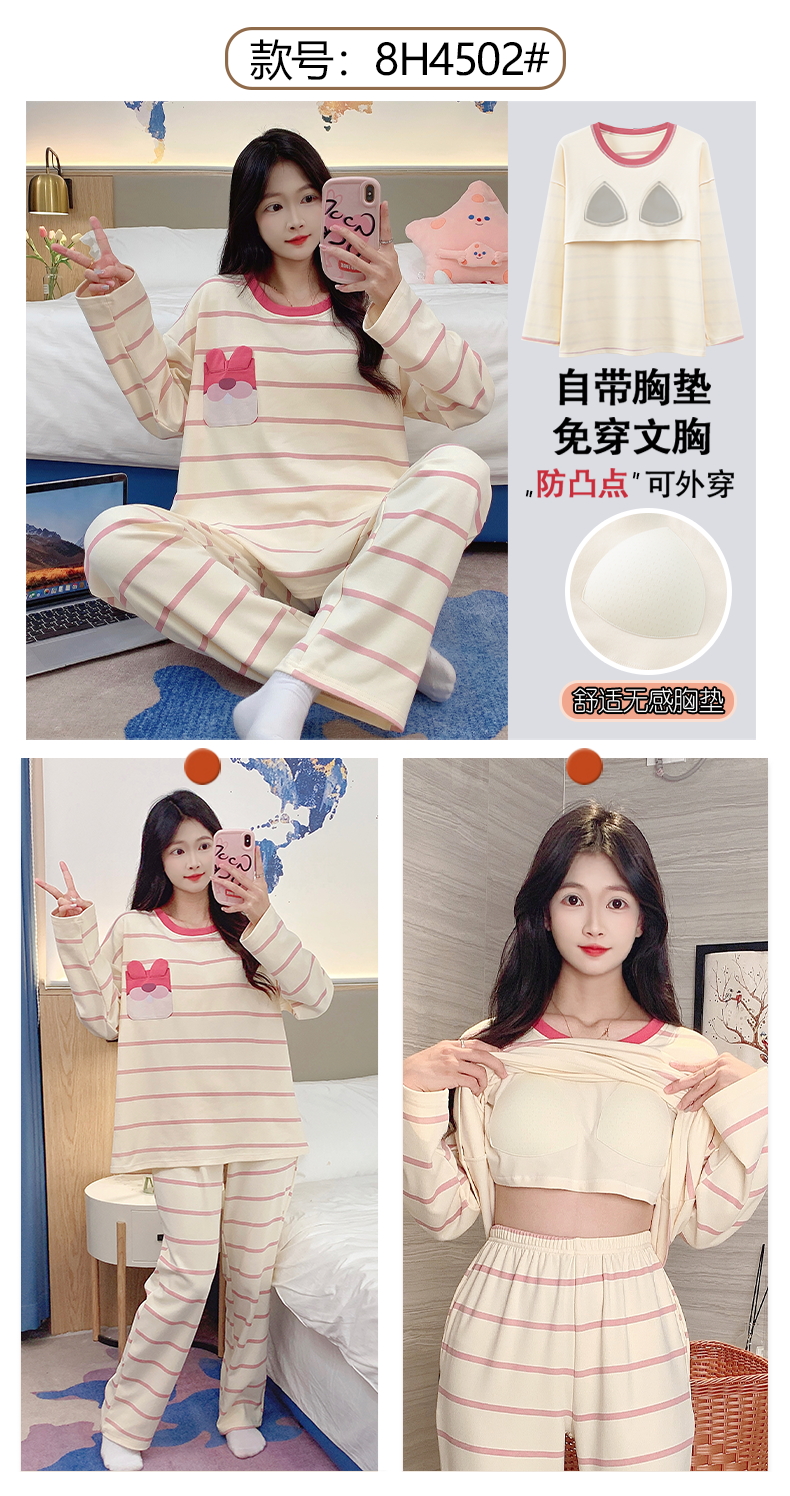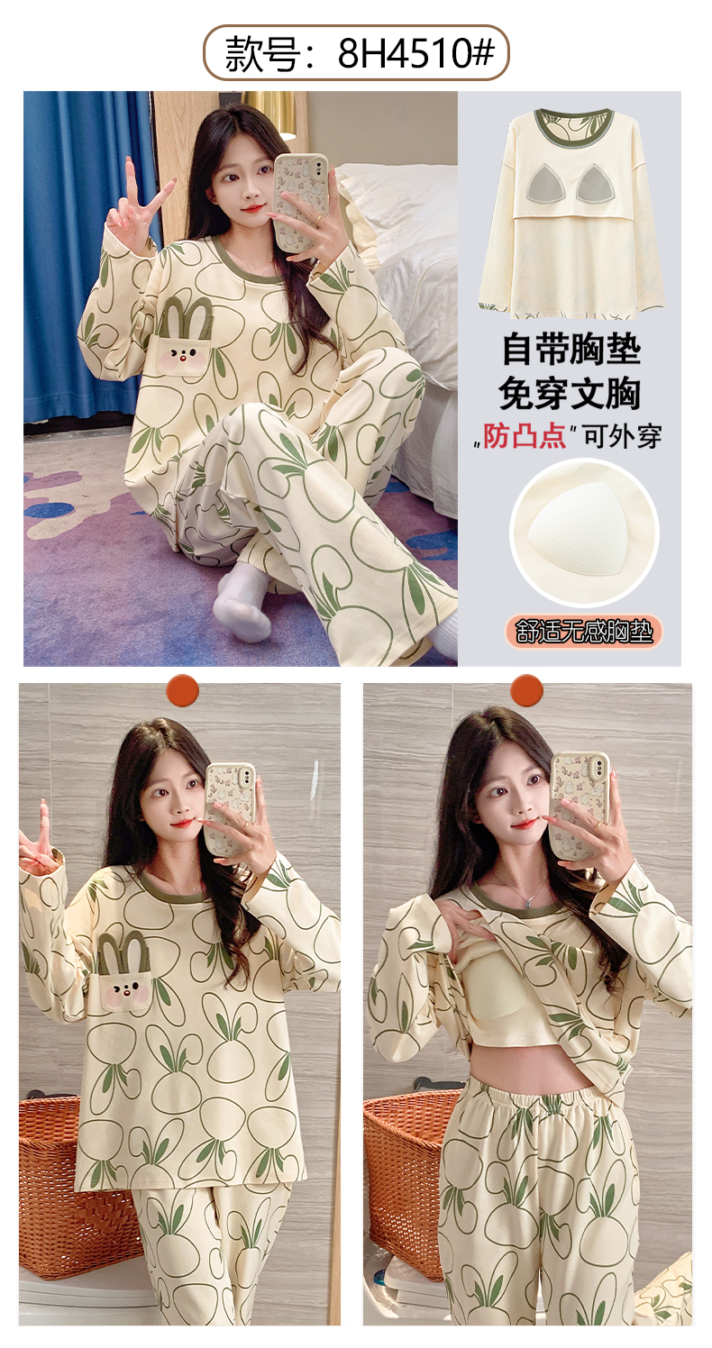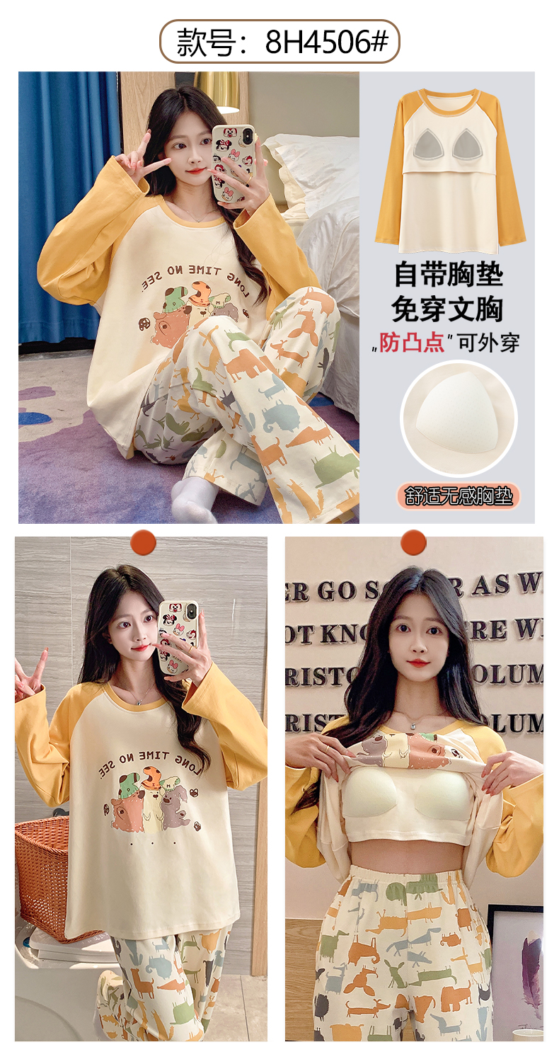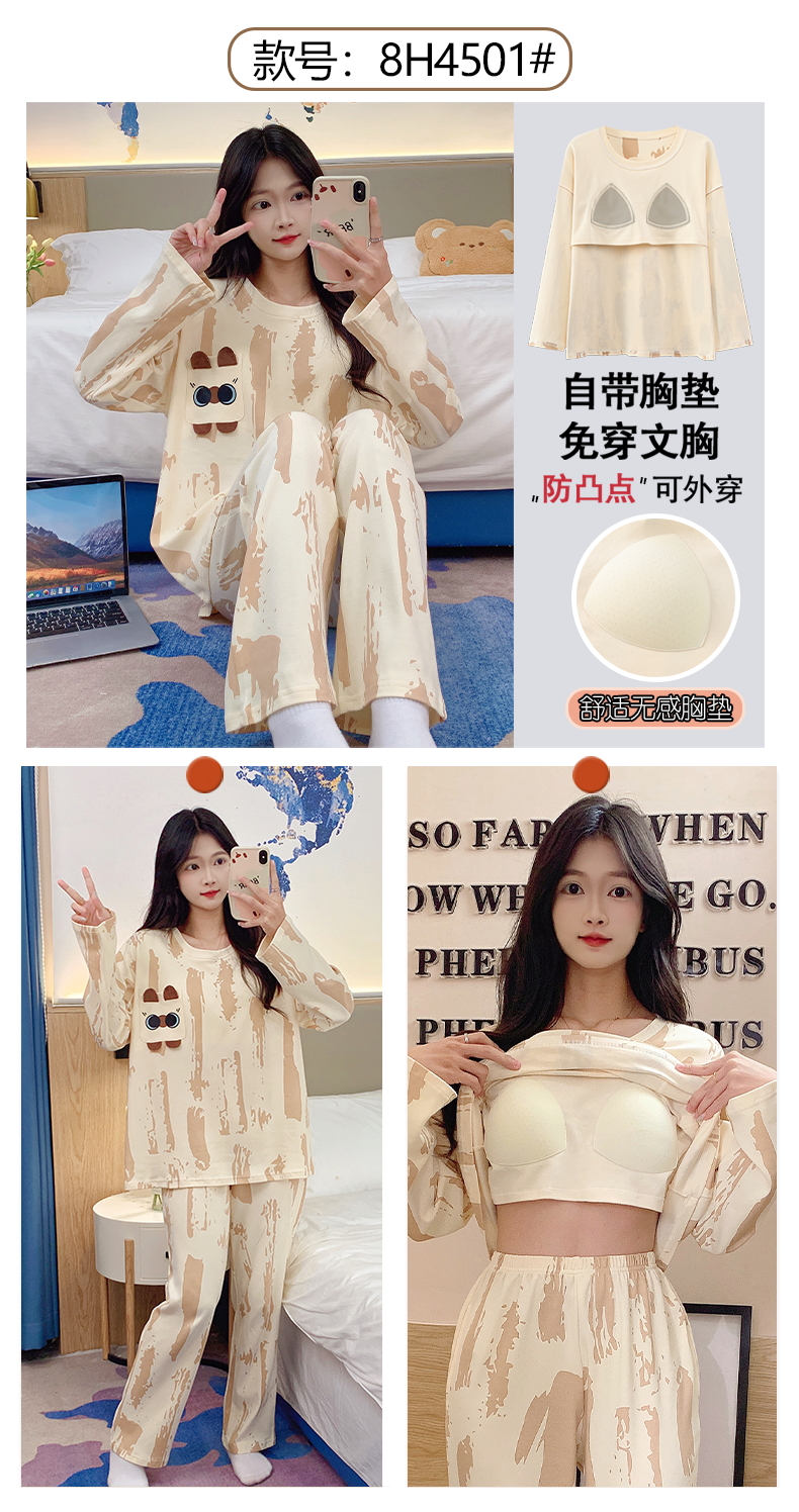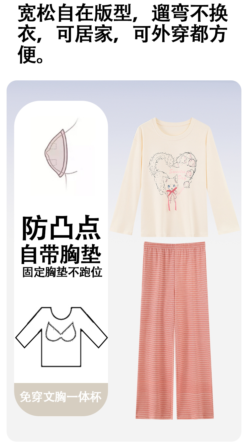 自然醒清甜牛奶丝家居服女款套头(带胸垫)睡衣春秋季长袖长裤卡通可爱宽松套装新款女士冬天家居服QH