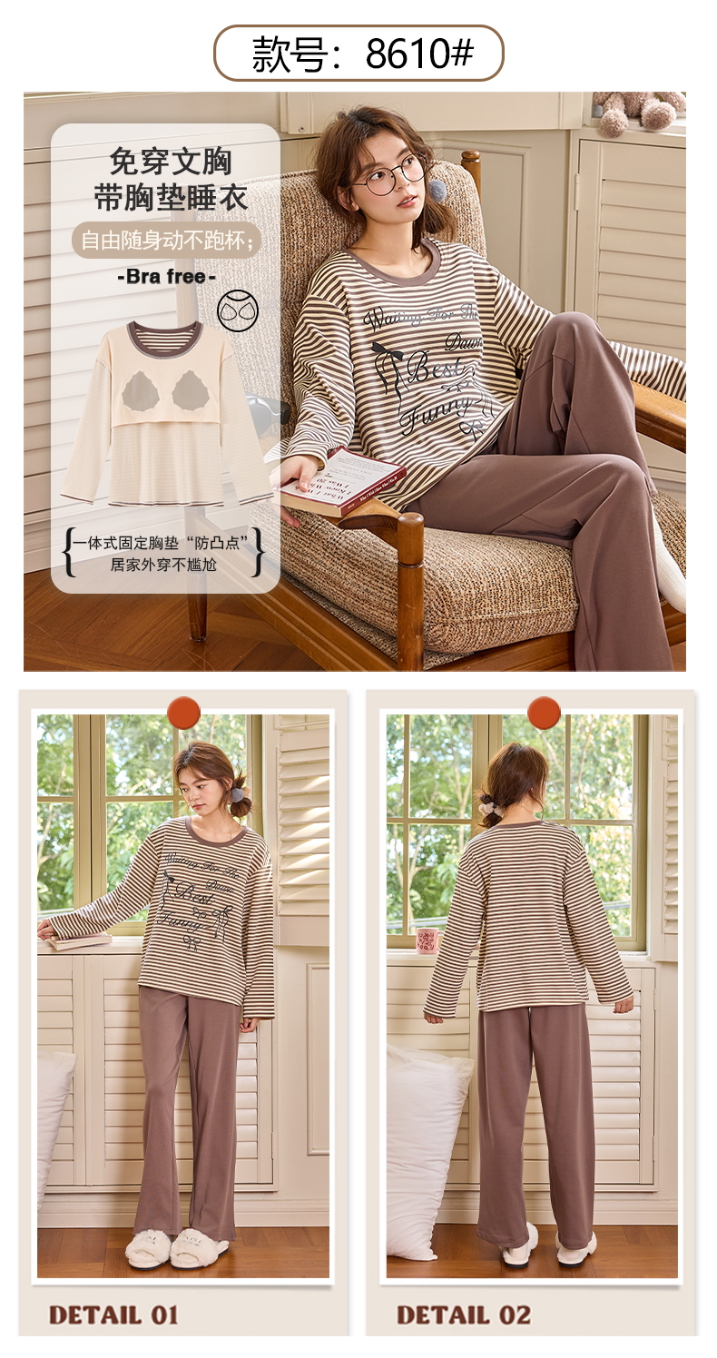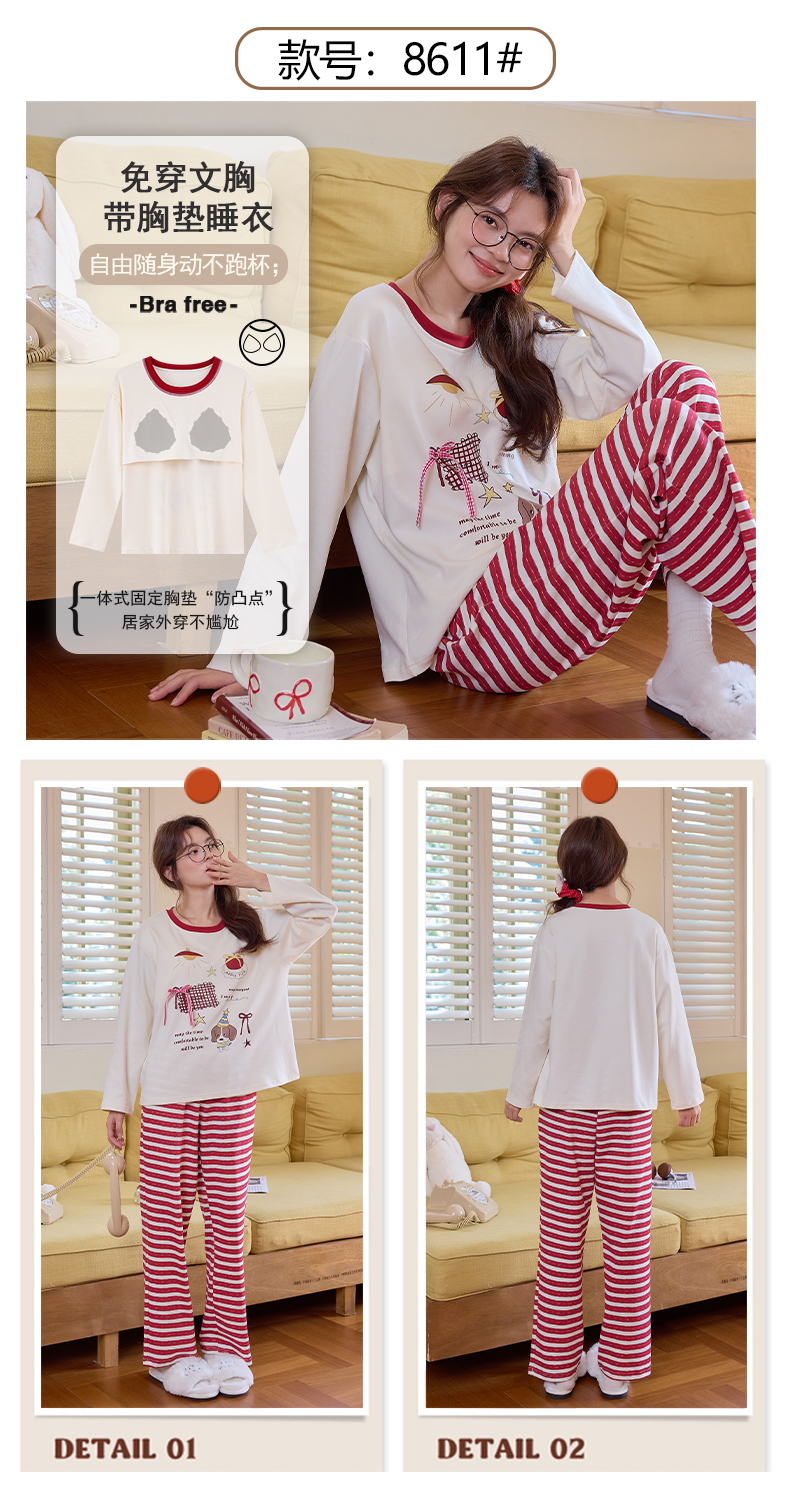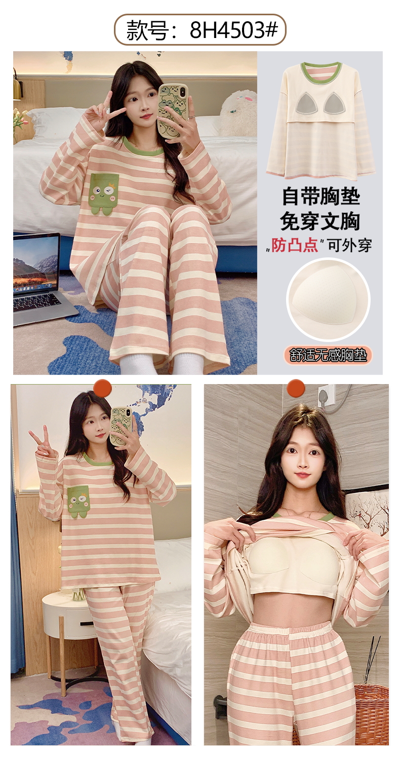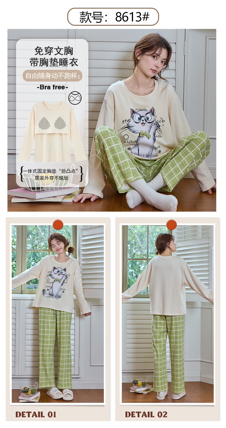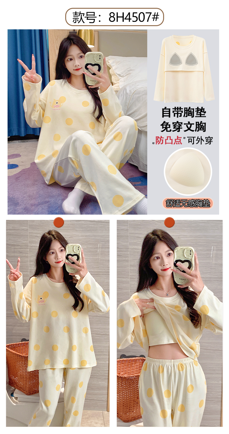 自然醒清甜牛奶丝家居服女款套头(带胸垫)睡衣春秋季长袖长裤卡通可爱宽松套装新款女士冬天家居服QH