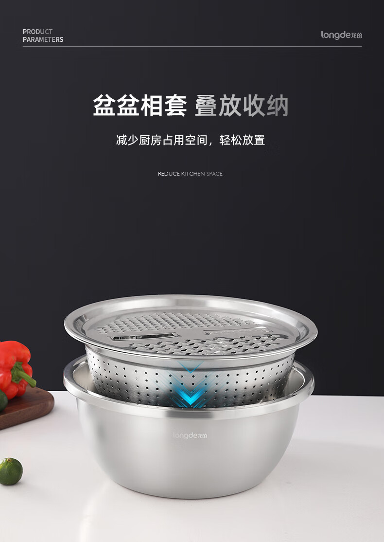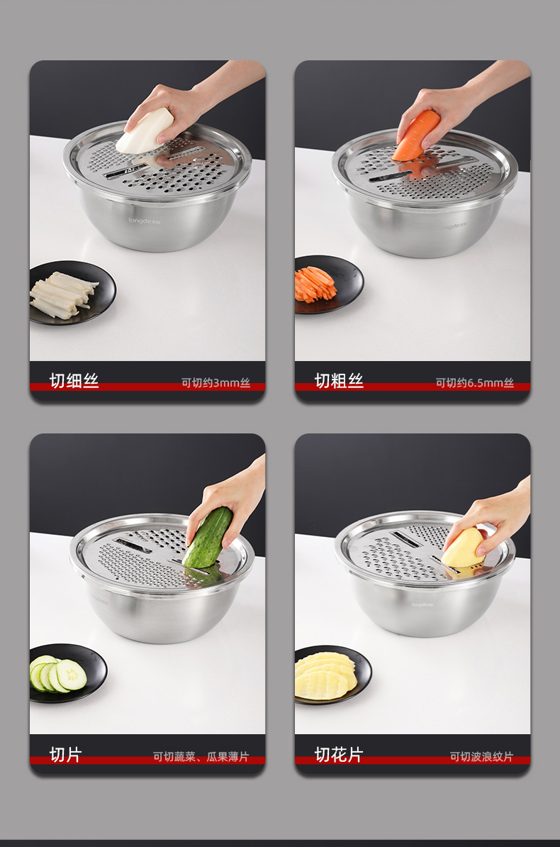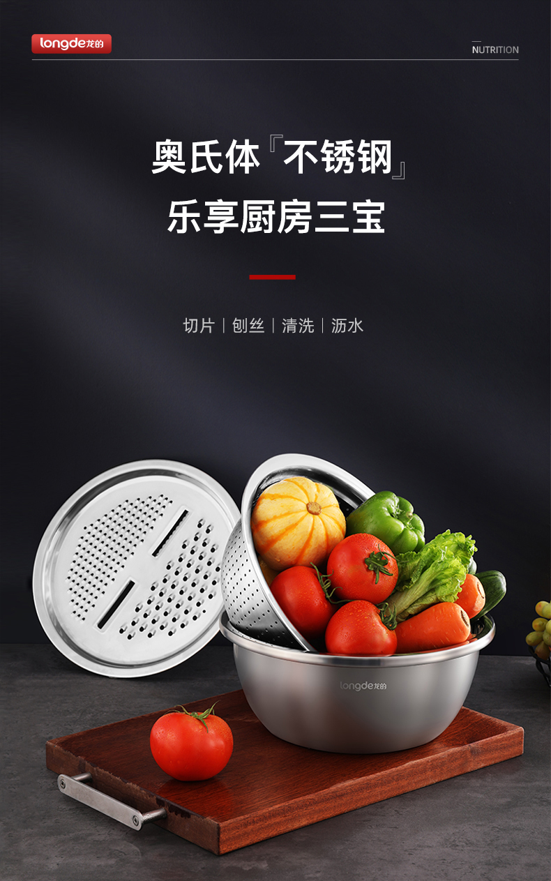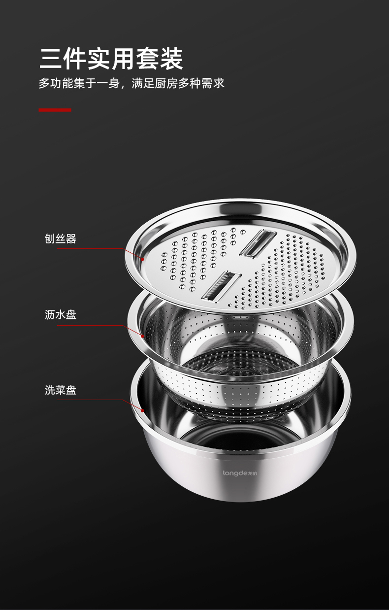 【小家电】龙的longde厨房三宝多功能切菜器切丝切片萝卜土豆丝器刨丝器洗菜盆沥水盘厨房三件套 LD-CJ891-3 HF