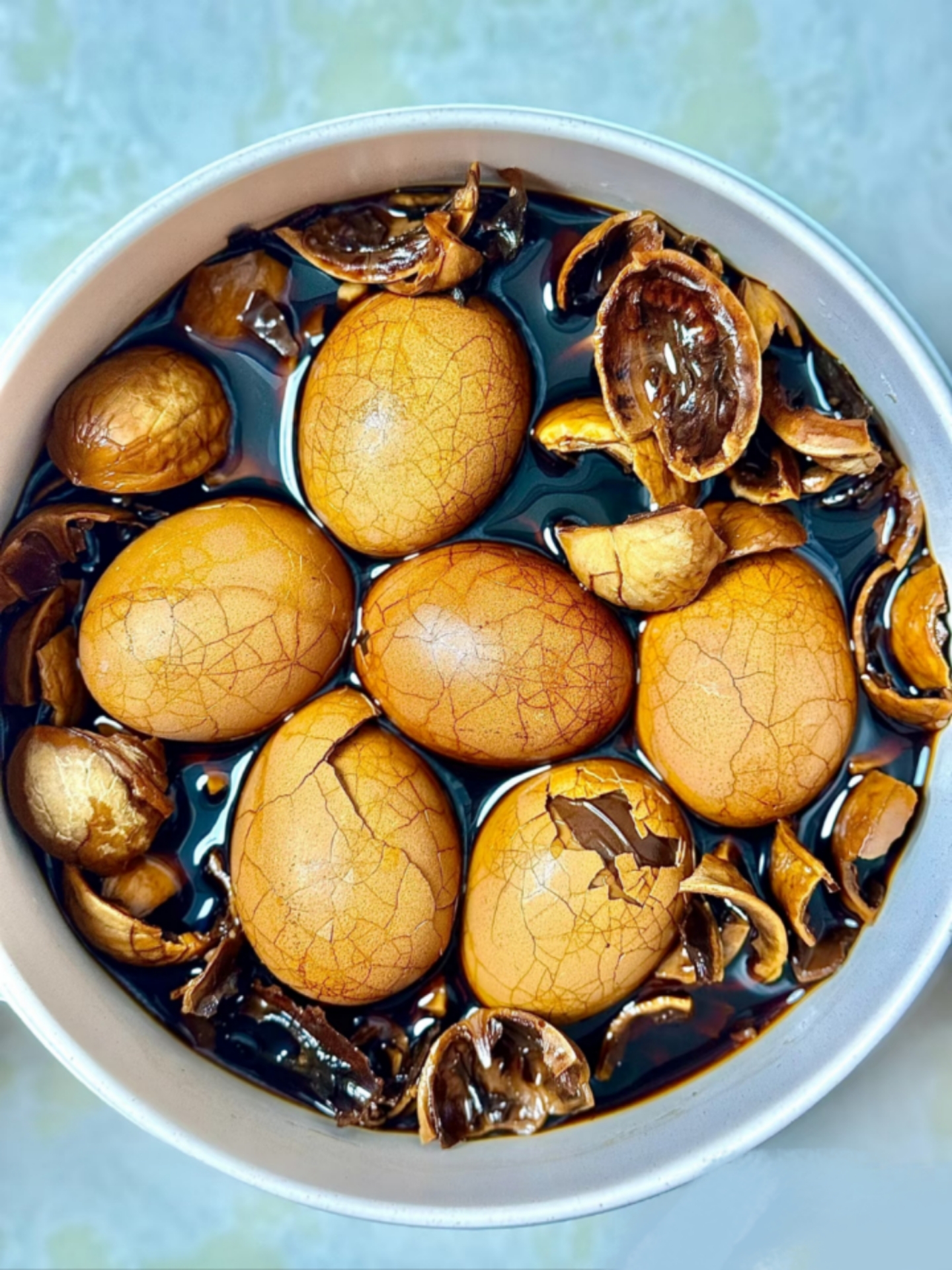 卤蛋:如核桃壳卤蛋,将核桃壳、分心木和陈皮一起煮出汤汁,放入洗净的鸡蛋,加盐、生抽煮约10分钟,敲破鸡蛋壳,再煮10分钟后关火浸泡一夜入味 。