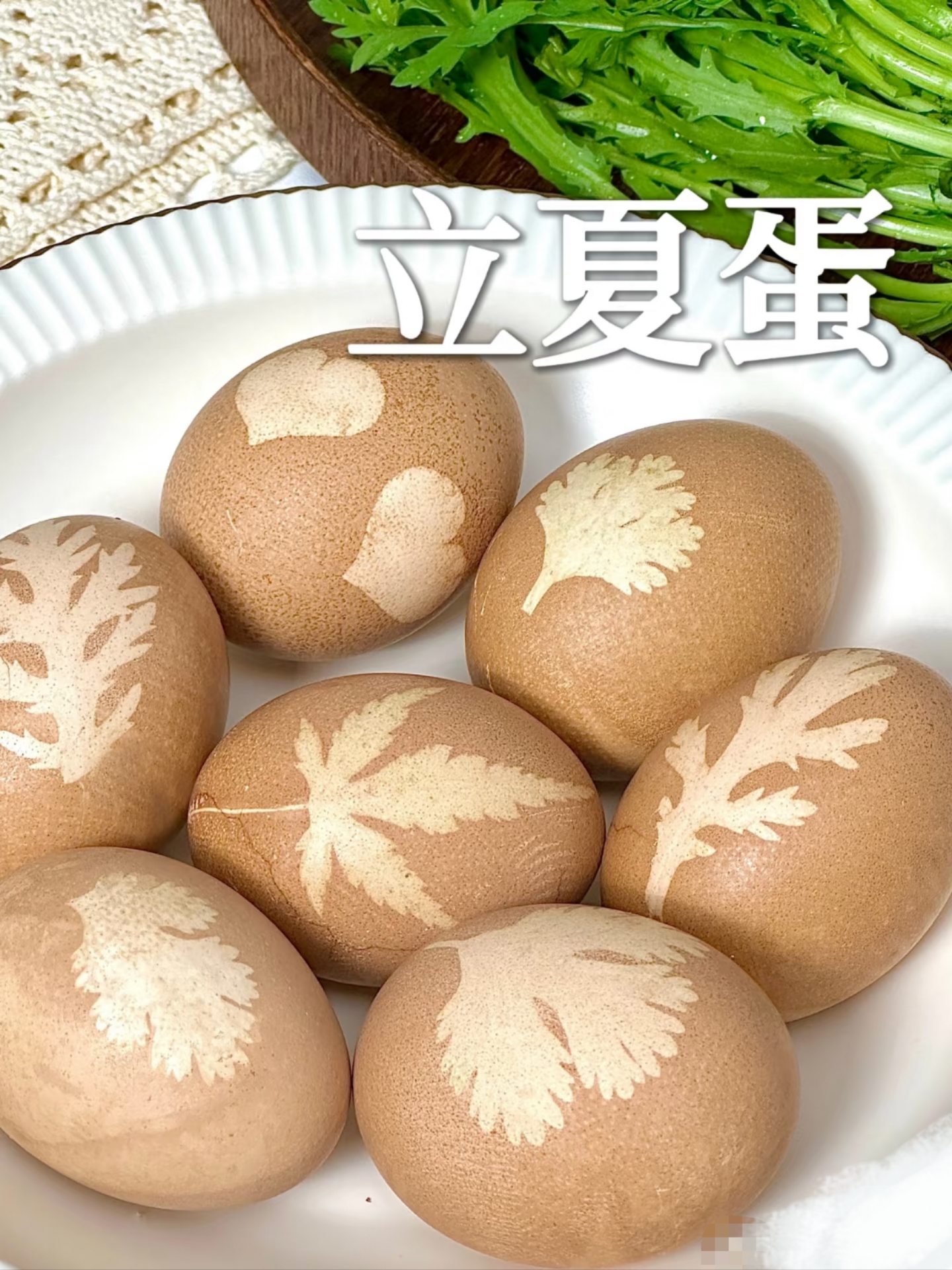 立夏印花卤蛋:鸡蛋冷水下锅,大火煮沸后改中火煮八分钟,捞出剥壳粘香菜叶,用纱布包好扎紧,将香叶、红茶等做成料包,与生抽、老抽、冰糖等一起煮成卤汁,放入鸡蛋中小火煮15分钟,加盐关火,晾凉浸泡一晚 。