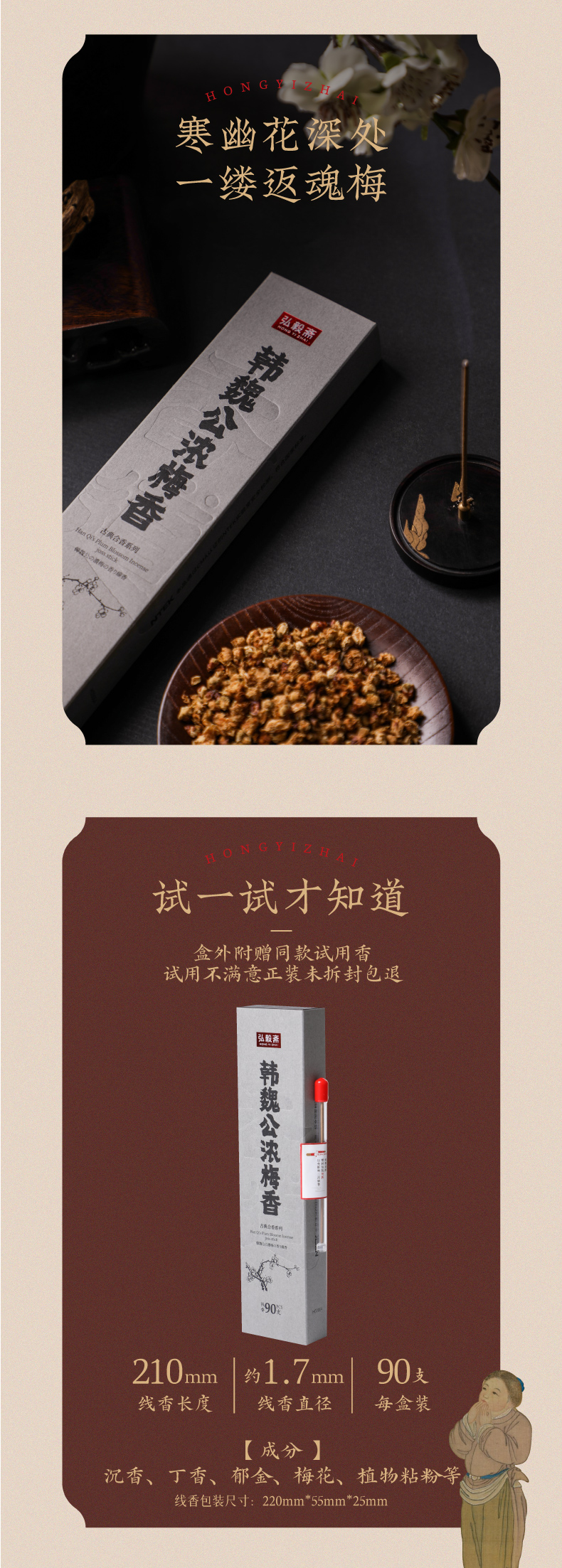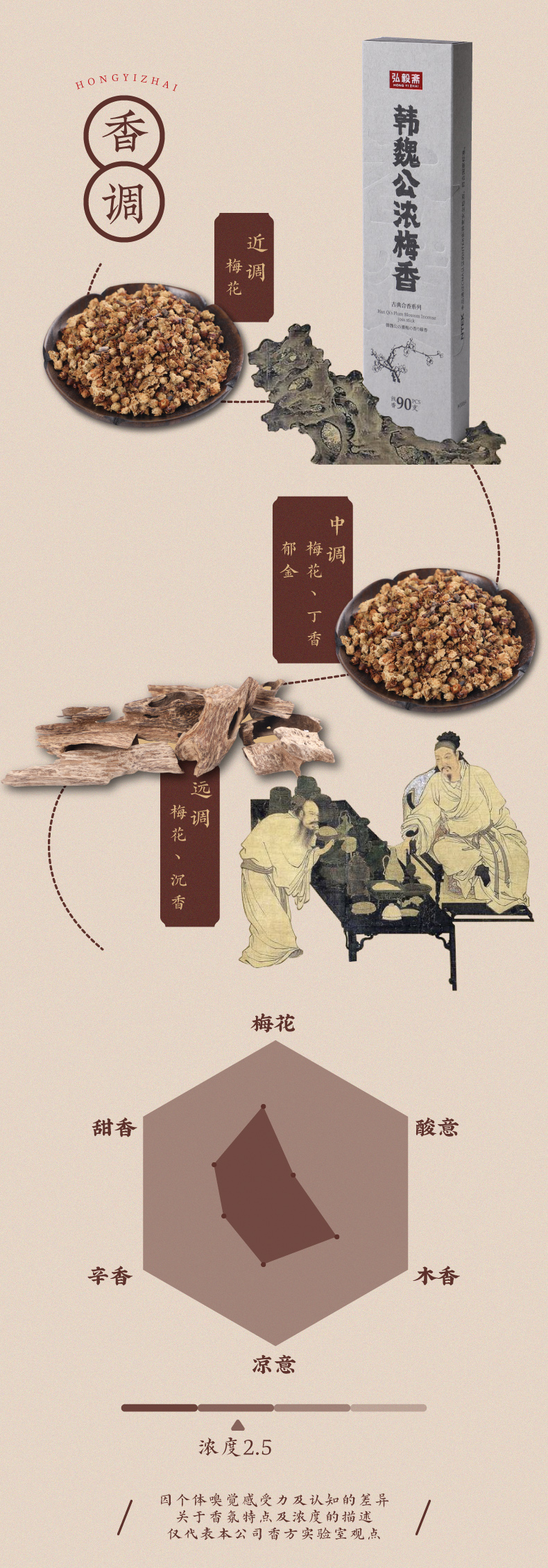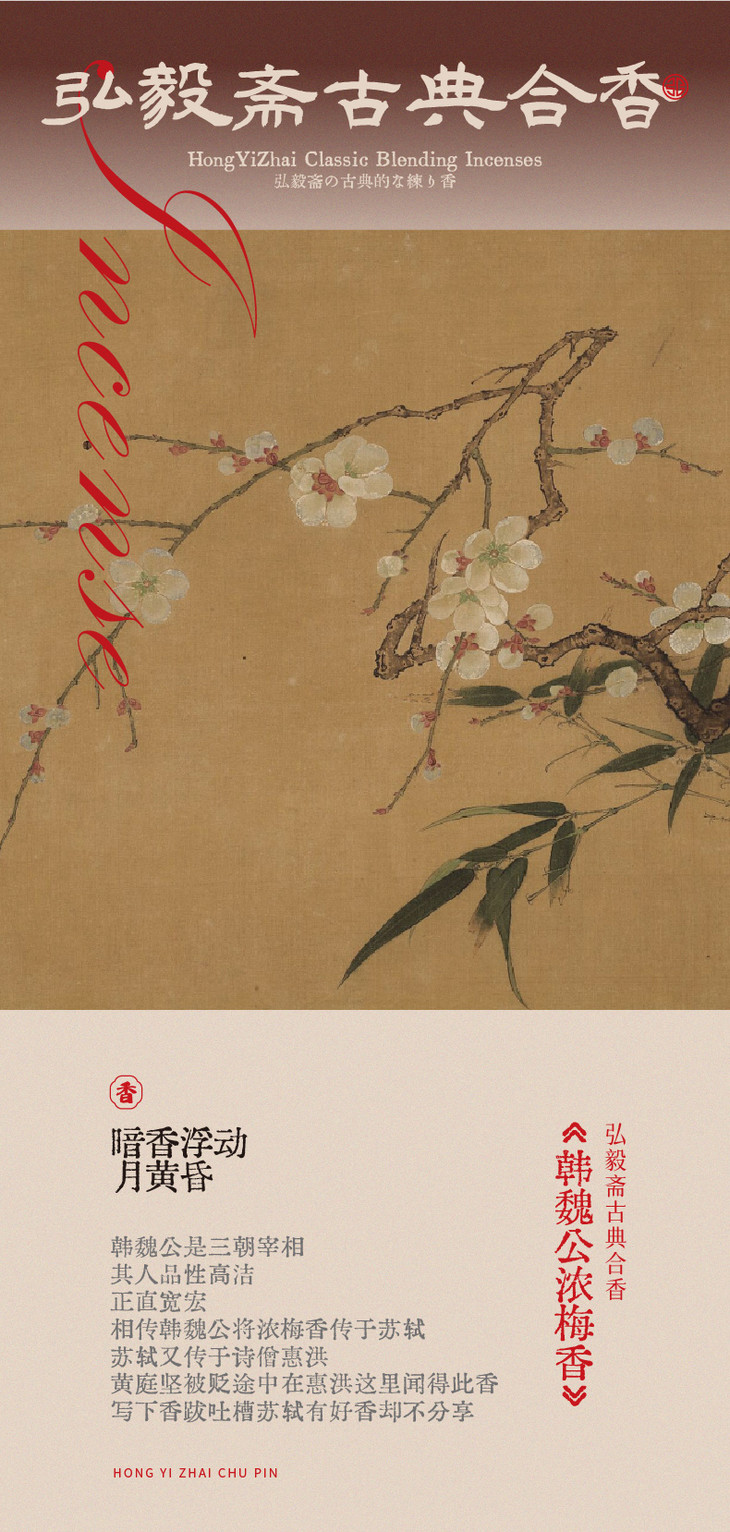 弘毅斋韩魏公浓梅香,香气中有梅花的甜凉幽香;弃用麝香,以梅花、丁香、郁金的和合,表现缺失的梅花的旖旎香韵,适用人群更广泛;