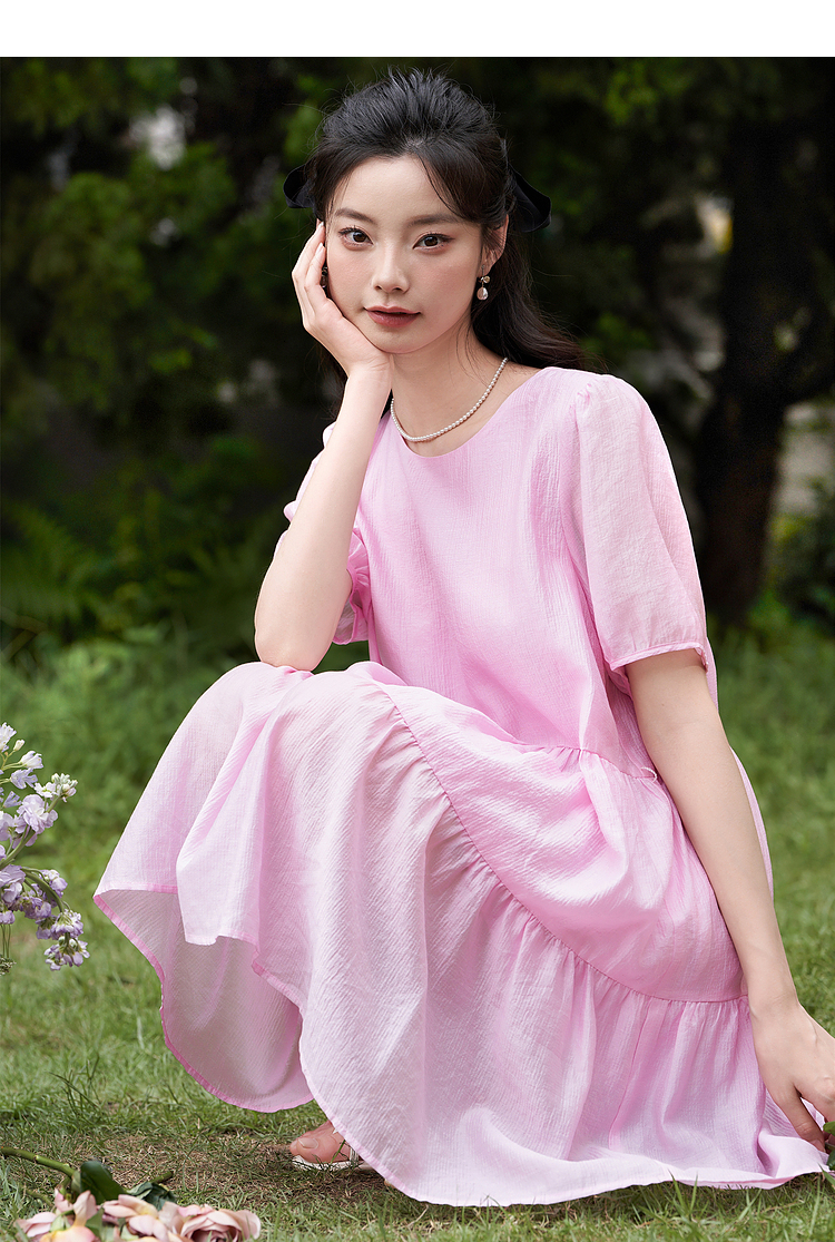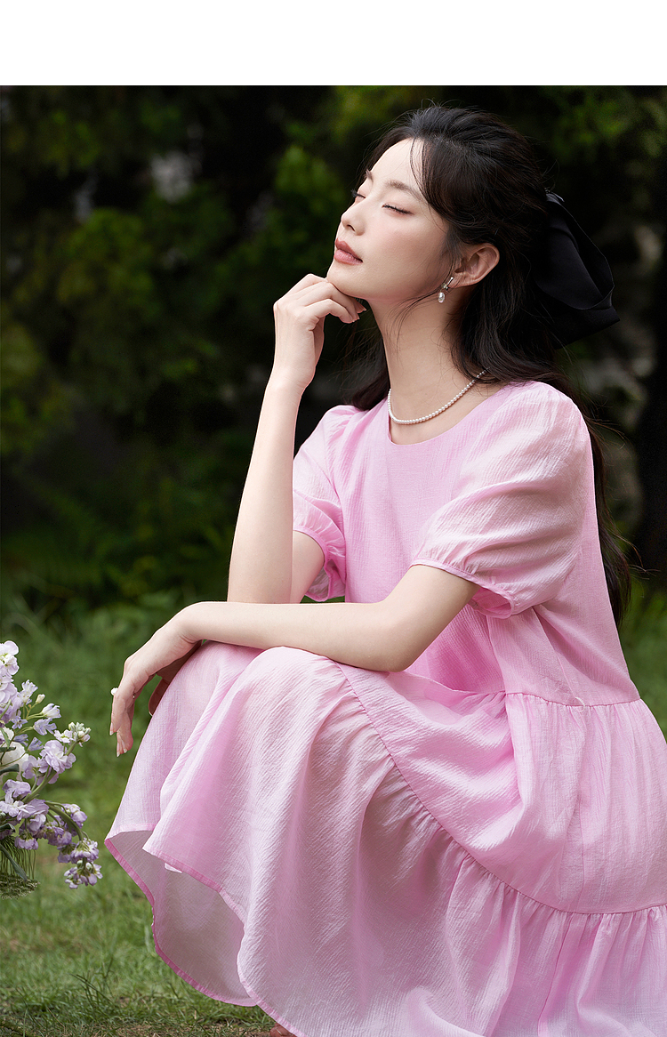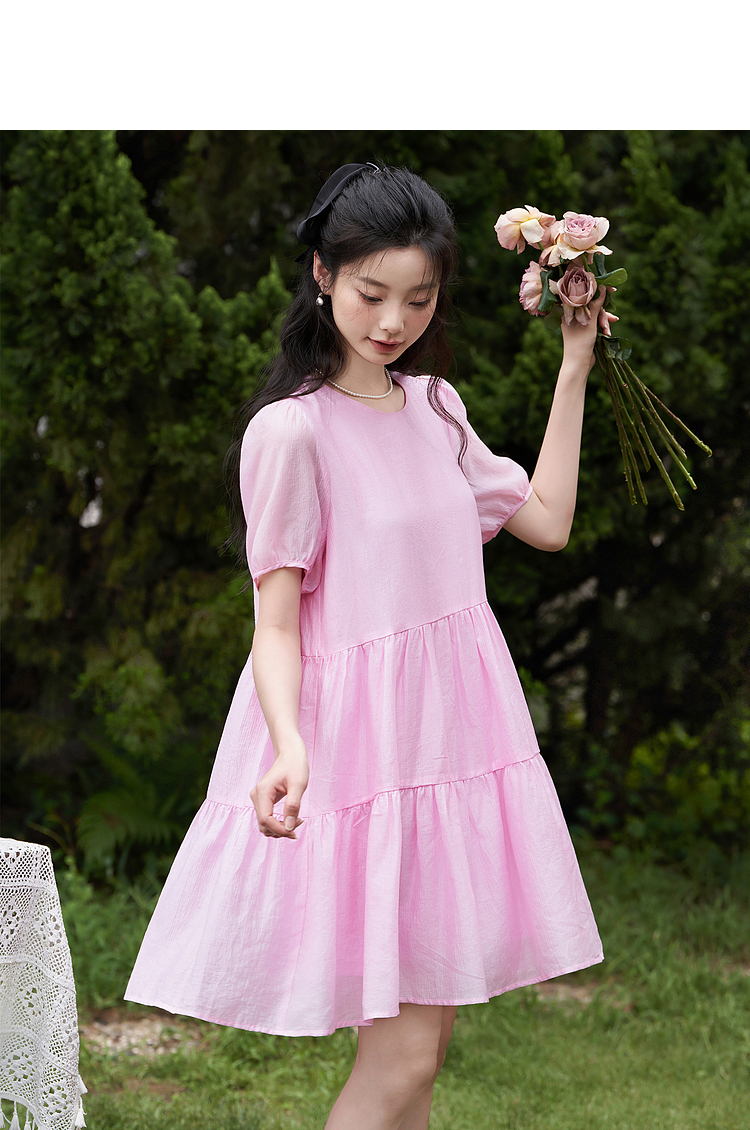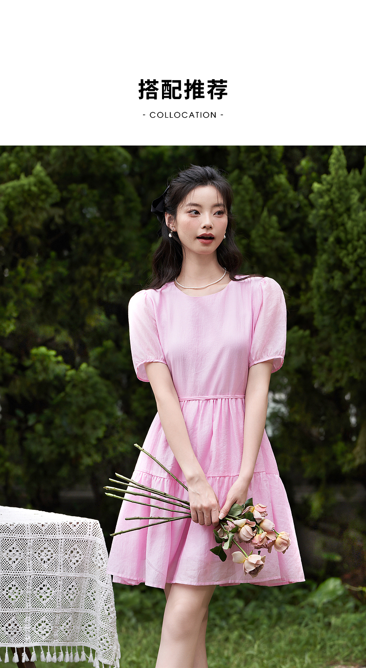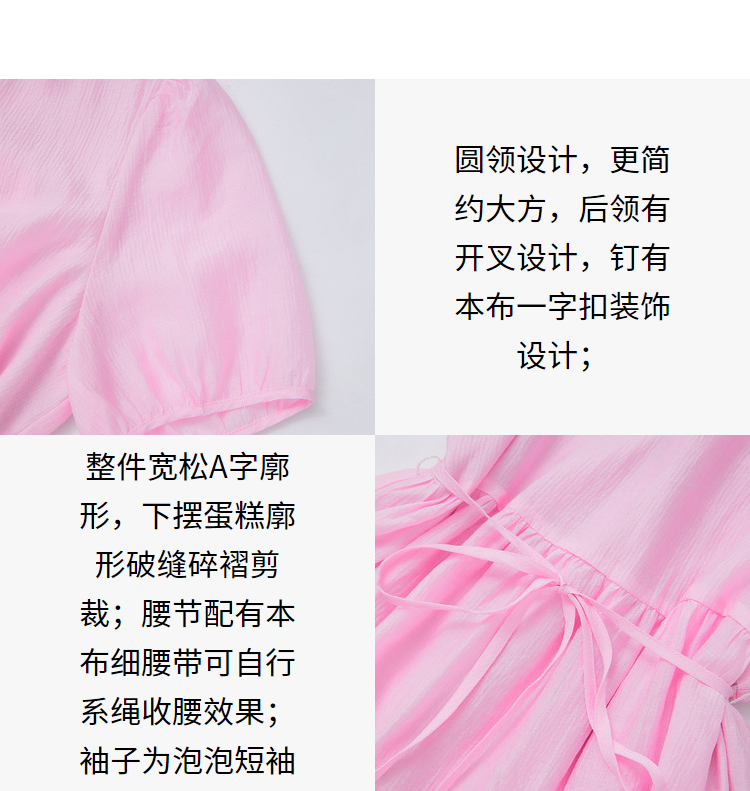 度假风简约甜美泡泡袖蛋糕裙女夏季后领开叉设计感连衣裙V1441226