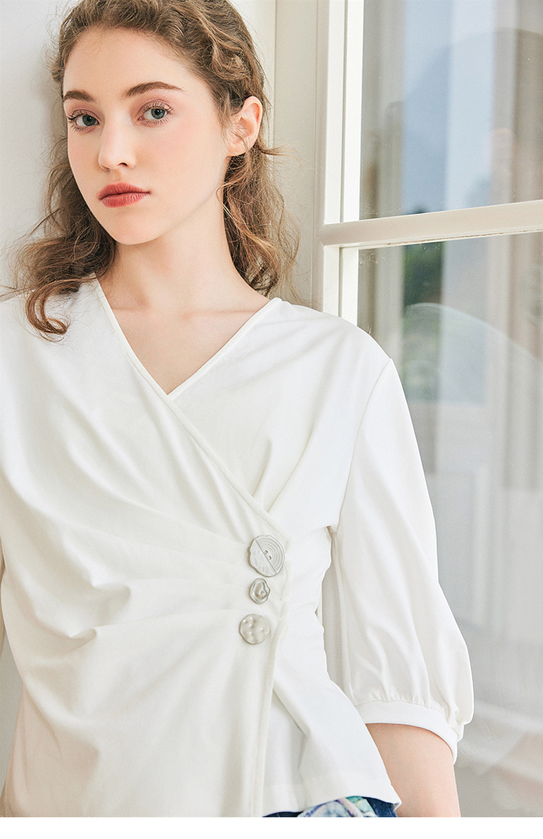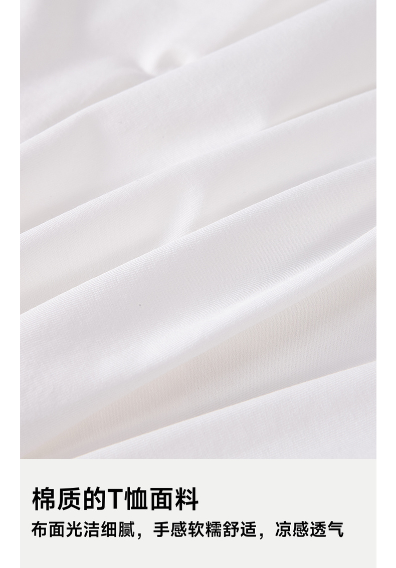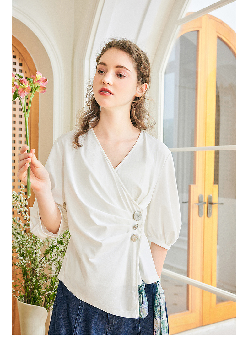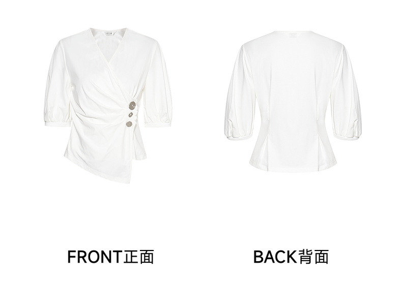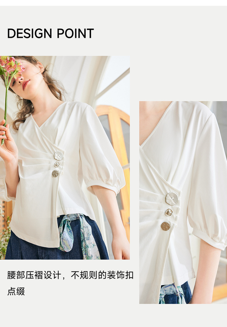 两三事 风的涟漪 2024夏季新款简约纽扣装饰不对称下摆白色t恤女