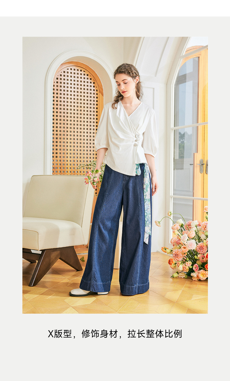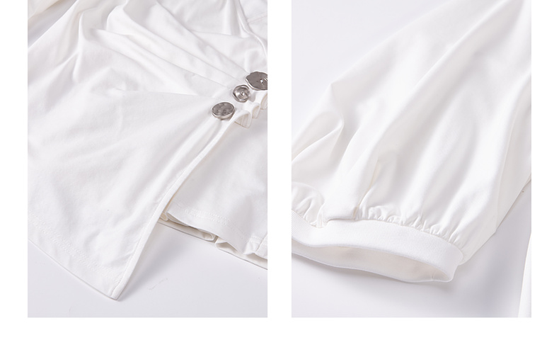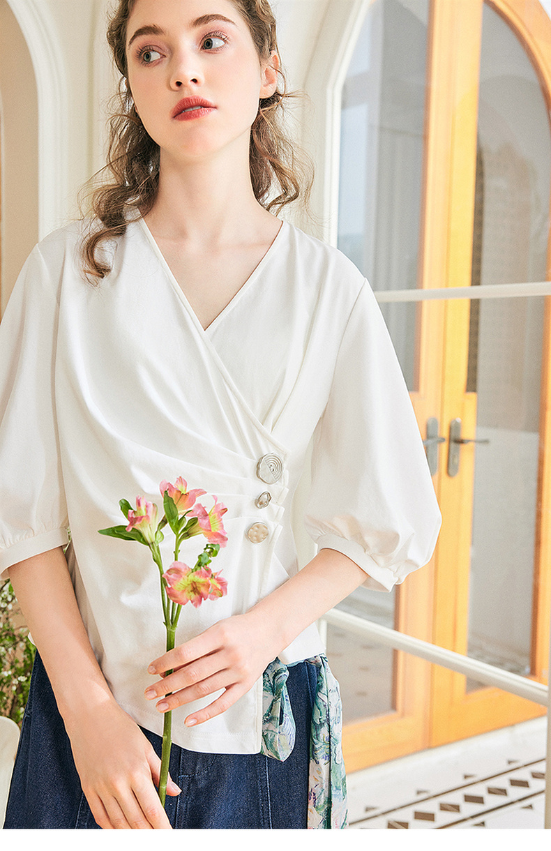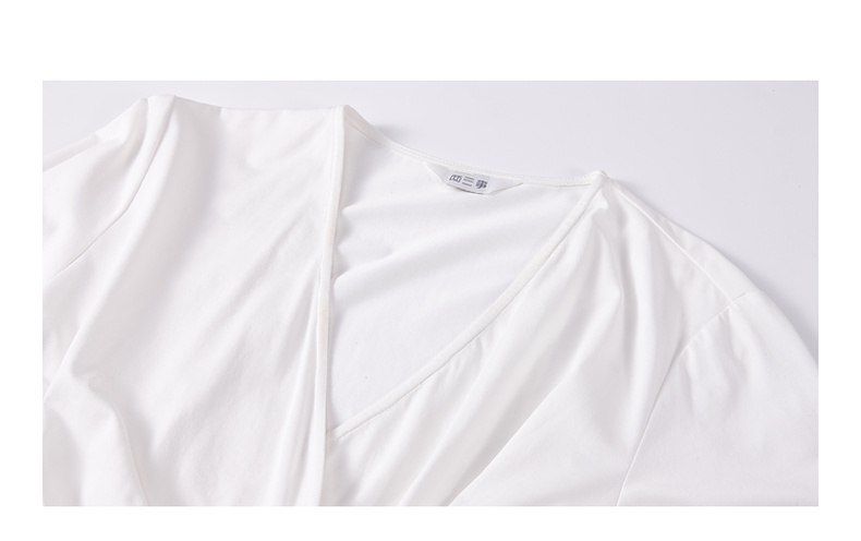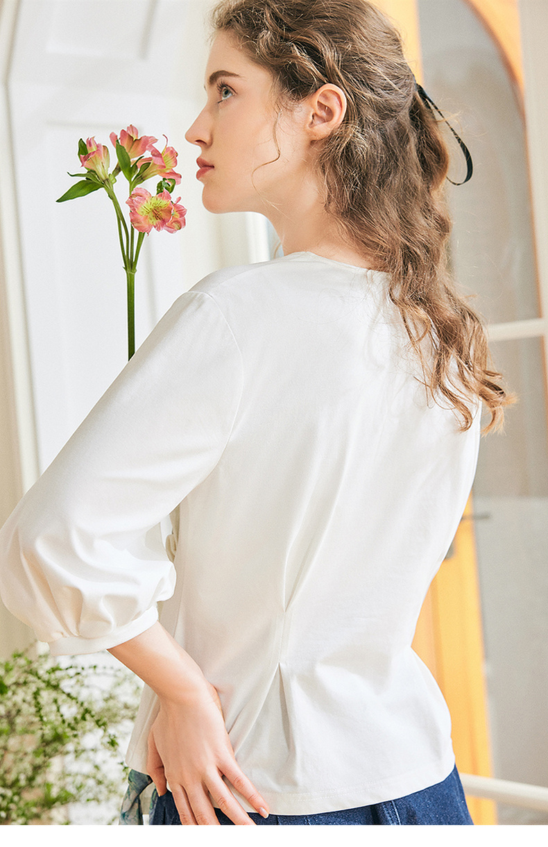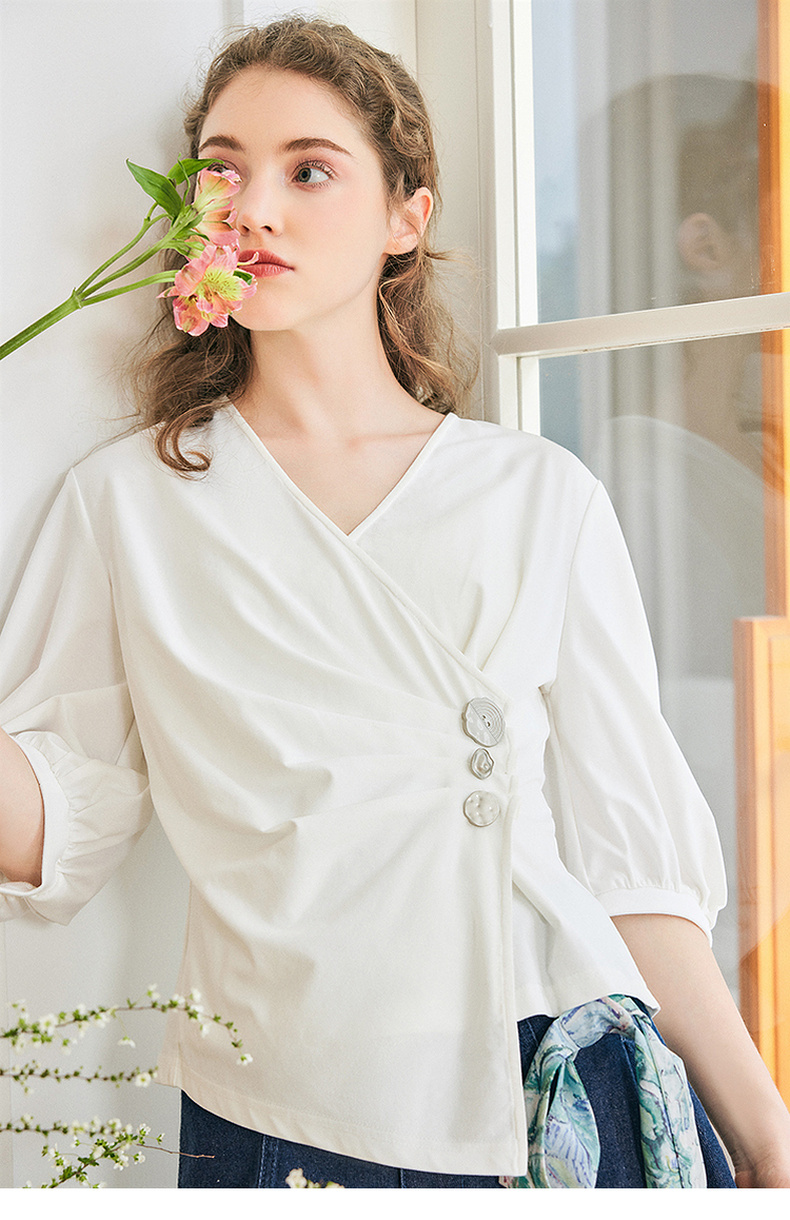 两三事 风的涟漪 2024夏季新款简约纽扣装饰不对称下摆白色t恤女