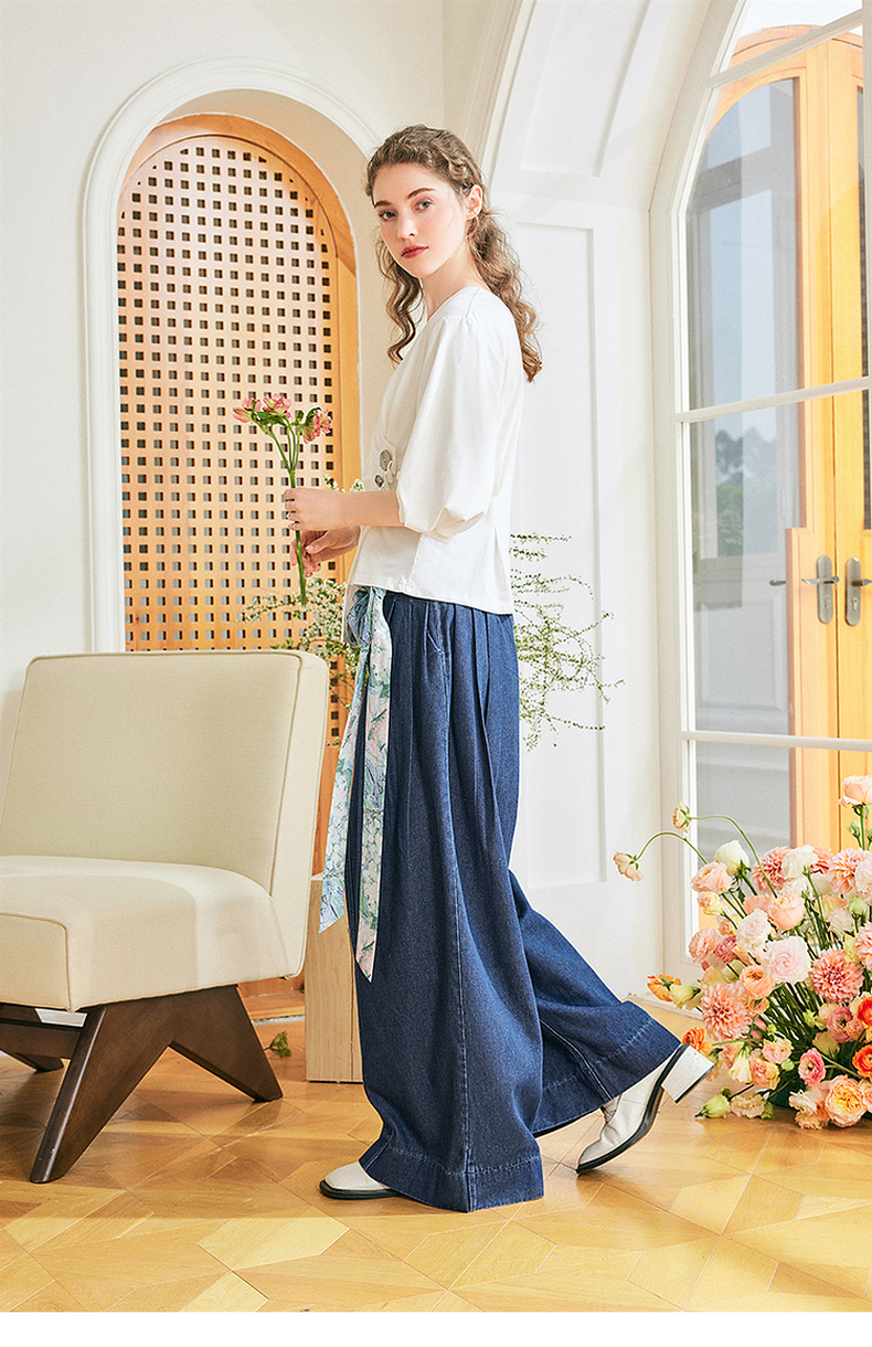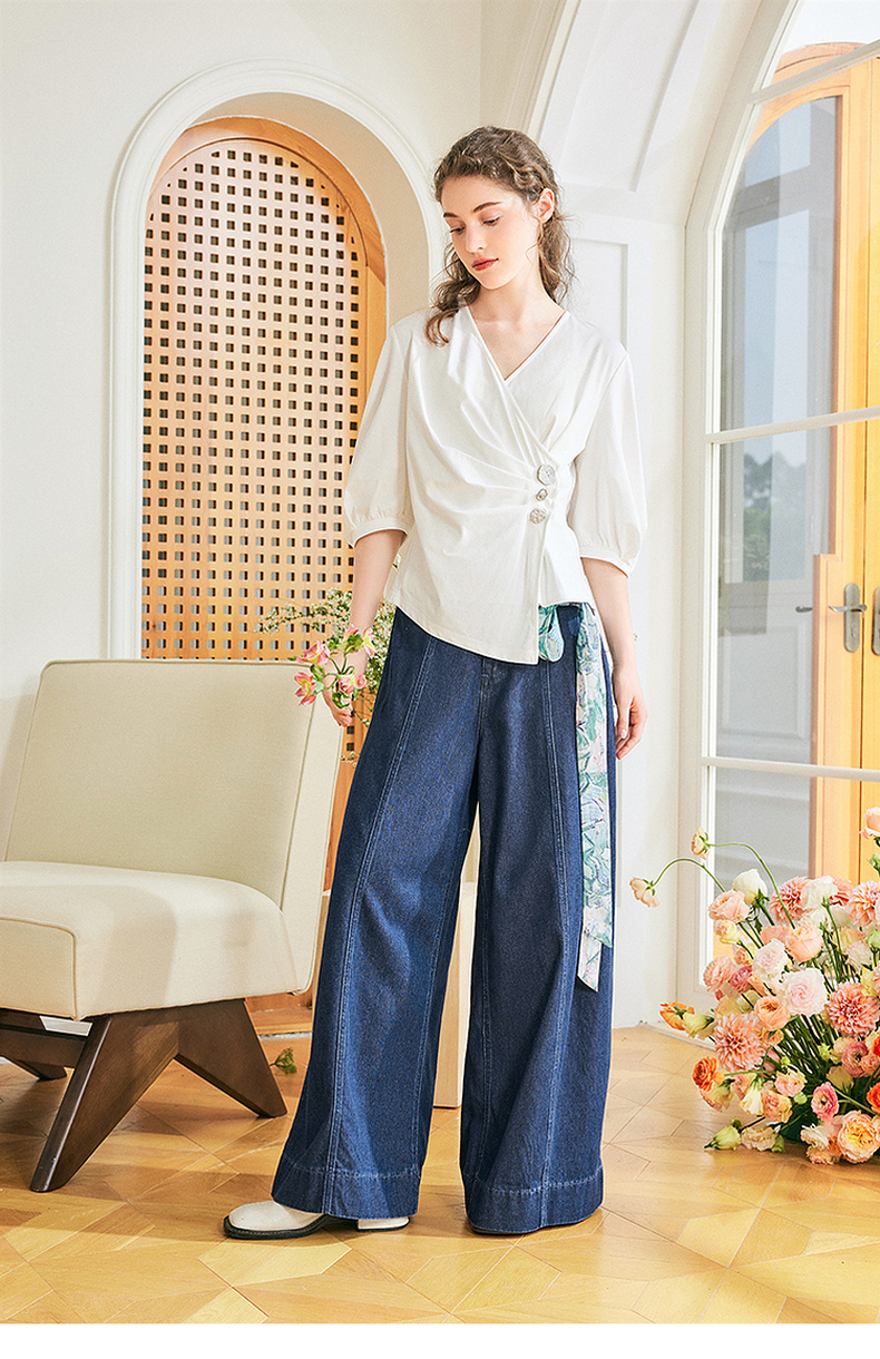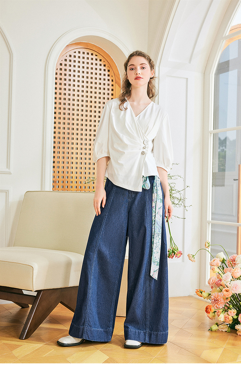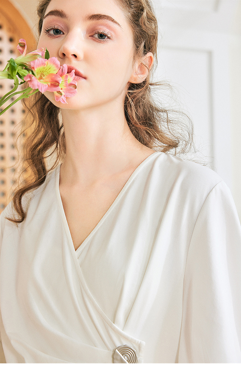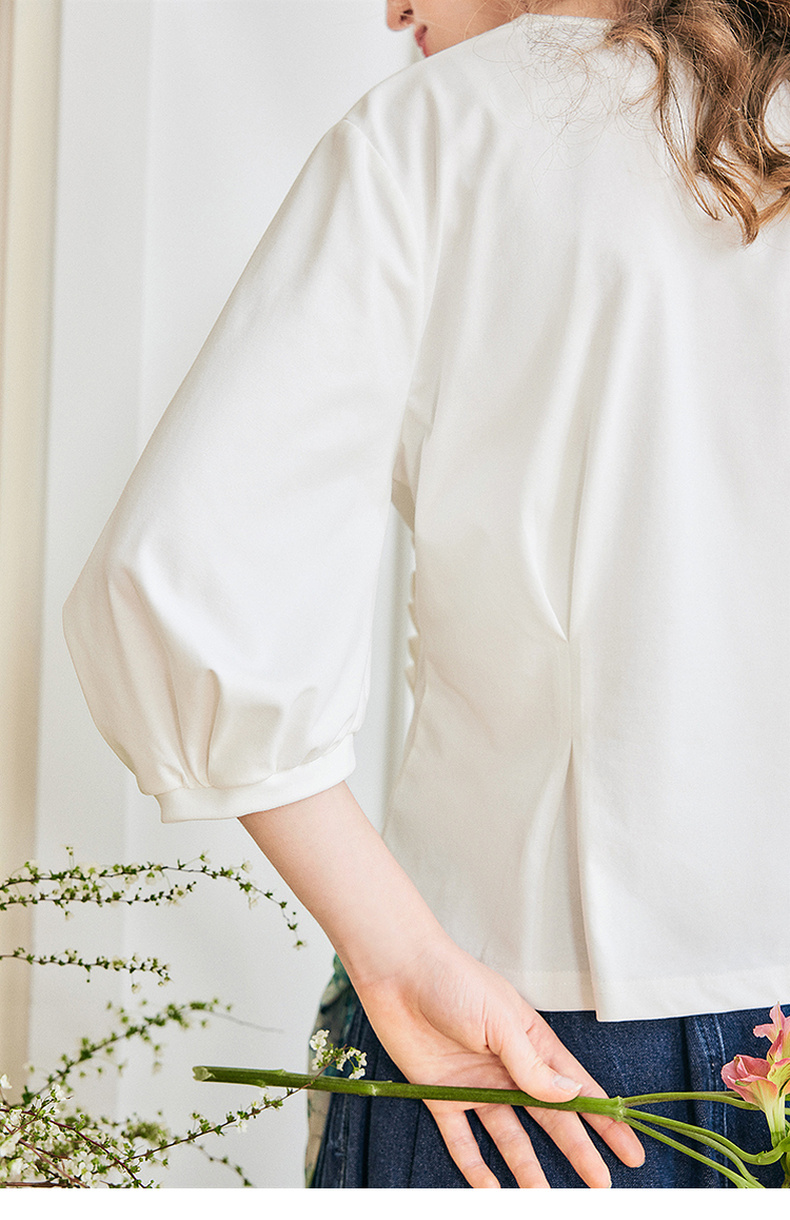 两三事 风的涟漪 2024夏季新款简约纽扣装饰不对称下摆白色t恤女