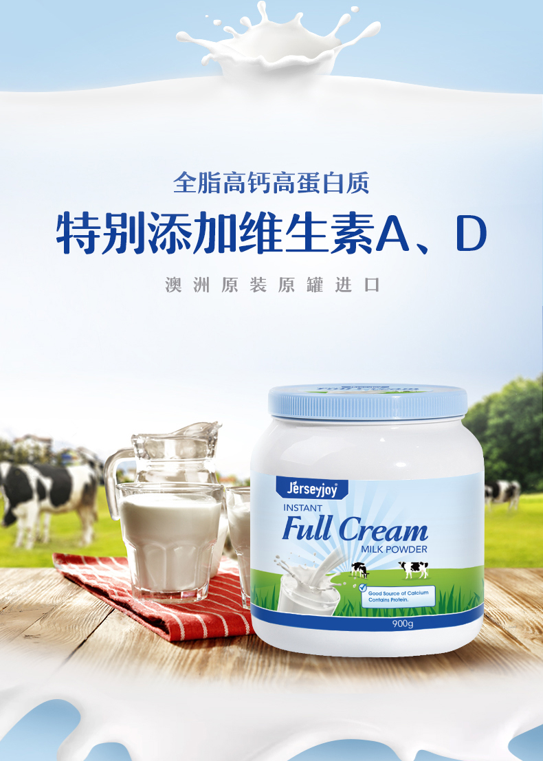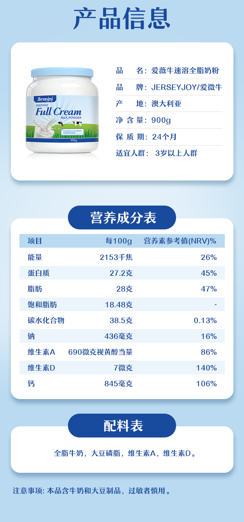 【保税仓】澳大利亚Jerseyjoy 爱薇牛速溶全脂奶粉(定制) 900g*1 (有效期至26年4月)
