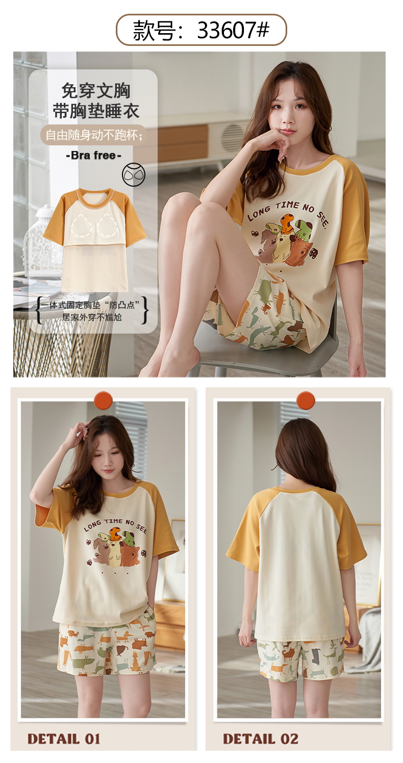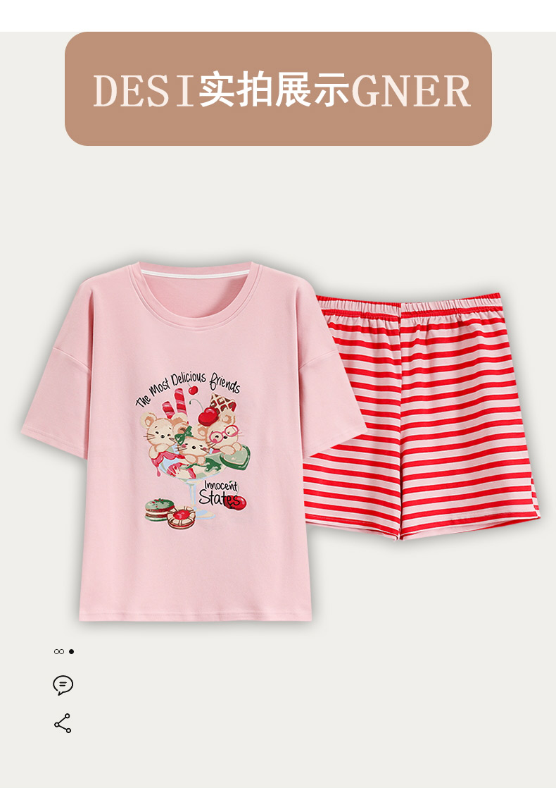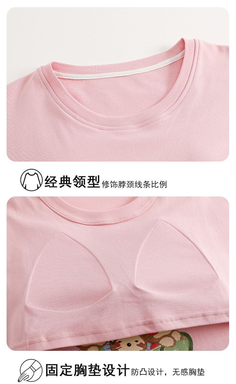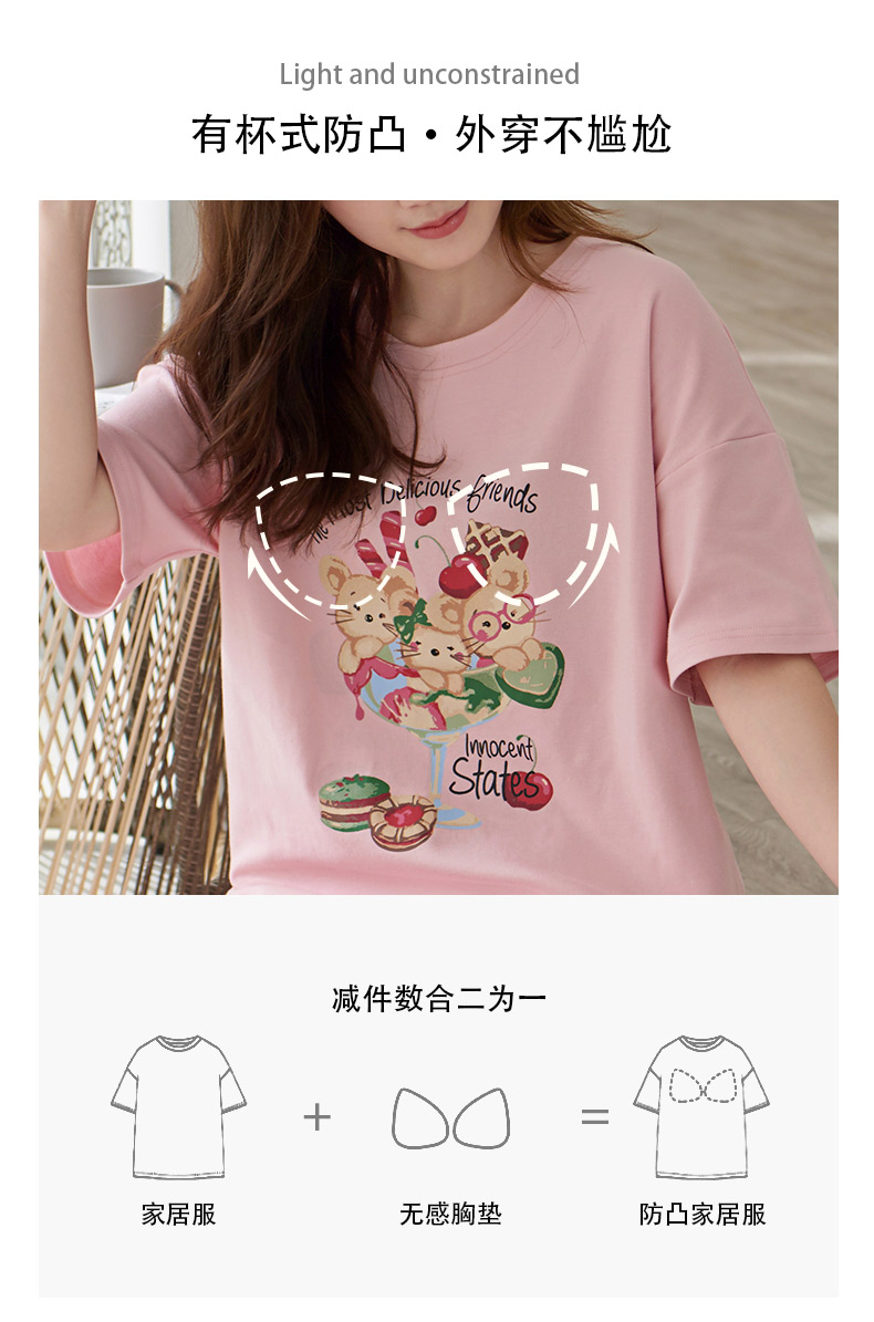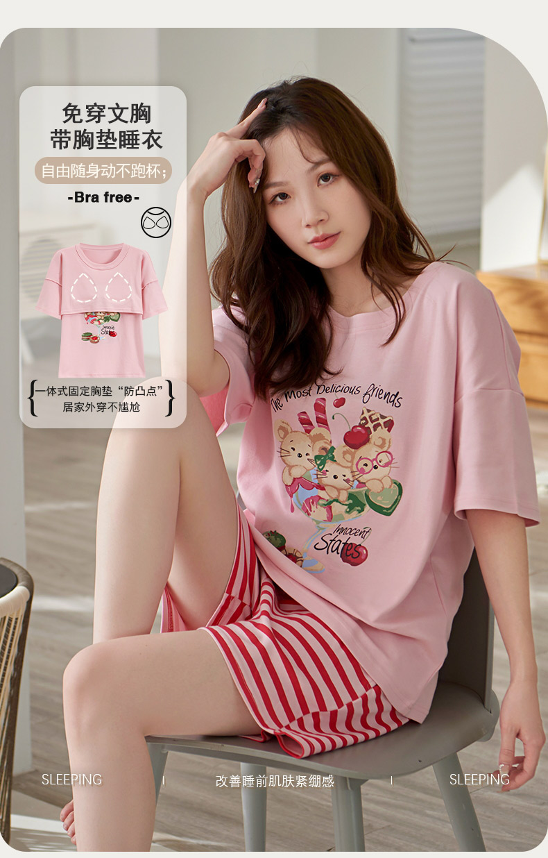 自然醒彩虹牛奶丝(带胸垫)一体睡衣女夏短袖薄款韩范甜美休闲可外穿家居服QH