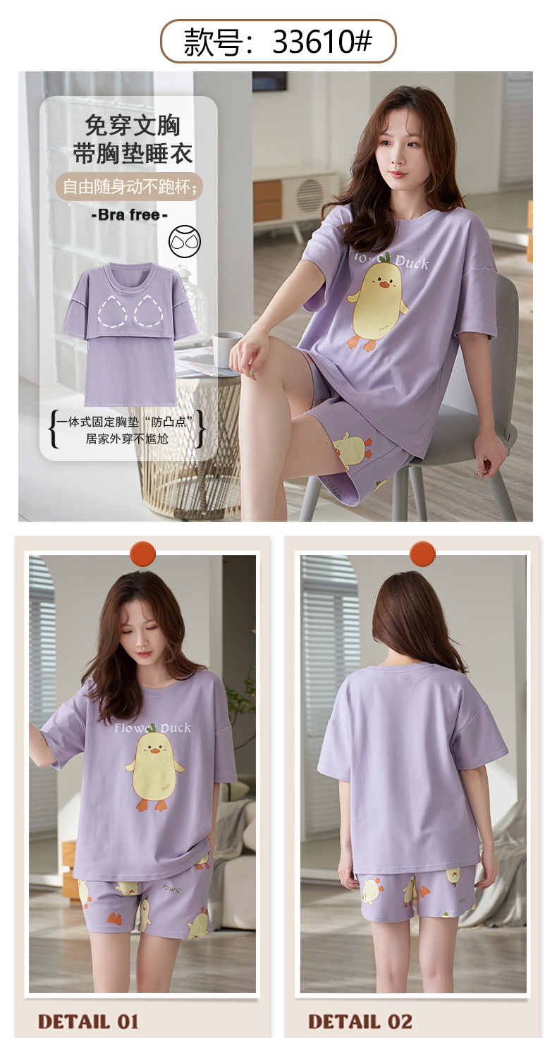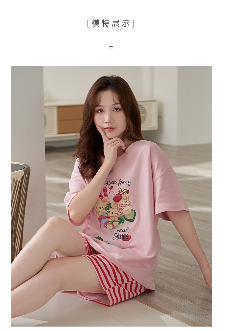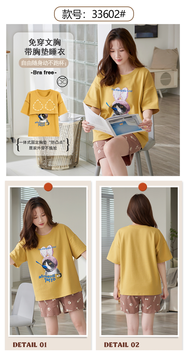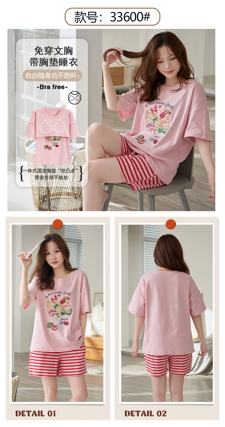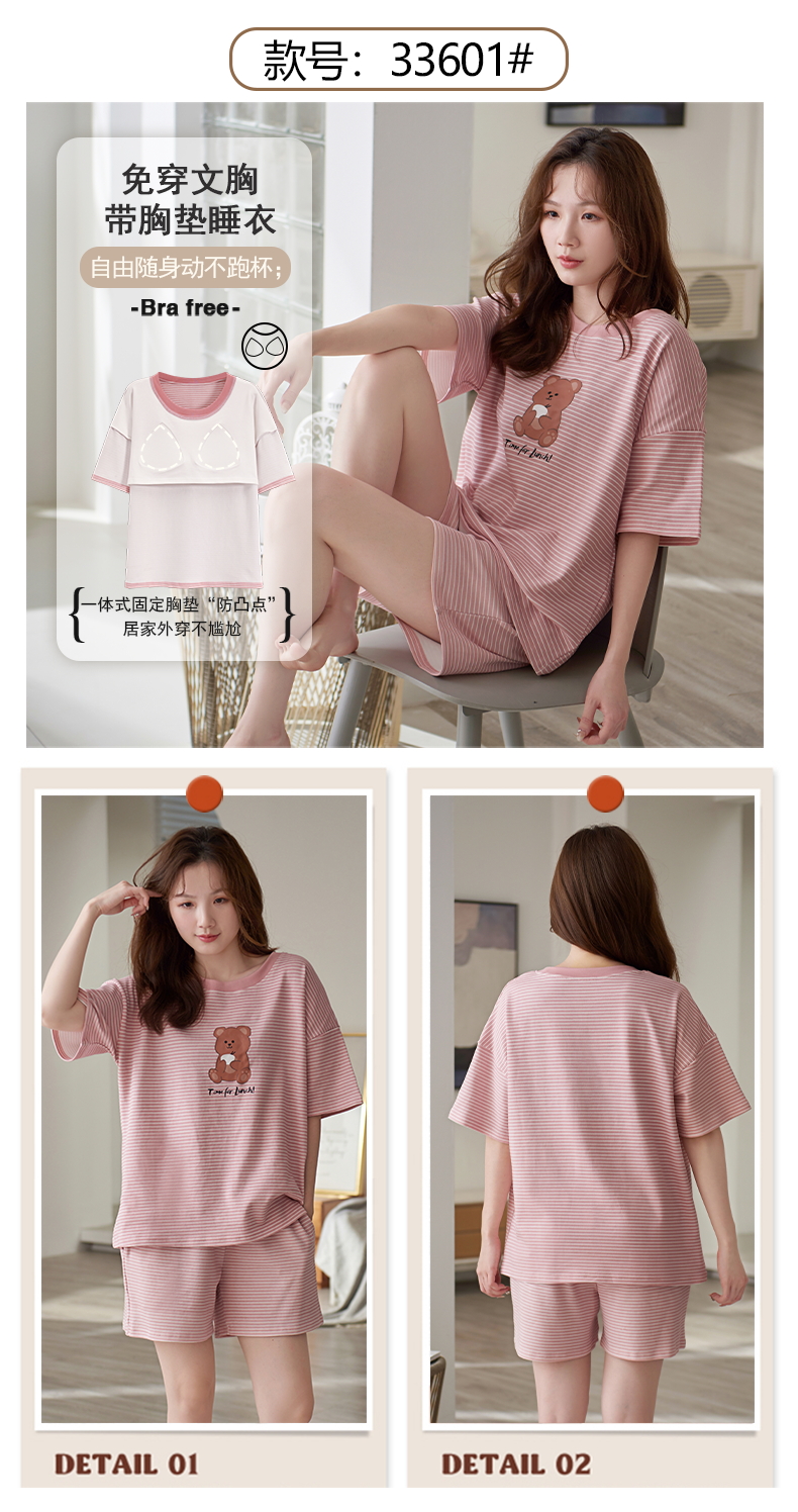 自然醒彩虹牛奶丝(带胸垫)一体睡衣女夏短袖薄款韩范甜美休闲可外穿家居服QH