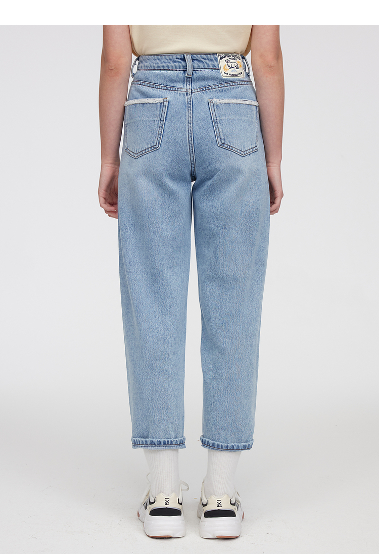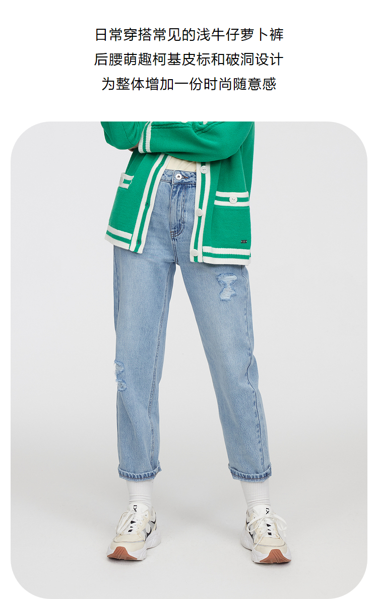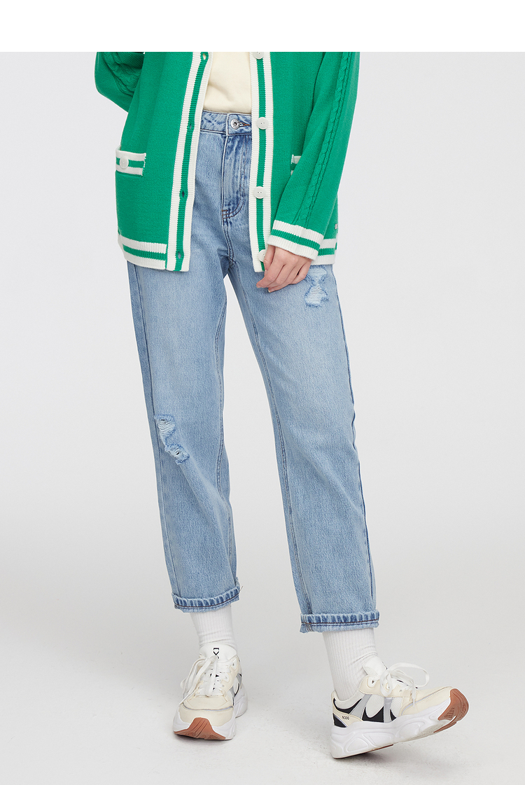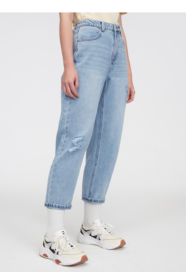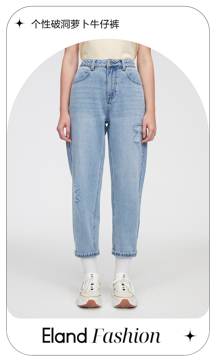 ELAND衣恋2022年春季新款高腰宽松设计感磨毛破洞牛仔裤萝卜裤女EETJC23Q1N