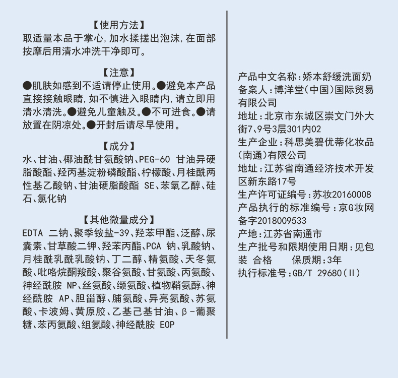 娇本舒缓温和洗面奶