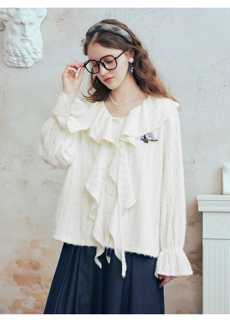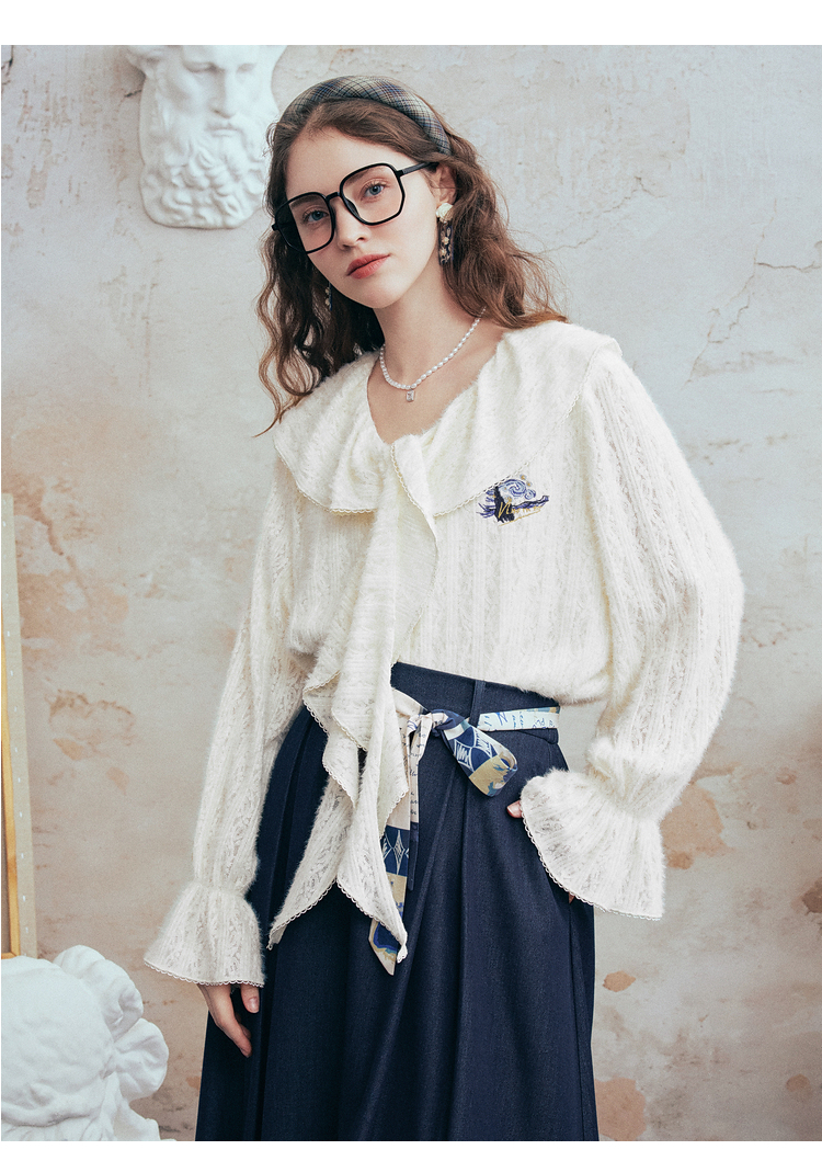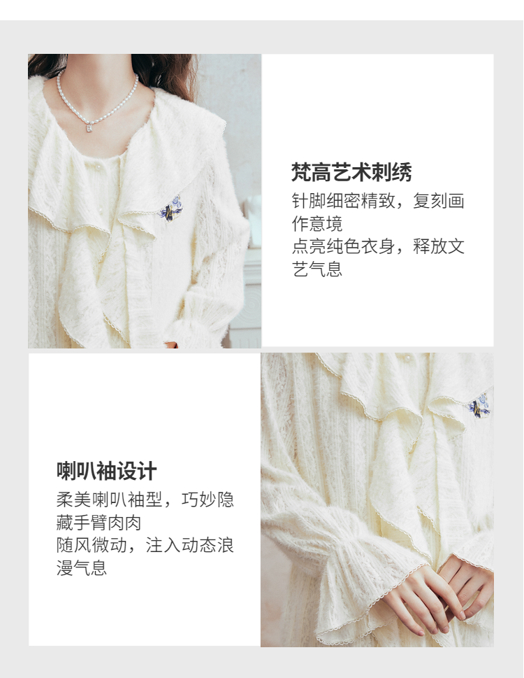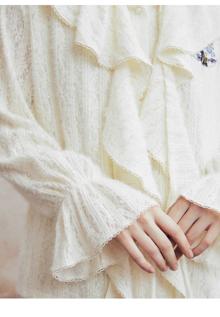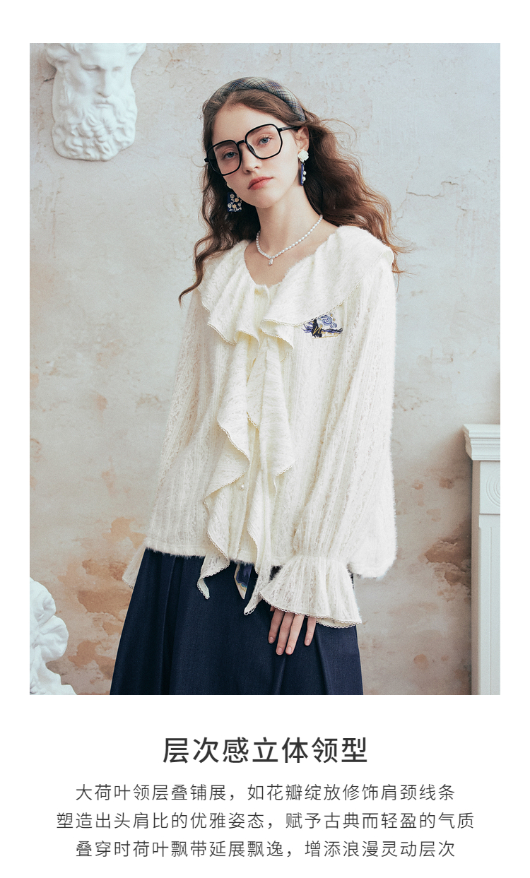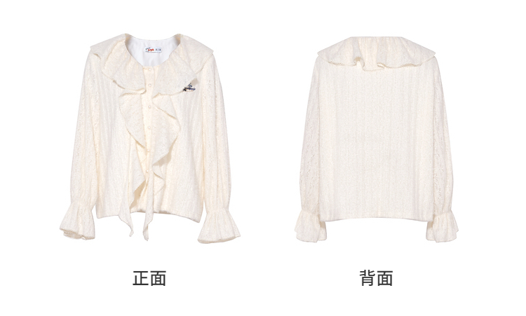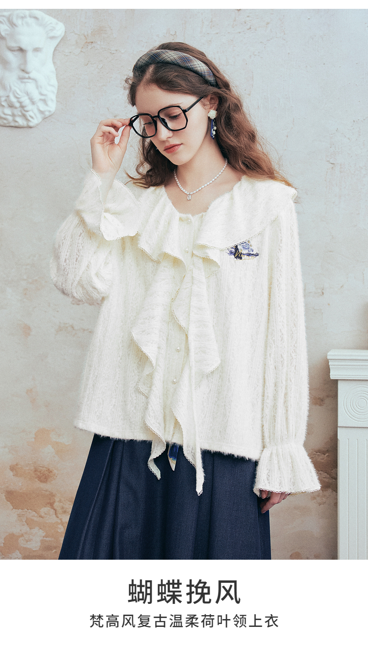 两三事梵高文艺蝴蝶挽风2026春新款甜美绣花荷叶边领蕾丝衫女宽松