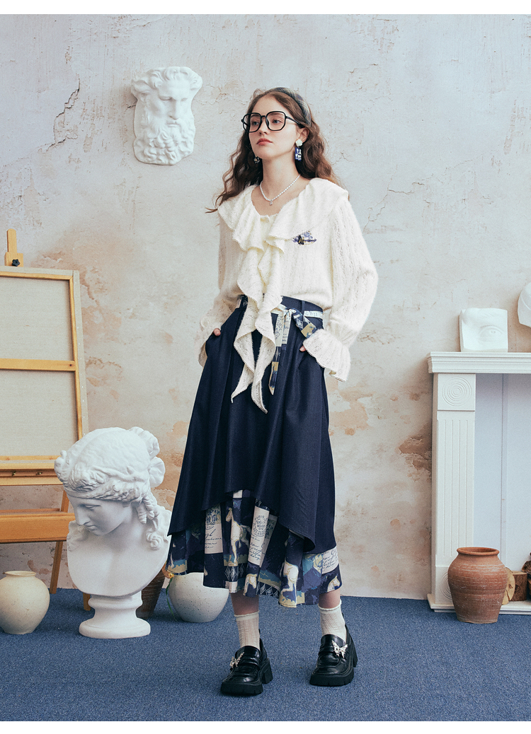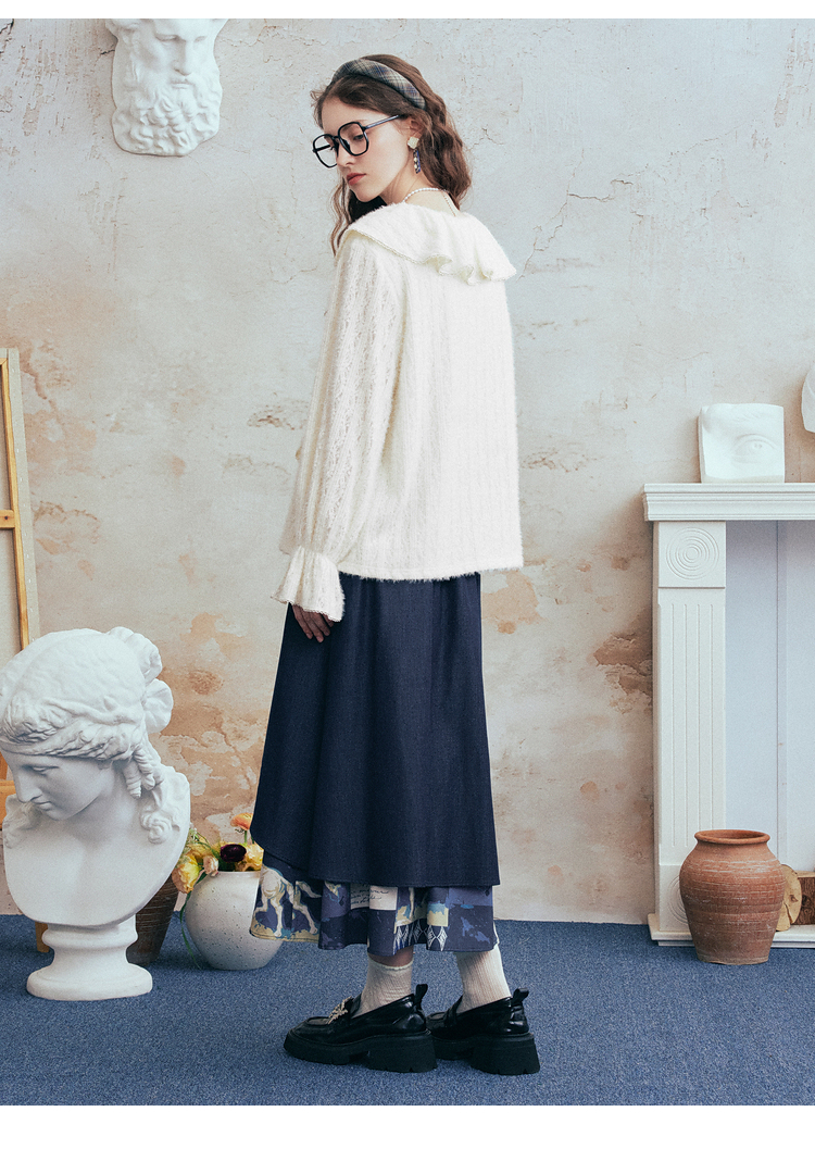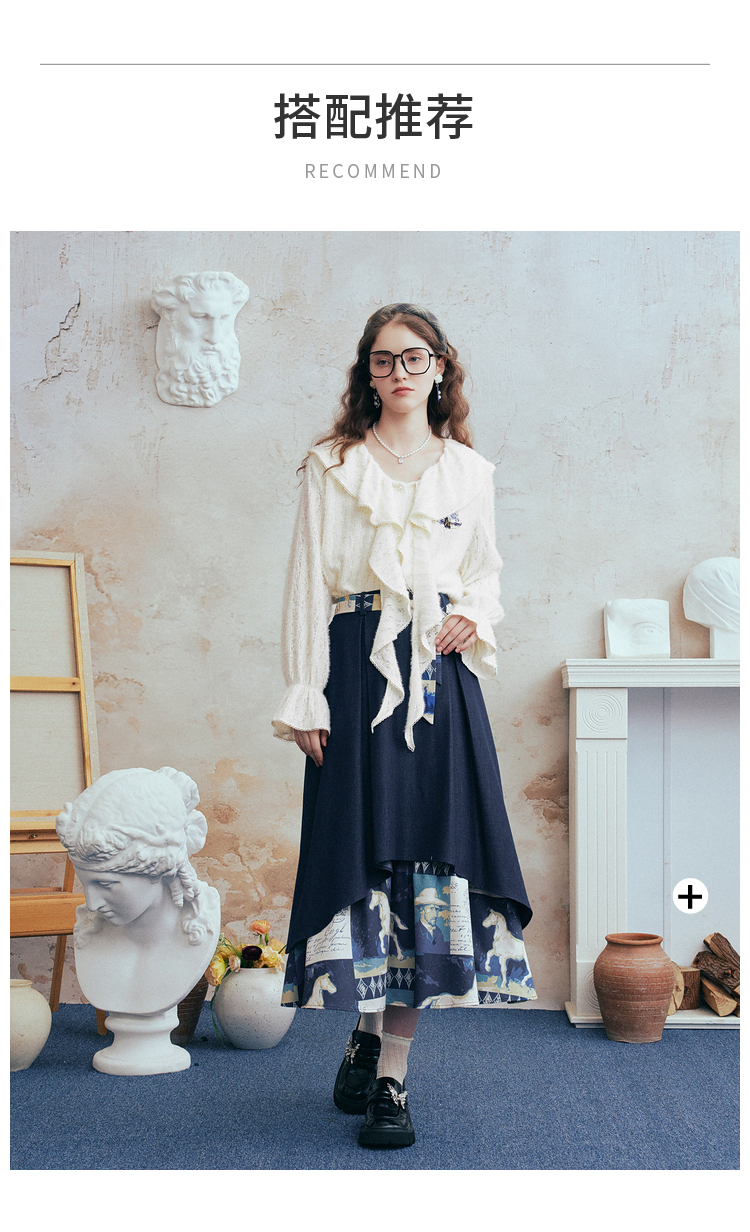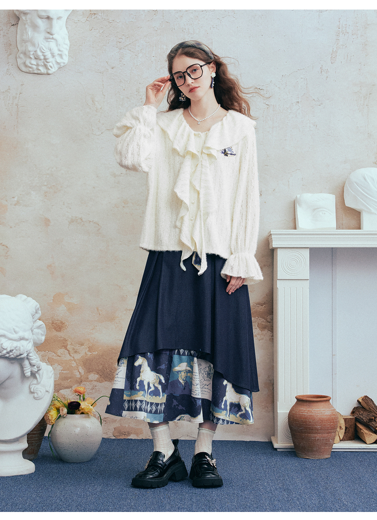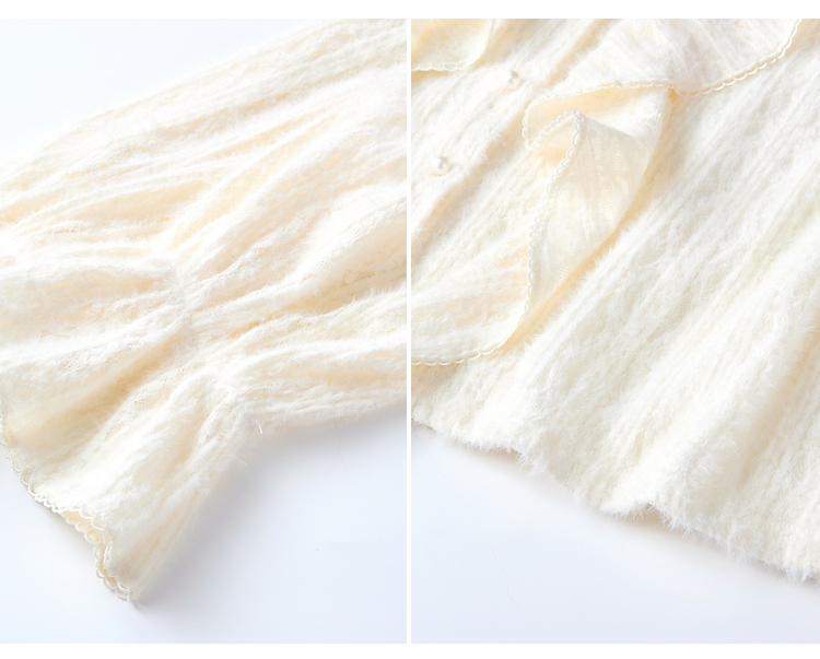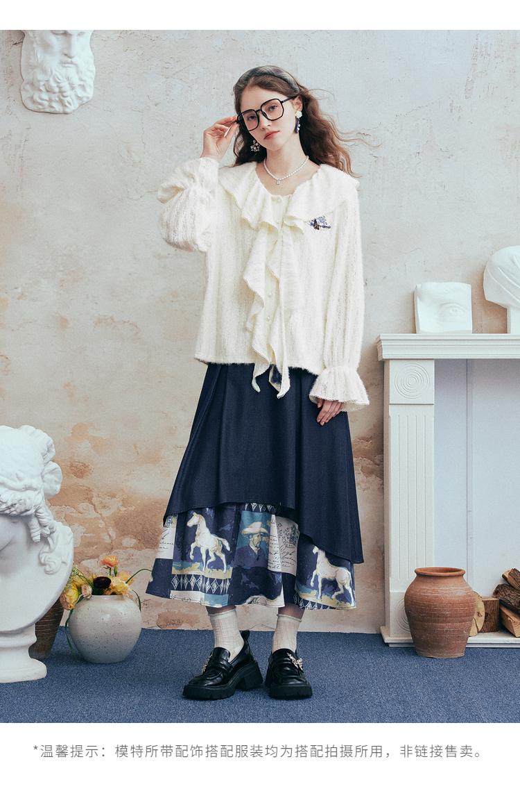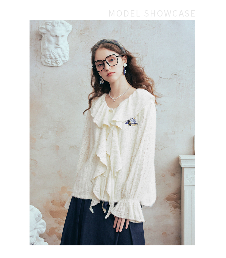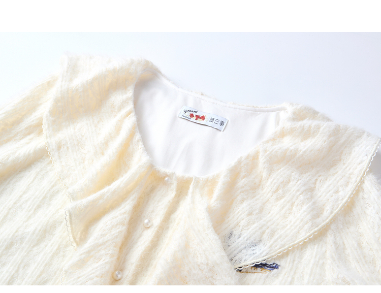 两三事梵高文艺蝴蝶挽风2026春新款甜美绣花荷叶边领蕾丝衫女宽松