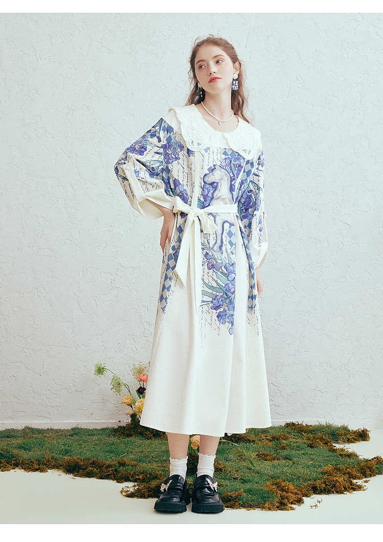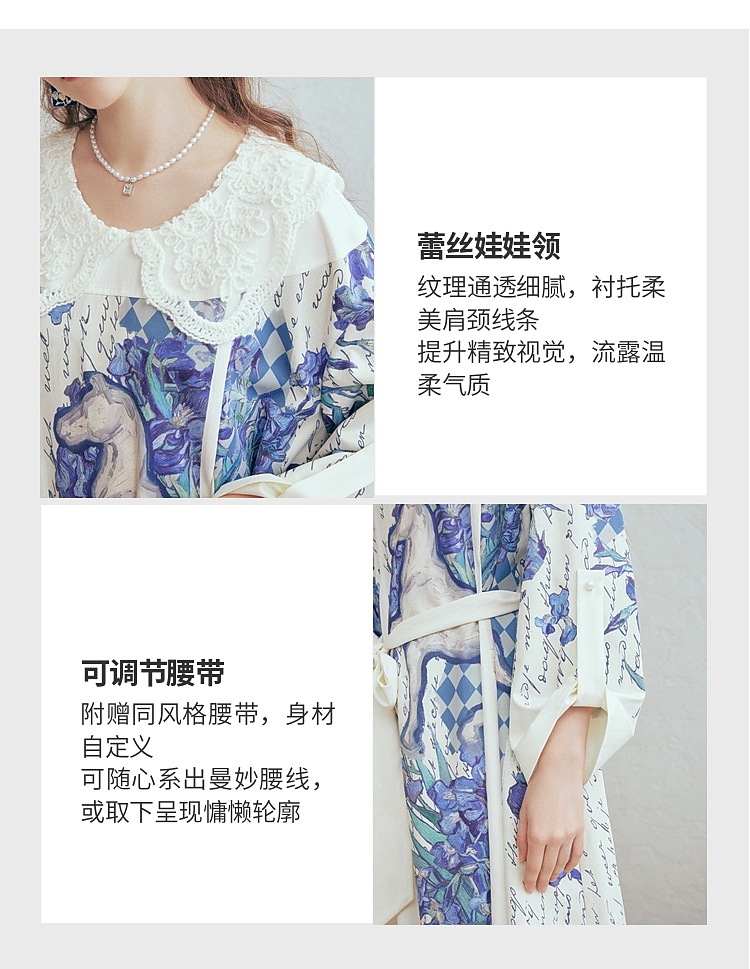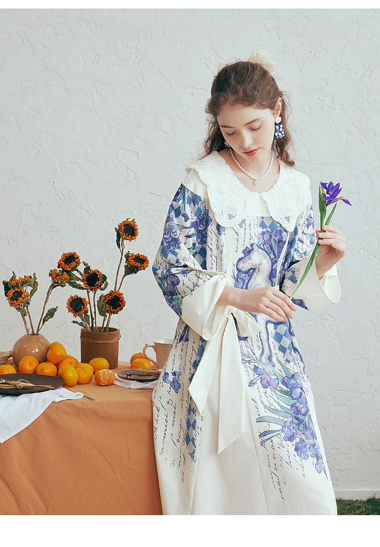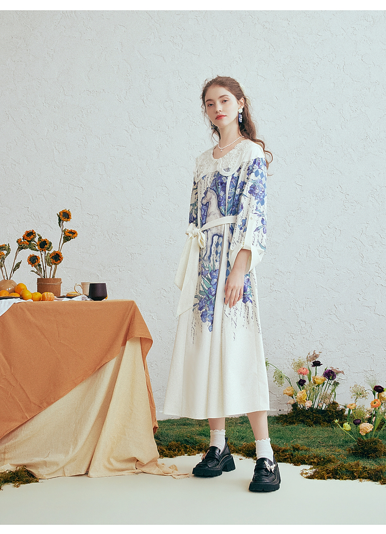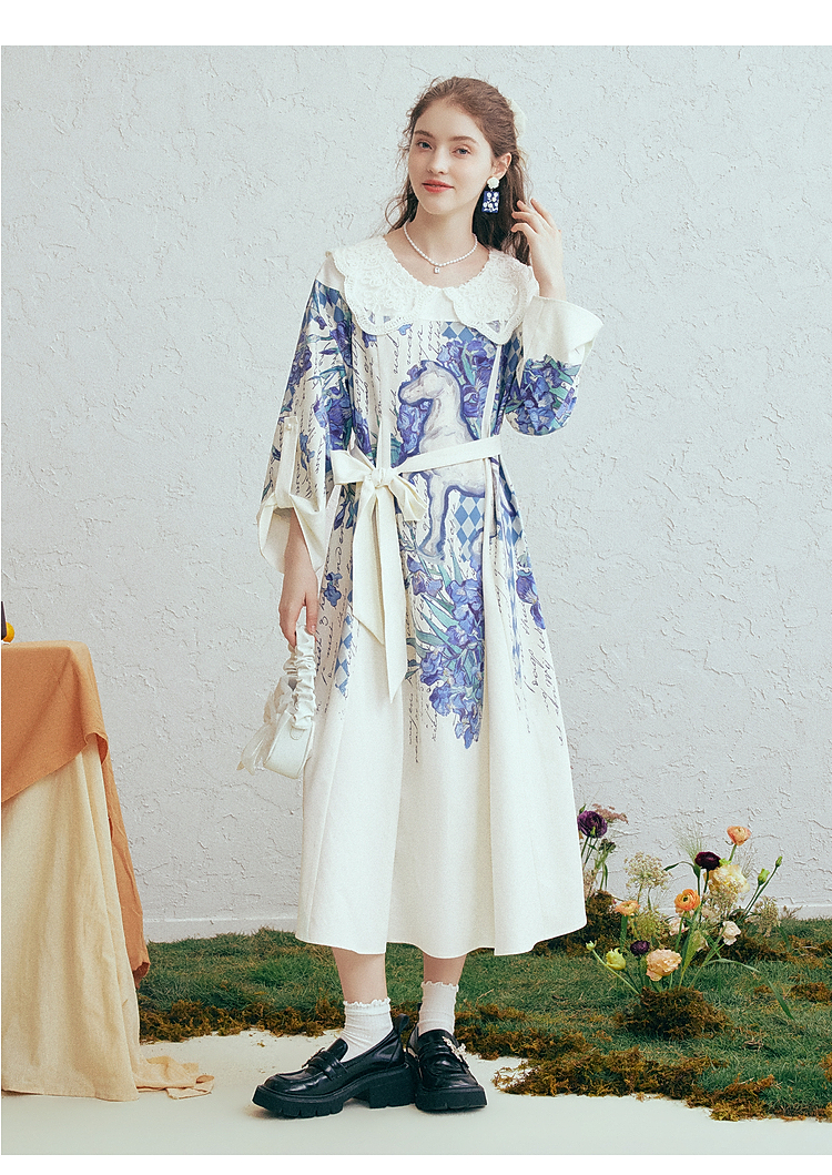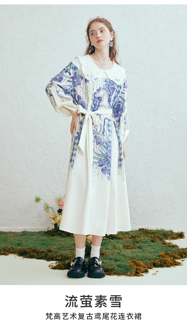 两三事梵高文艺 流萤素雪 2026春季新款蕾丝翻领印花绑带连衣裙