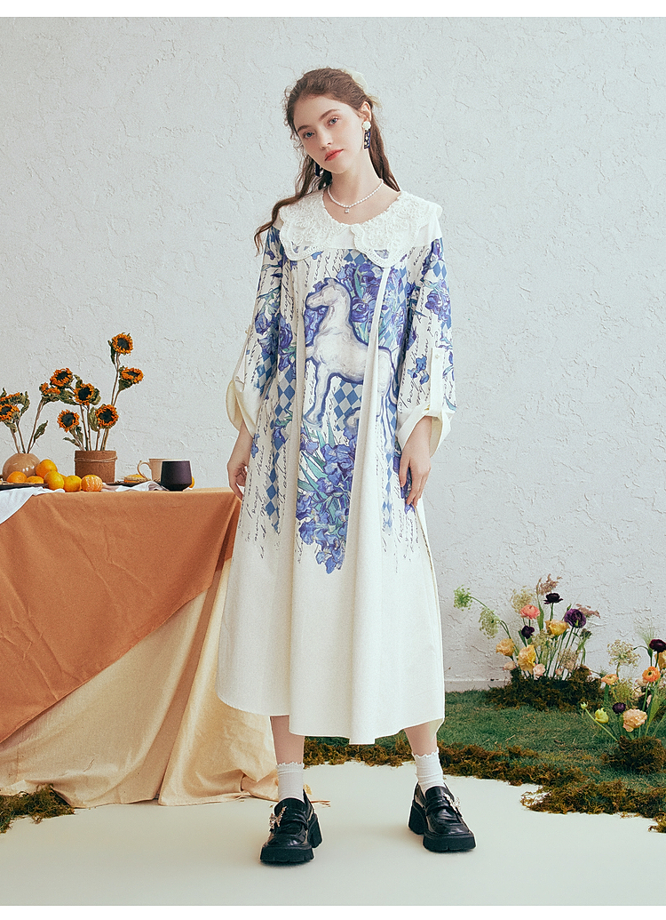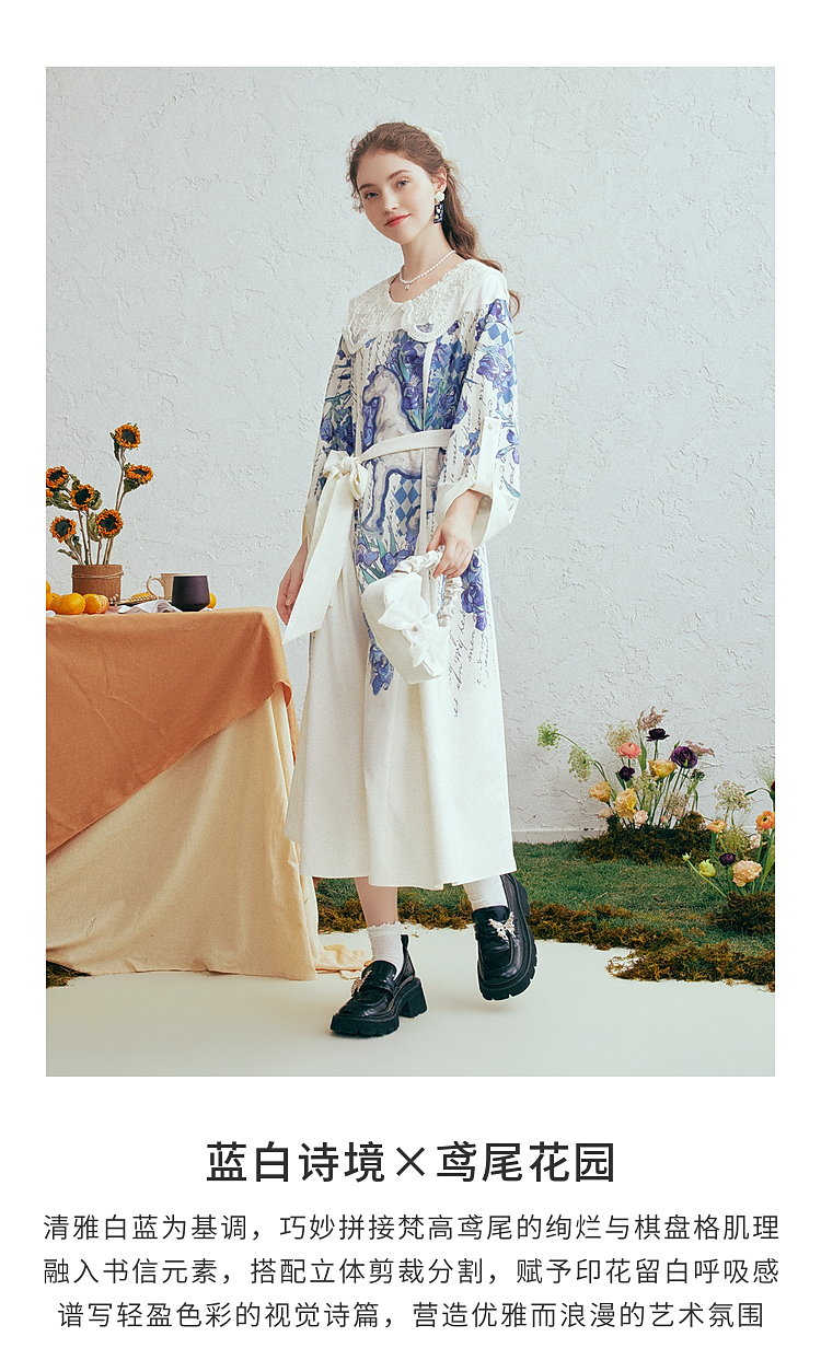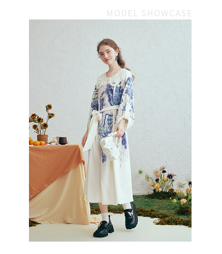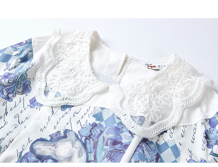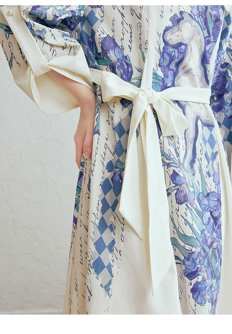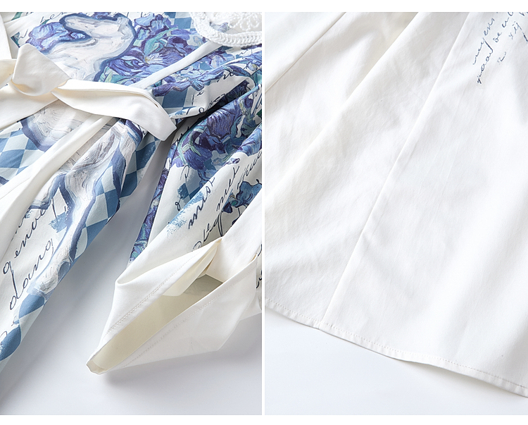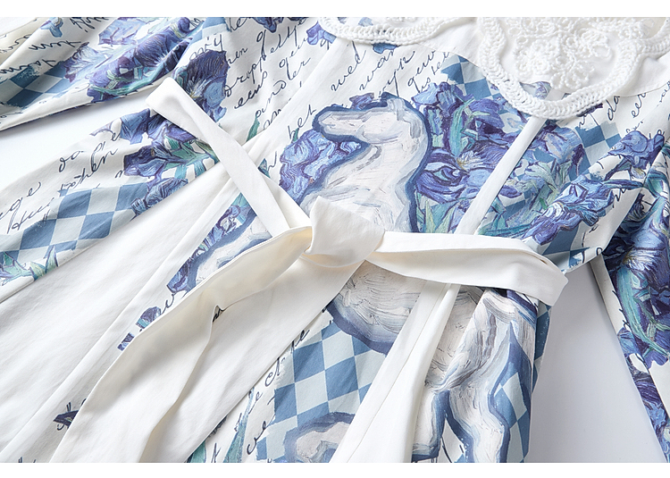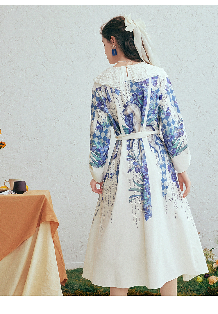 两三事梵高文艺 流萤素雪 2026春季新款蕾丝翻领印花绑带连衣裙