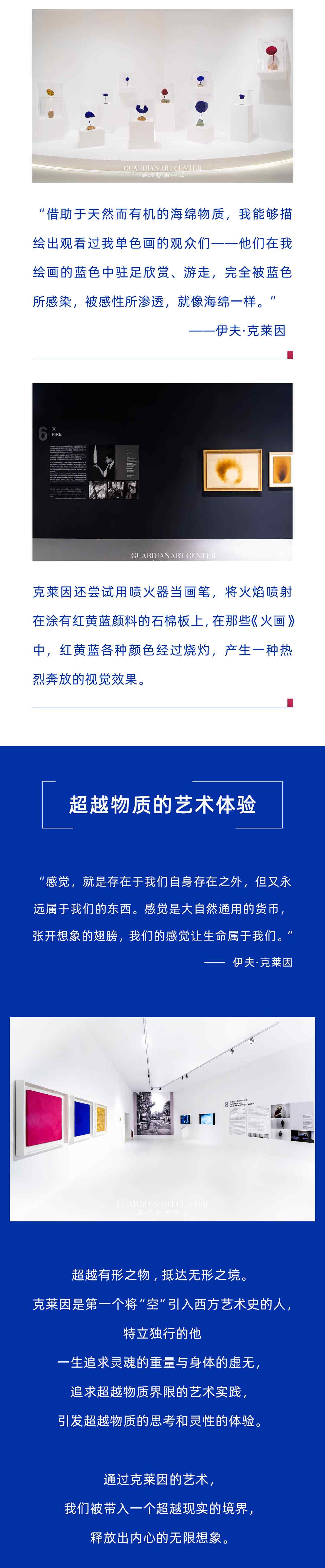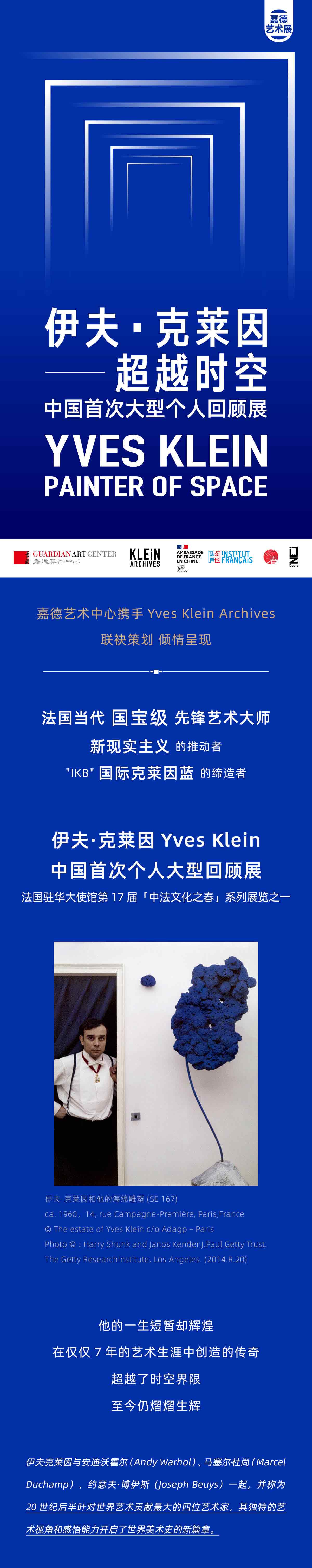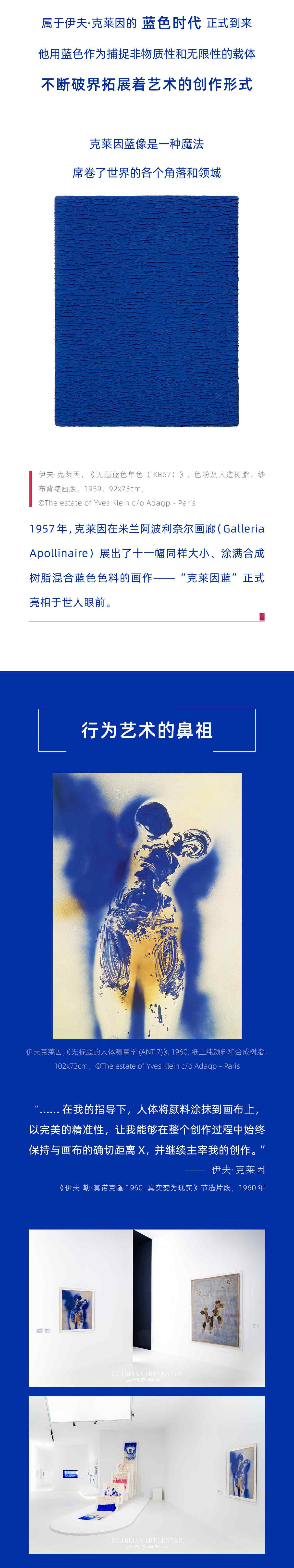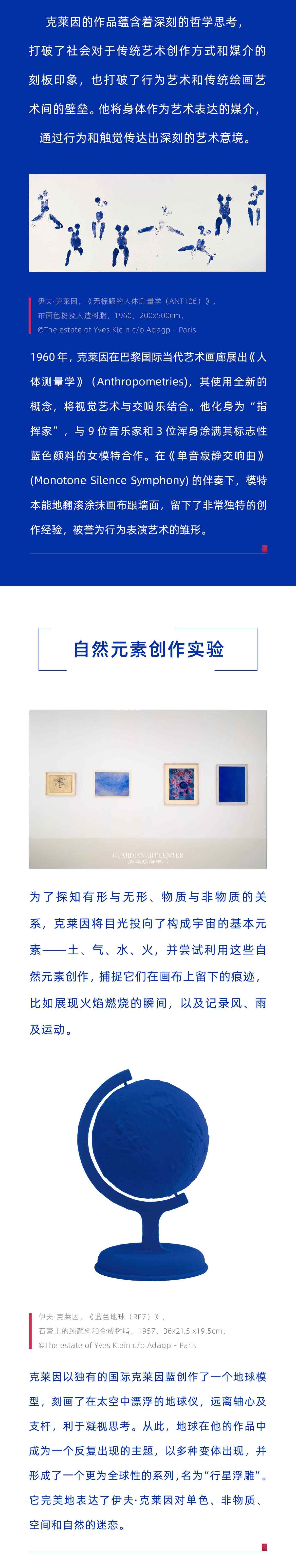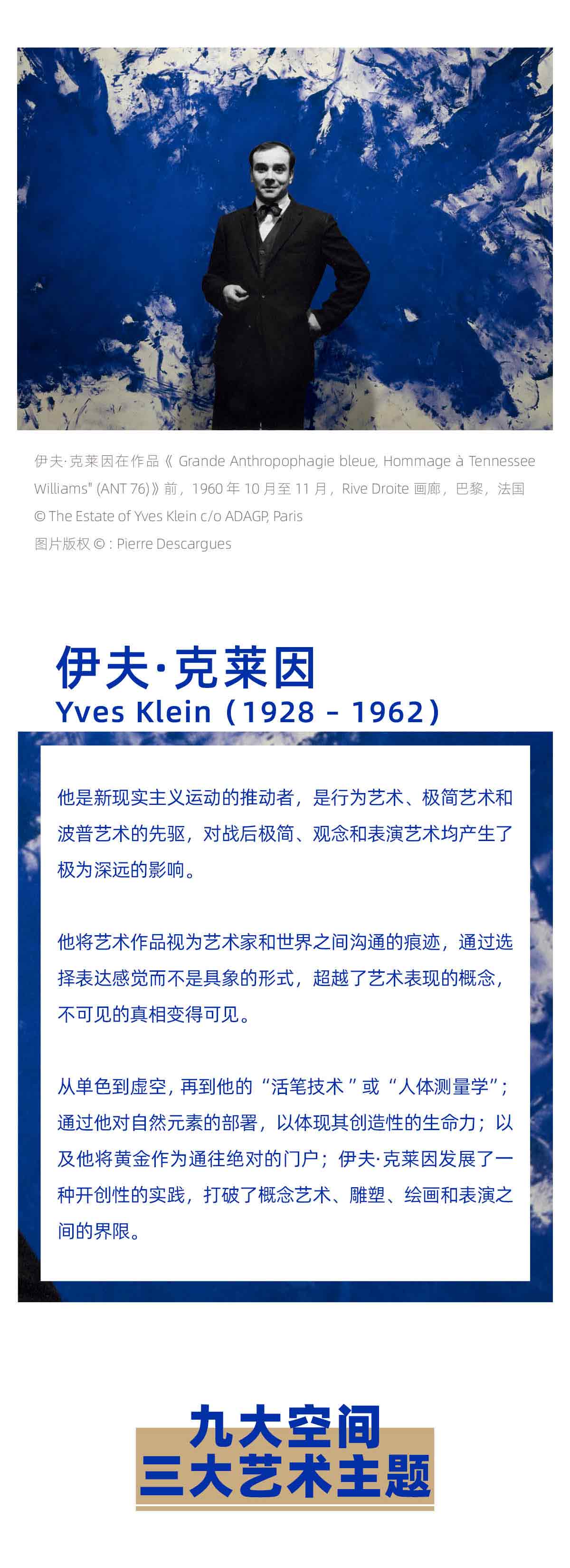 伊夫·克莱因总是在考虑如何带给观众惊喜。他决定专注于用一种颜色画画——蓝色,独属于克莱因的蓝色。他给画布、地球仪、树枝、画廊地板甚至给人体也涂上蓝色。他用火焰、雨水、风等各种全新的方式来作画,他自己追求多变艺术形式的一生也新颖得让人惊奇。