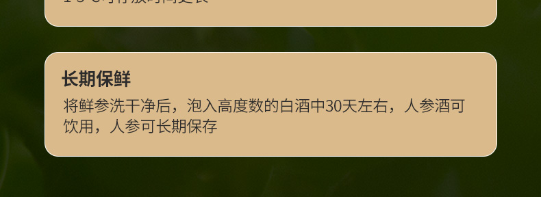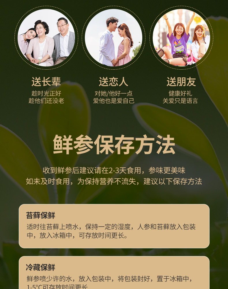品名: 长白山鲜人参规格1:1盒150g(5-6支) 注:单只约25-30g; 规格2:1盒150g(3支) 注:单只约50g; 规格3:1盒150g(2支) 注:单只约75g; 规格4:1盒精品礼盒200g(2支) 注:单只约100g; 快递:极兔、中通、圆通、韵达、申通随机发货 运费模板:新疆、西藏、港澳台不发货 发货时效:48-72h 发货地/产地:吉林长白山 保质期:冰箱冷冻保存3-6个月;发货自带的苔藓包裹 冷藏保存5-15天; 销售售卖期:8月-次年4月 周六周天、节假日除外,早上十点之前的订单是48小时发货 ,到货时间约为2-5天,请您耐心等待 |