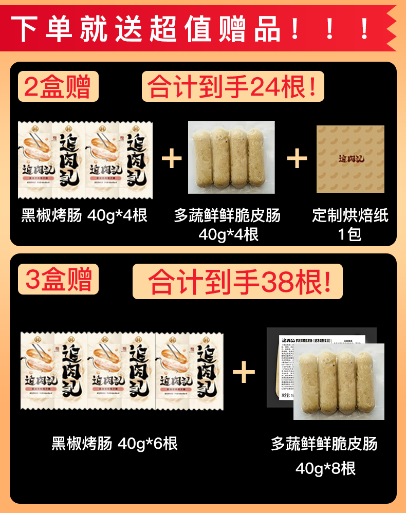3盒赠:正装黑椒烤肠*6根+多蔬鲜鲜脆皮肠*8根(到手38根)