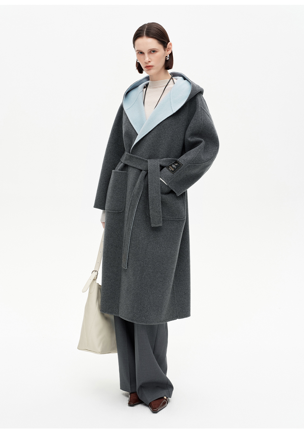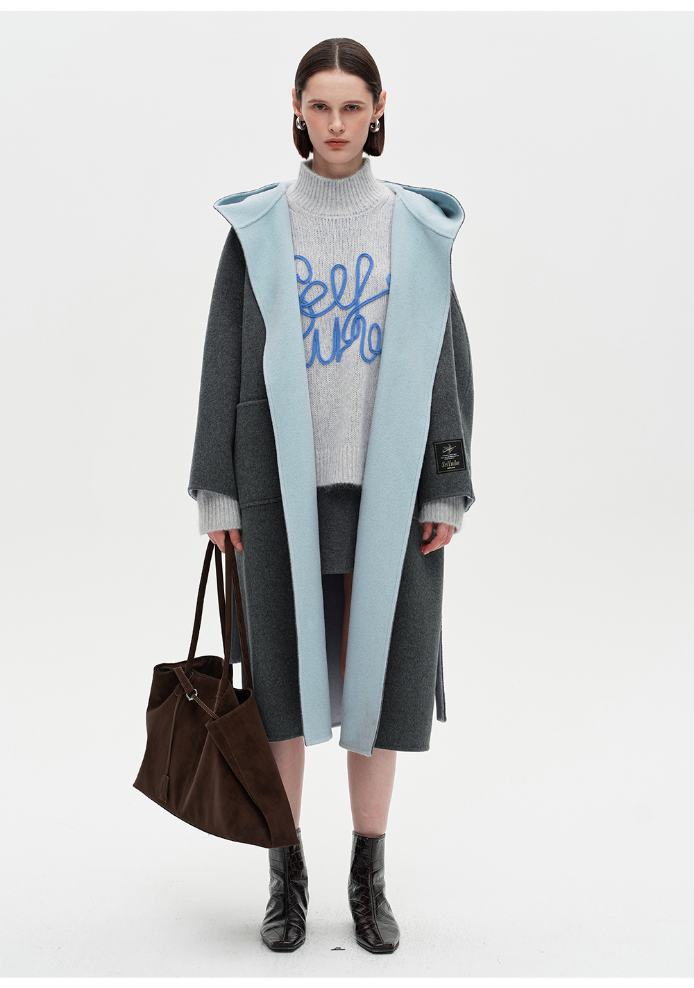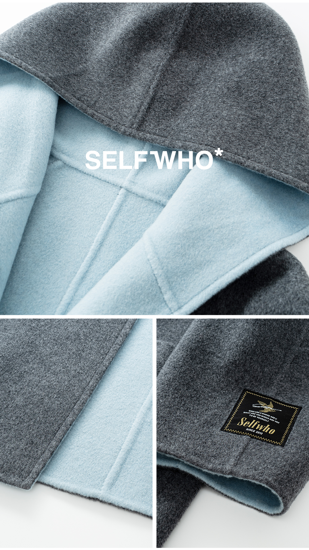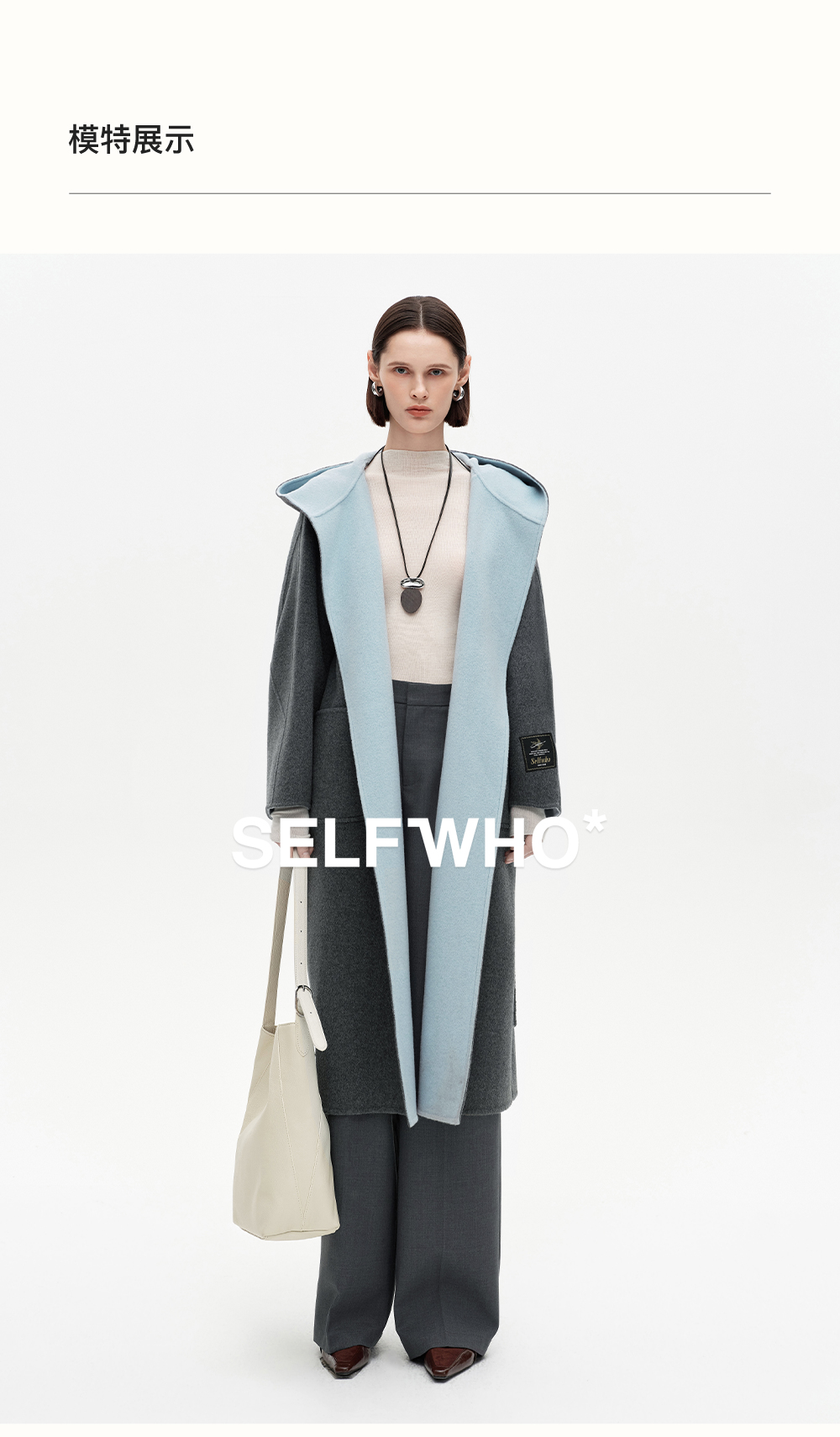 SELFWHO绵羊毛混纺浴袍式撞色毛呢外套女2025冬新款腰带连帽大衣
