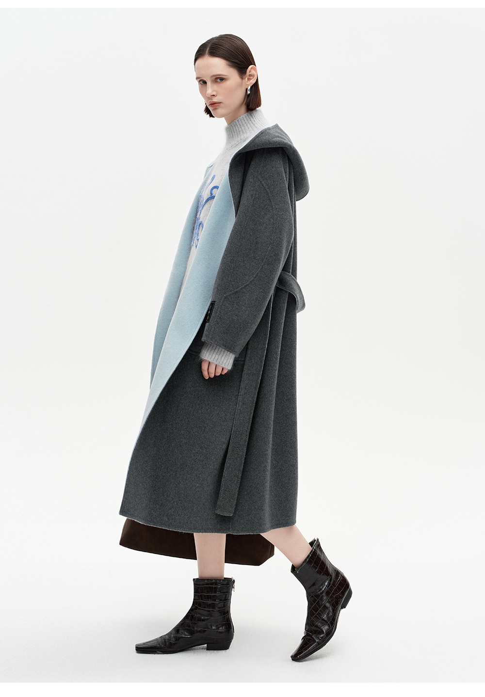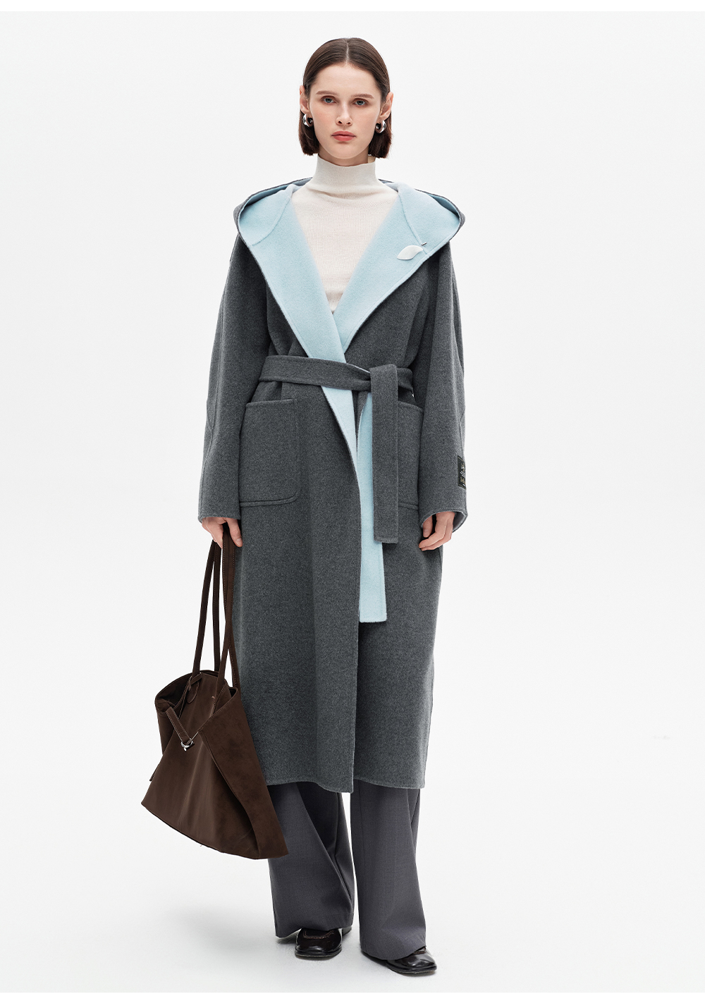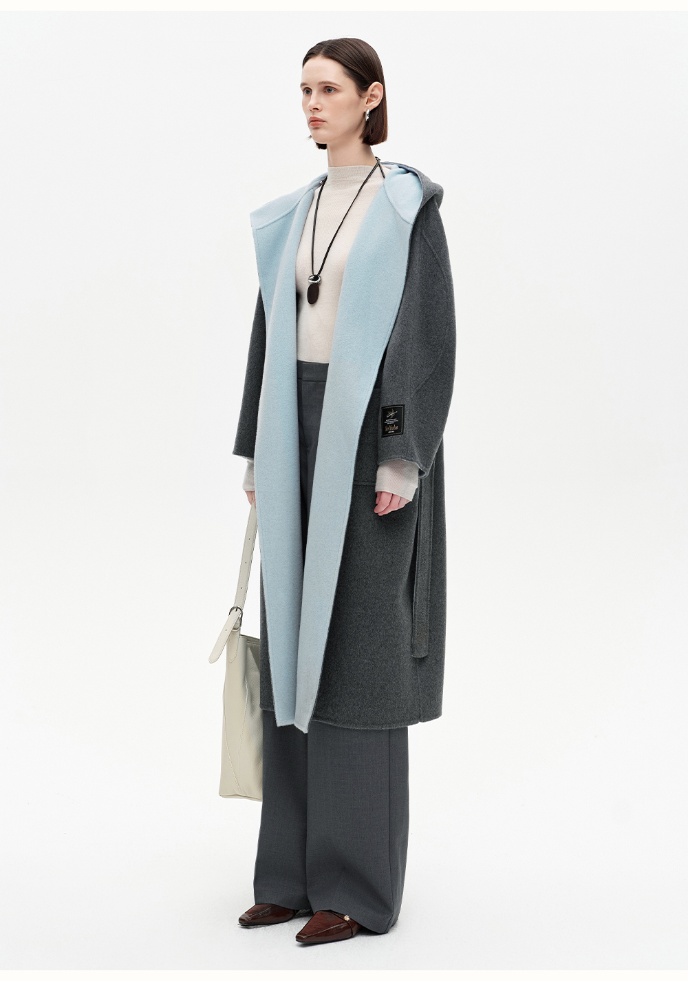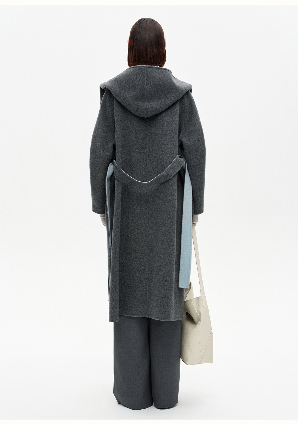 SELFWHO绵羊毛混纺浴袍式撞色毛呢外套女2025冬新款腰带连帽大衣