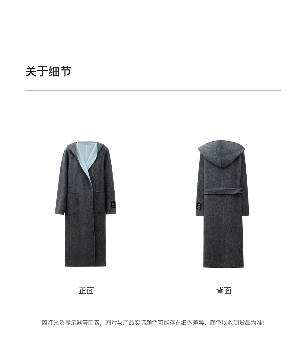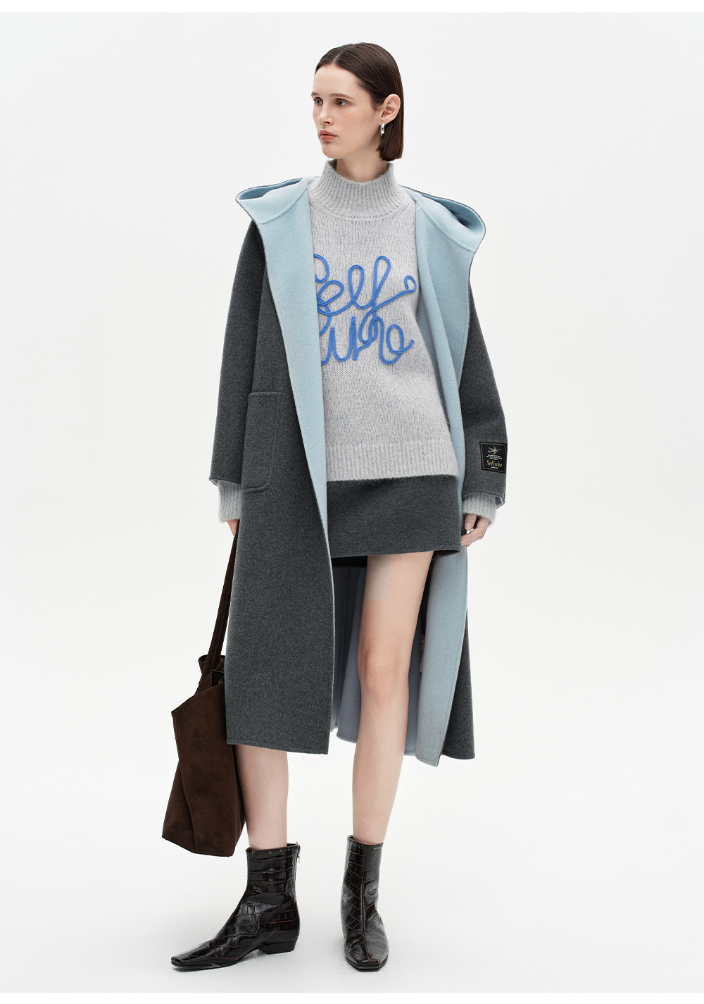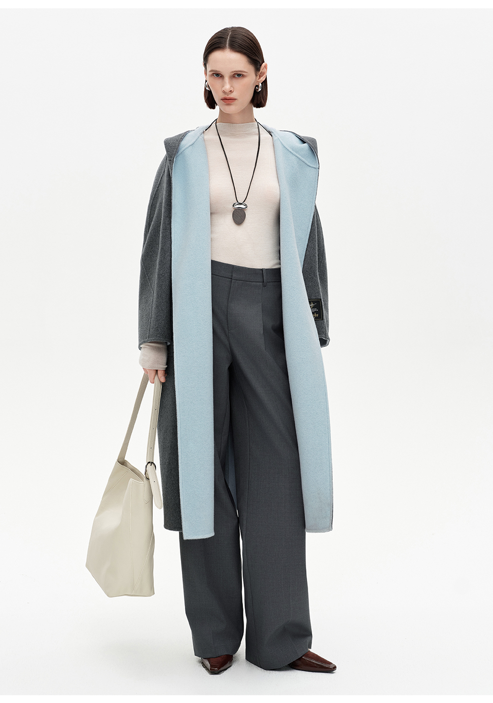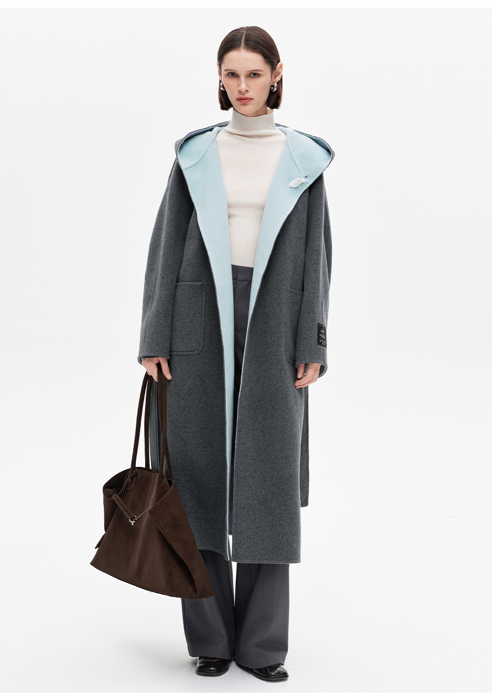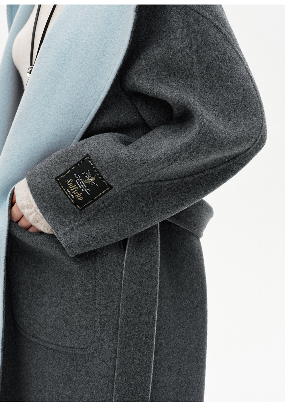 SELFWHO绵羊毛混纺浴袍式撞色毛呢外套女2025冬新款腰带连帽大衣