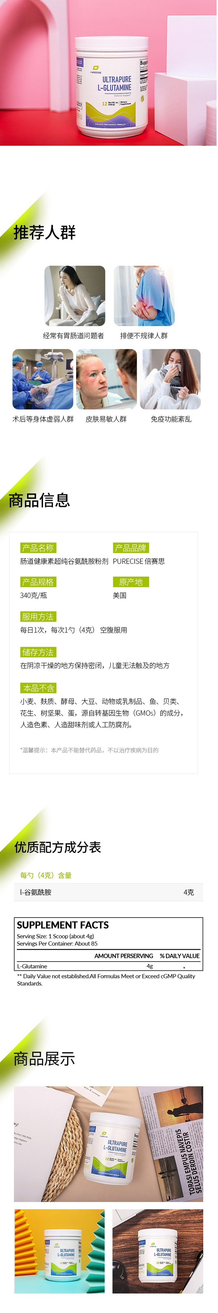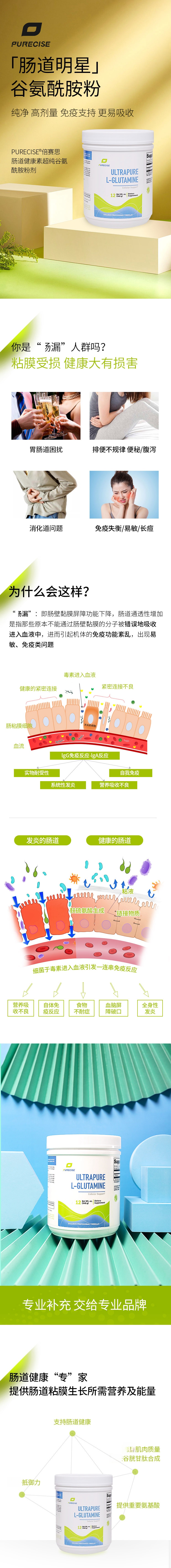 【肠道健康素-谷氨酰胺粉剂】UltraPure L-Glutamine 340g 优质谷氨酰胺 支持肠道健康 肠漏 Purecise 倍赛思