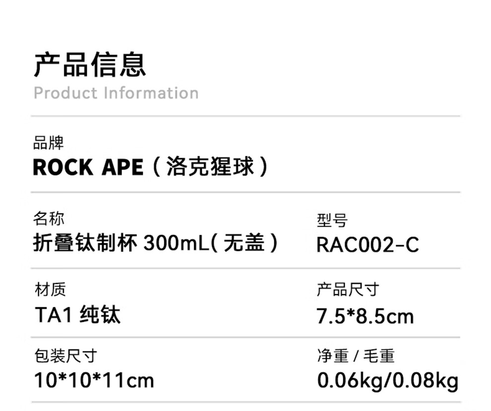 洛克猩球 折叠钛制杯300mL(无盖)RAC002-C