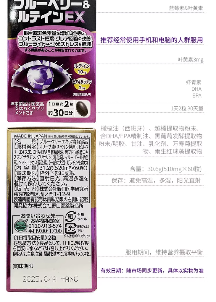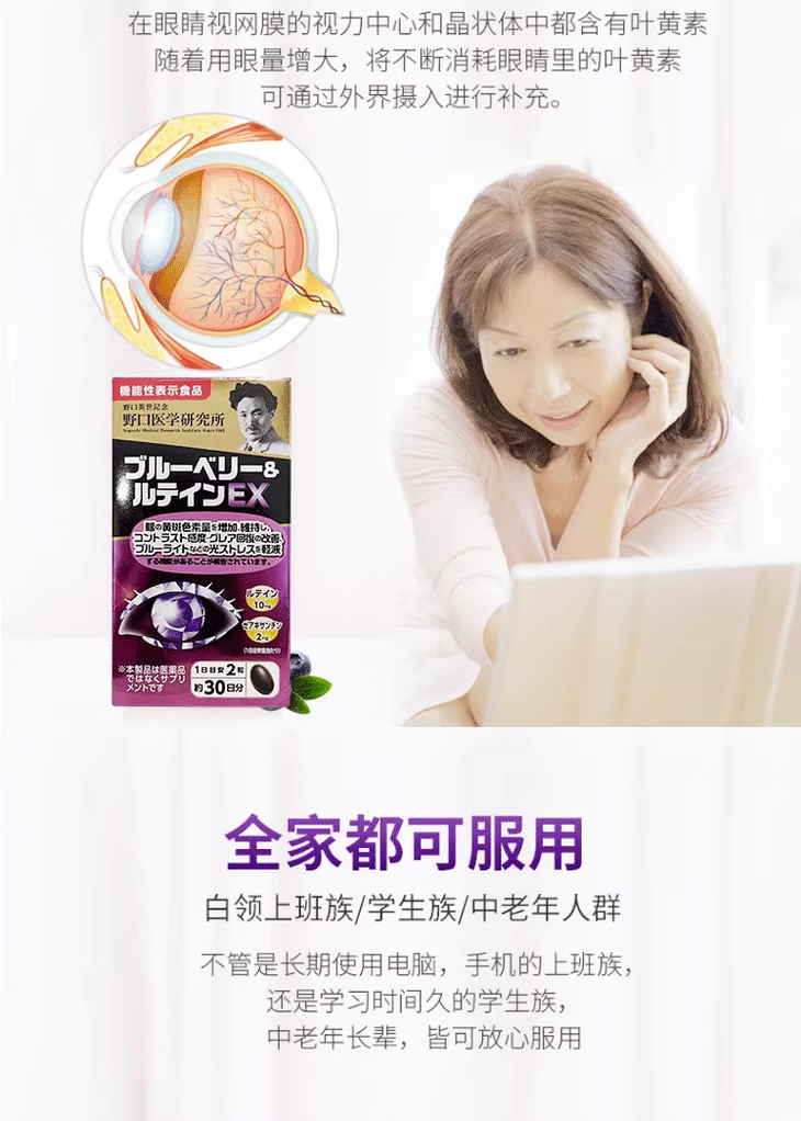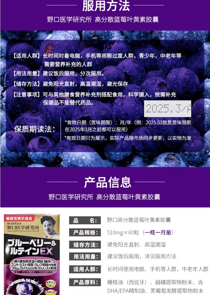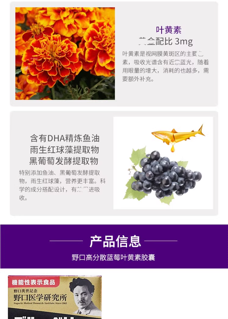 【日本直邮】Noguchi 野口医学研究所 高分散越橘蓝莓叶黄素护眼胶囊 60片加强版