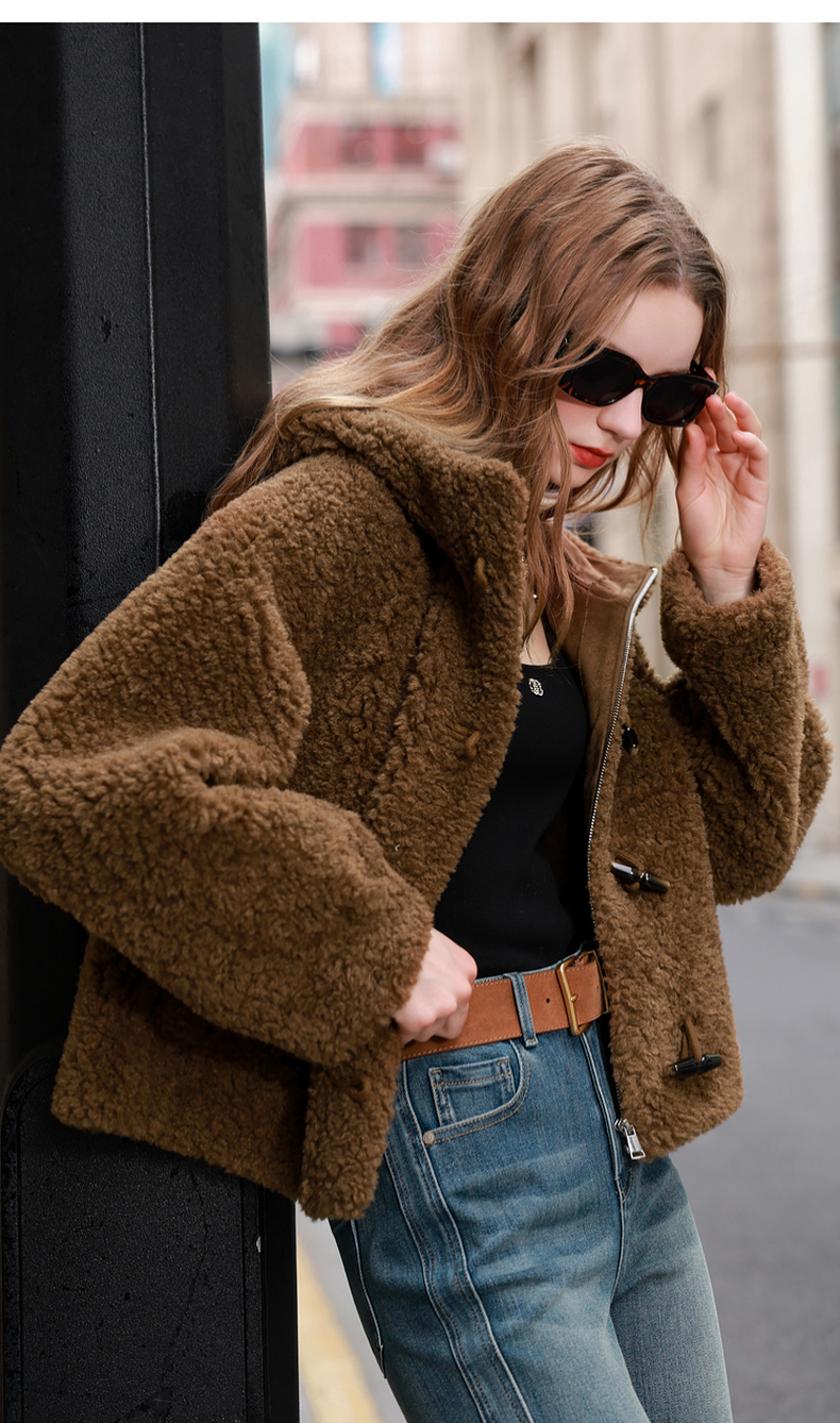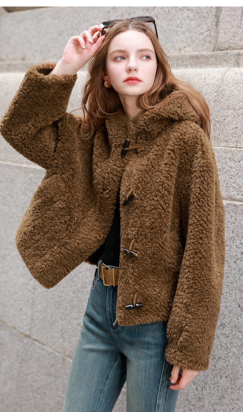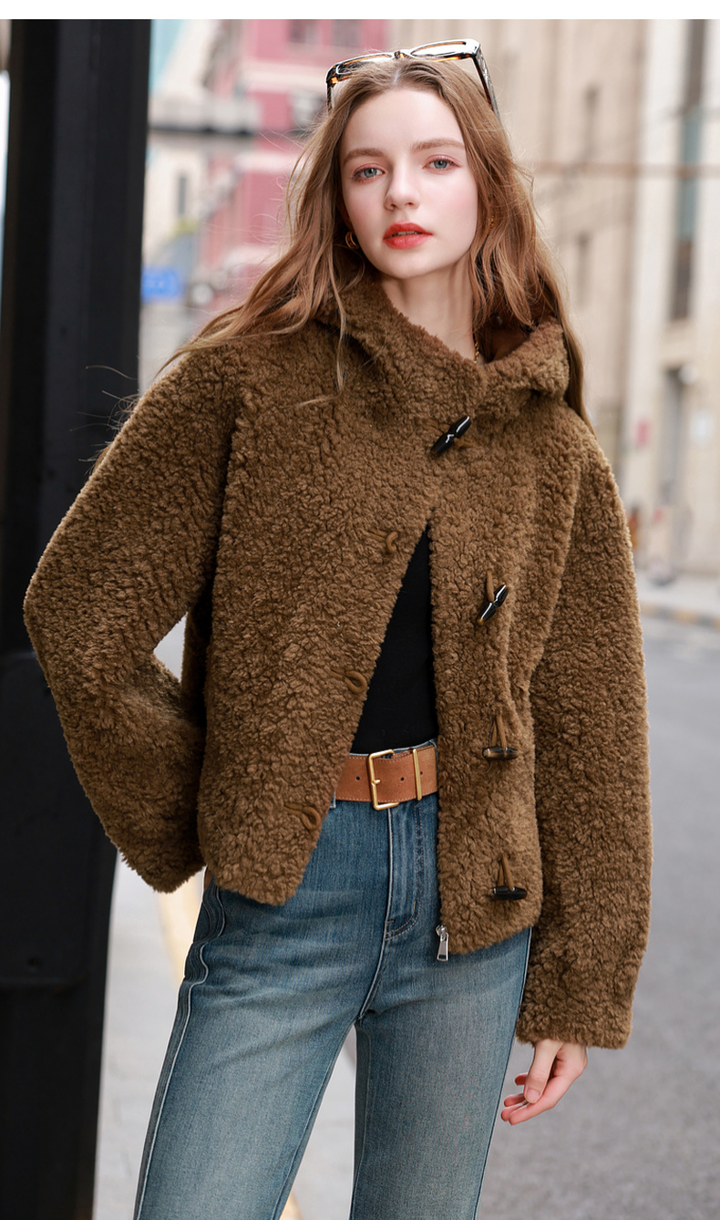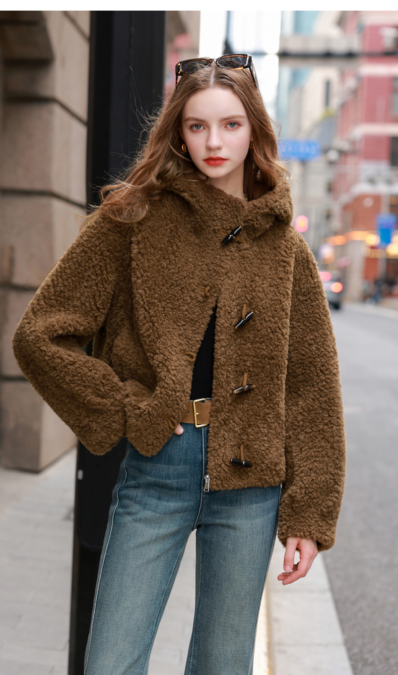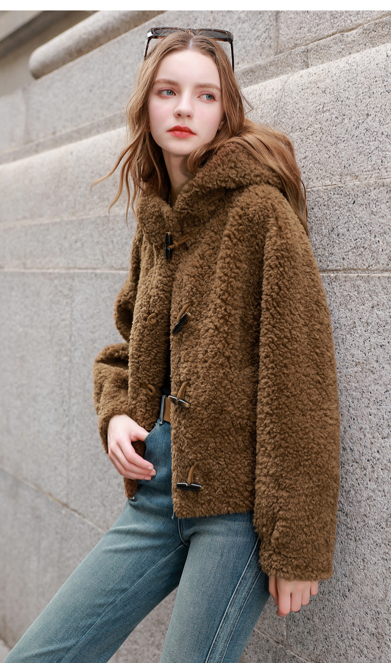 三彩2025冬季新款环保皮草连帽毛毛外套宽松牛角扣休闲M