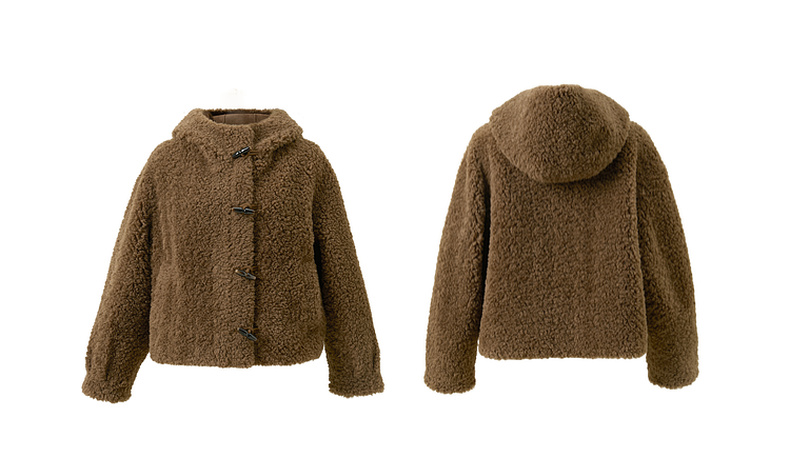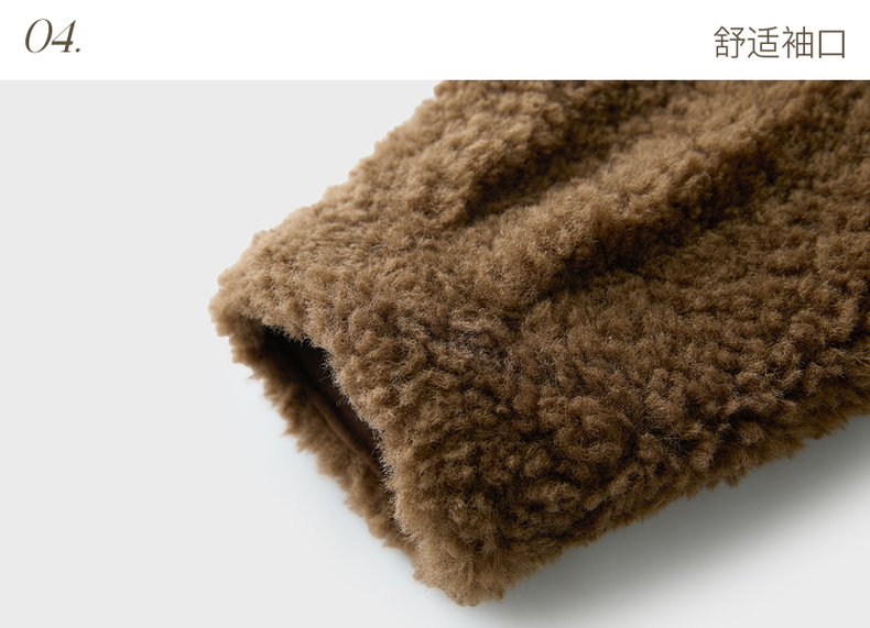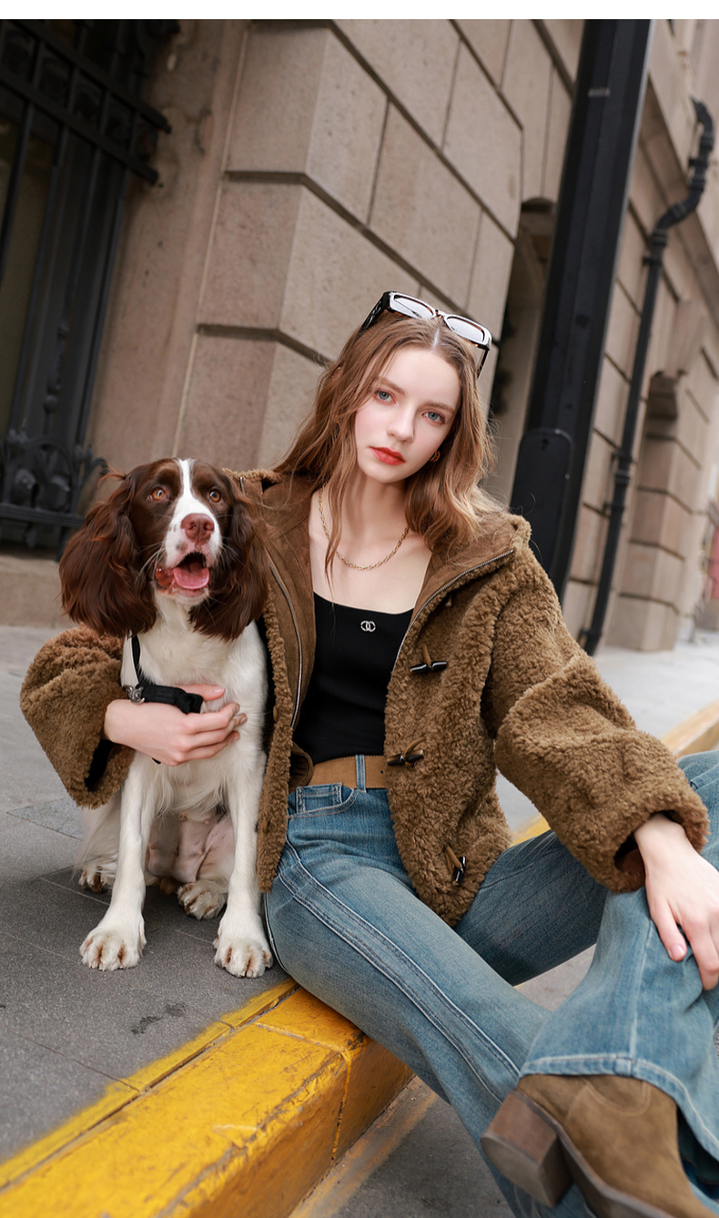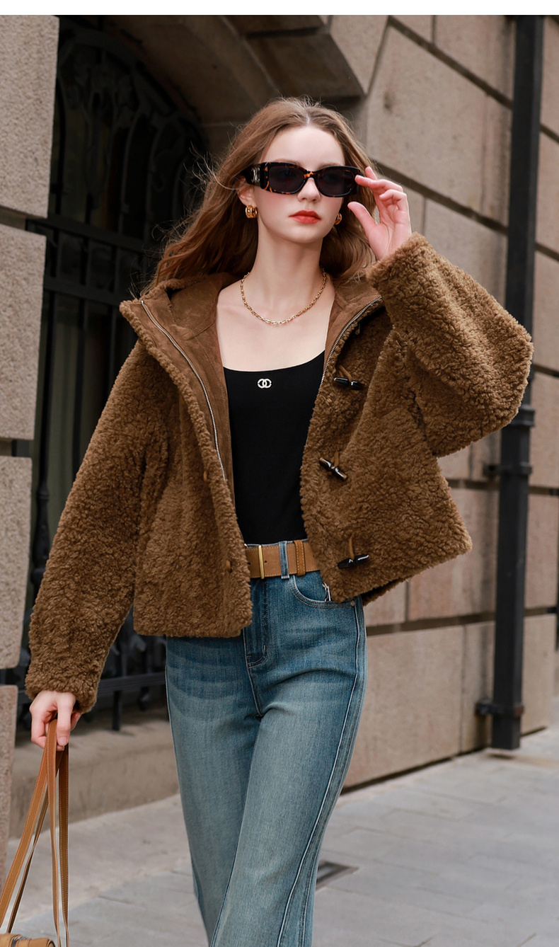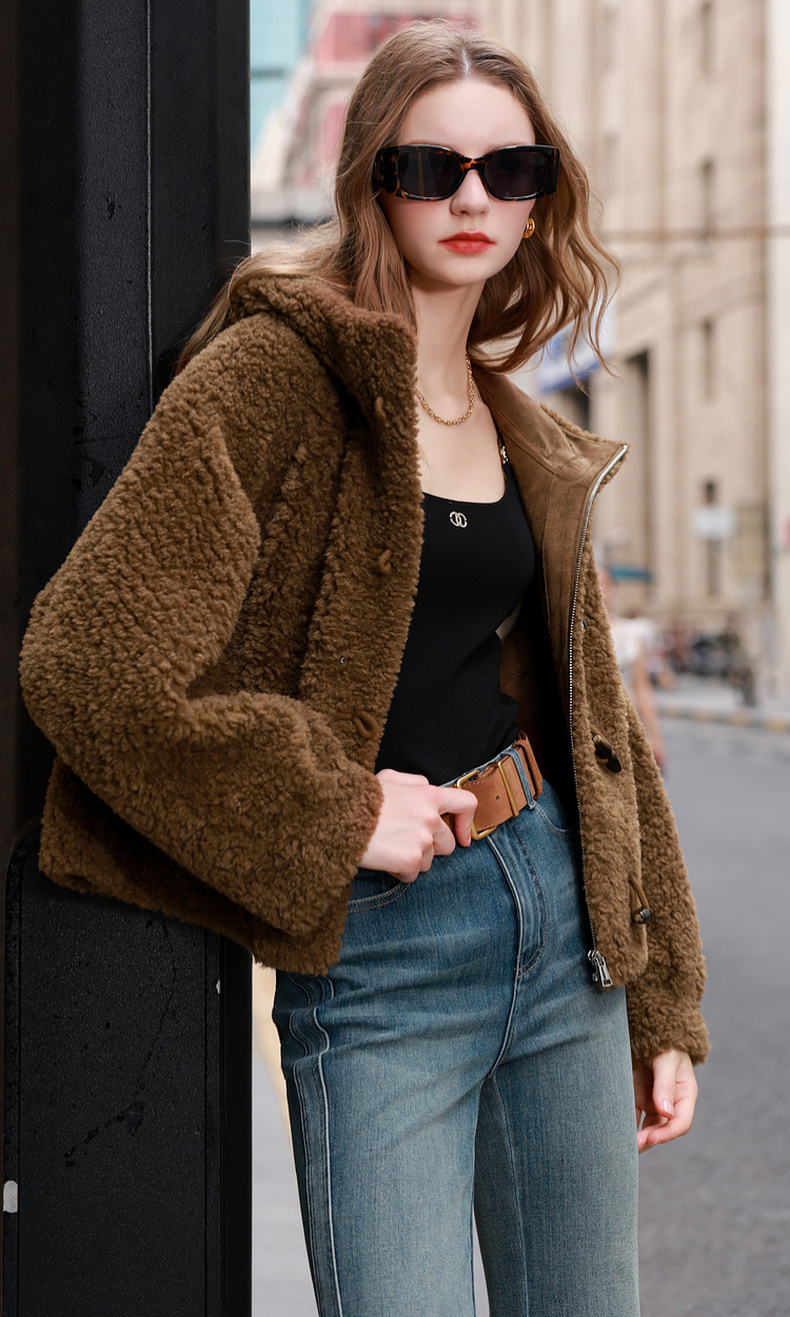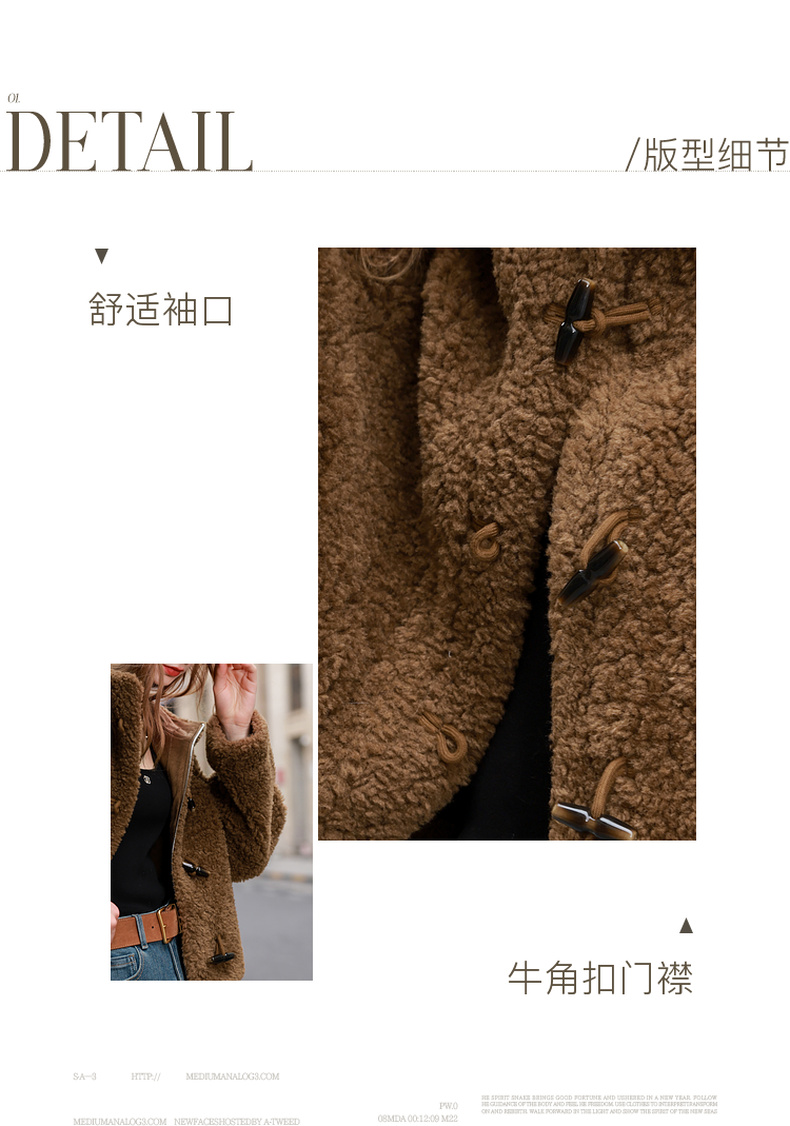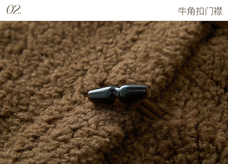 三彩2025冬季新款环保皮草连帽毛毛外套宽松牛角扣休闲M