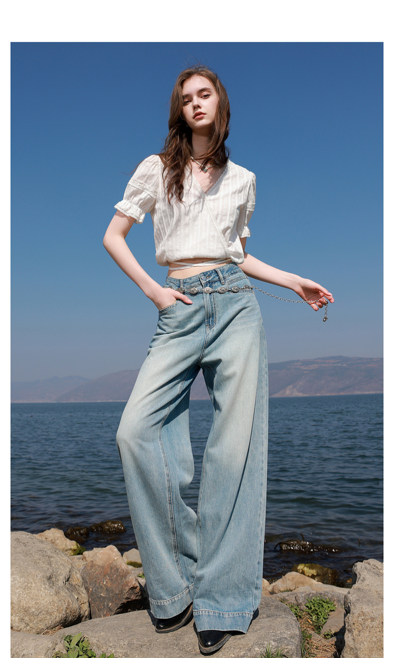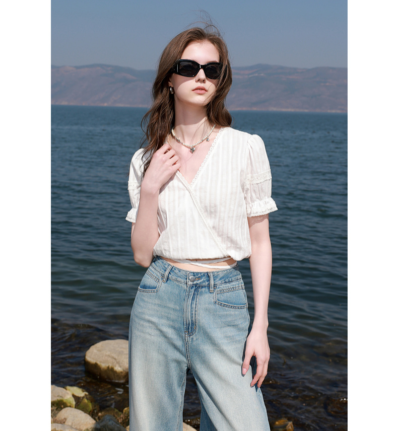 三彩2025夏季新款纯棉提花衬衫法式V领蕾丝拼接小衫绑带短款M