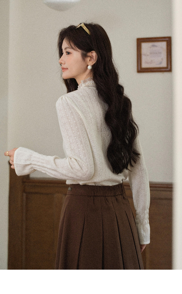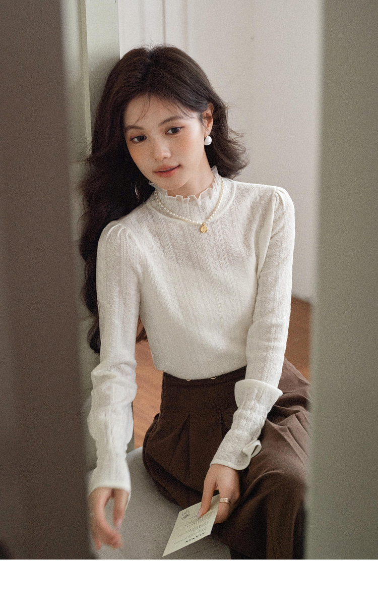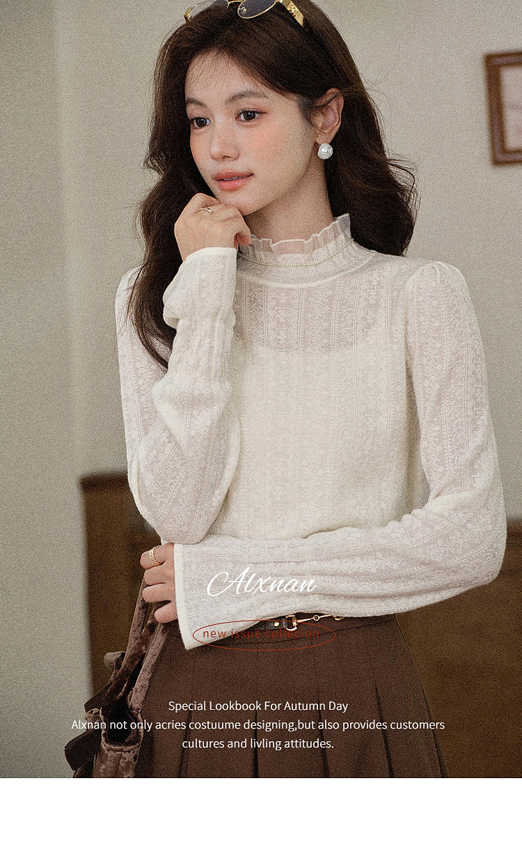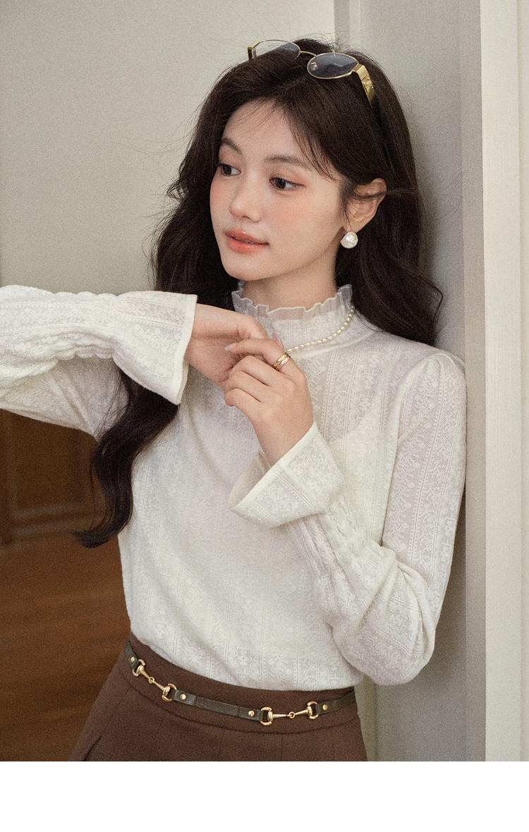 鹿向南「云朵柔雾」杏色半高领蕾丝打底针织衫女秋季内搭长袖上衣