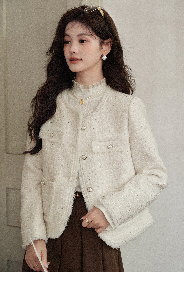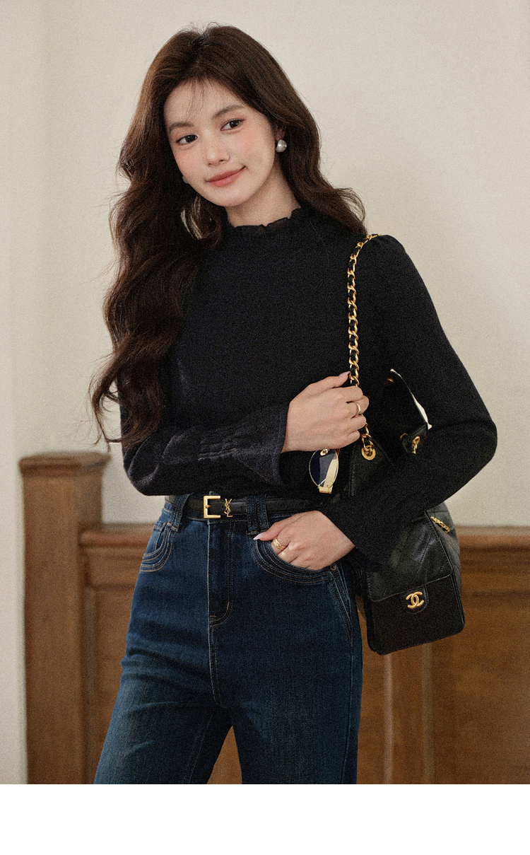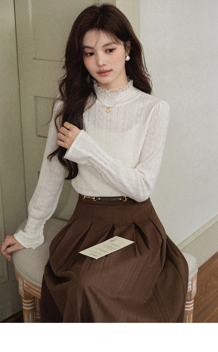 鹿向南「云朵柔雾」杏色半高领蕾丝打底针织衫女秋季内搭长袖上衣