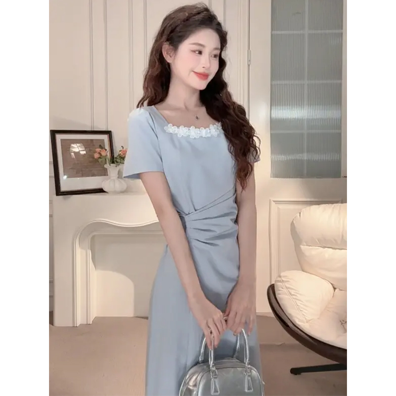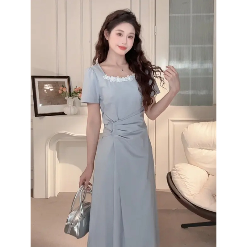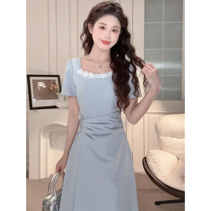 【6折秒杀】鹿向南「花田茶会」蓝色气质连衣裙女夏季方领收腰显瘦短袖长裙子QJD00371