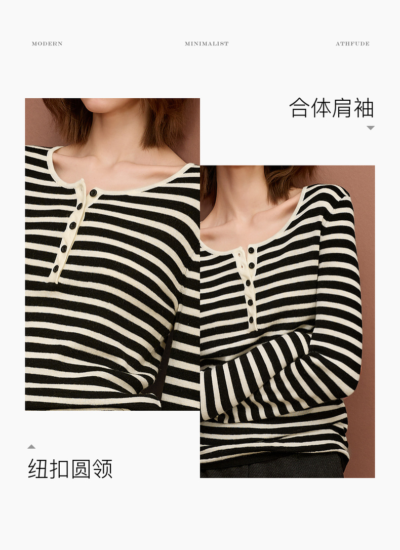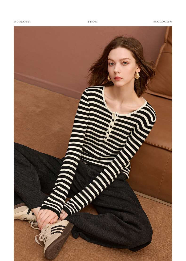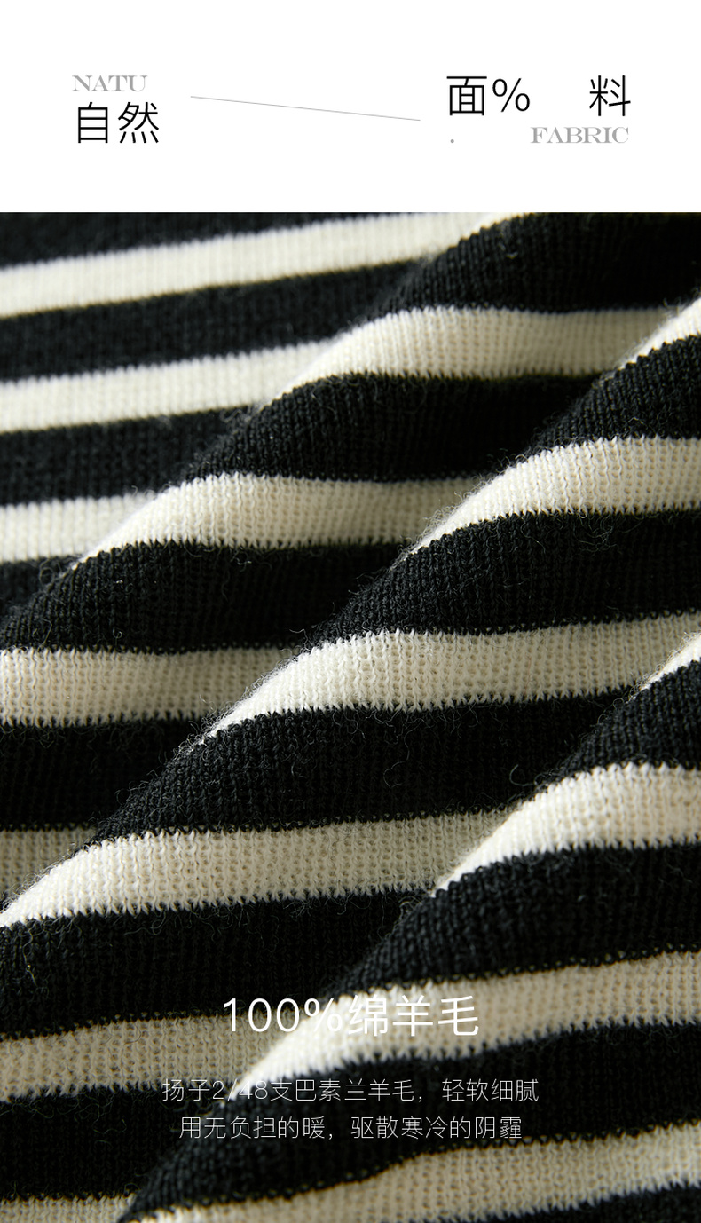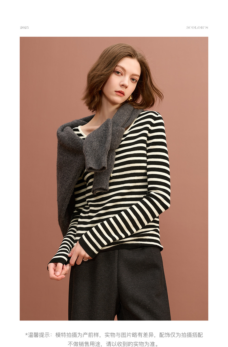 【100绵羊毛】三彩2025冬季新款条纹针织衫长袖套头打底衫毛衫S