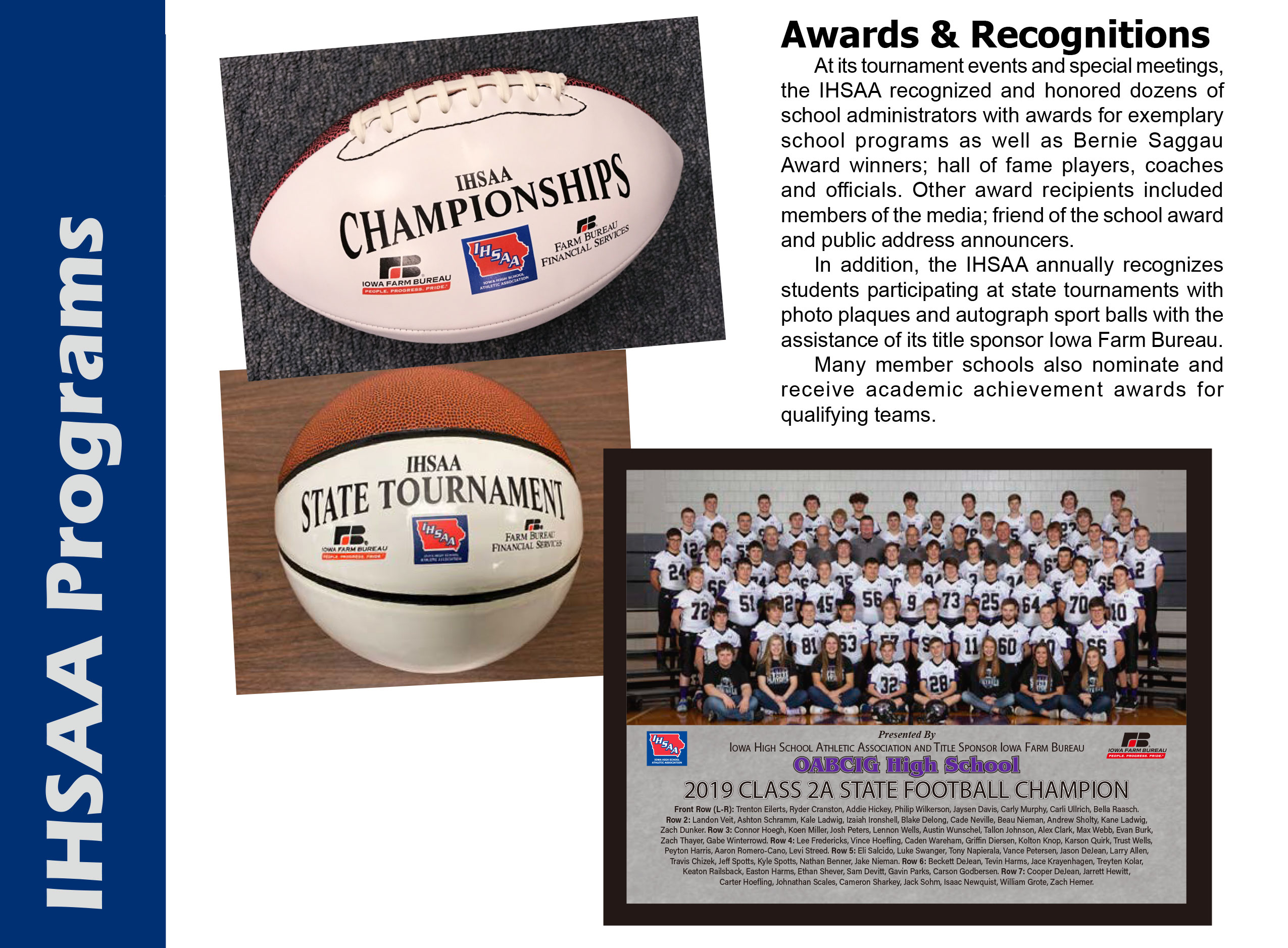 IOWA HIGH SCHOOL ATHLETIC ASSOCIATION(IHSAA) 主要负责组织和管理该州高中体育赛事,包括足球、橄榄球、篮球、高尔夫等运动项目。