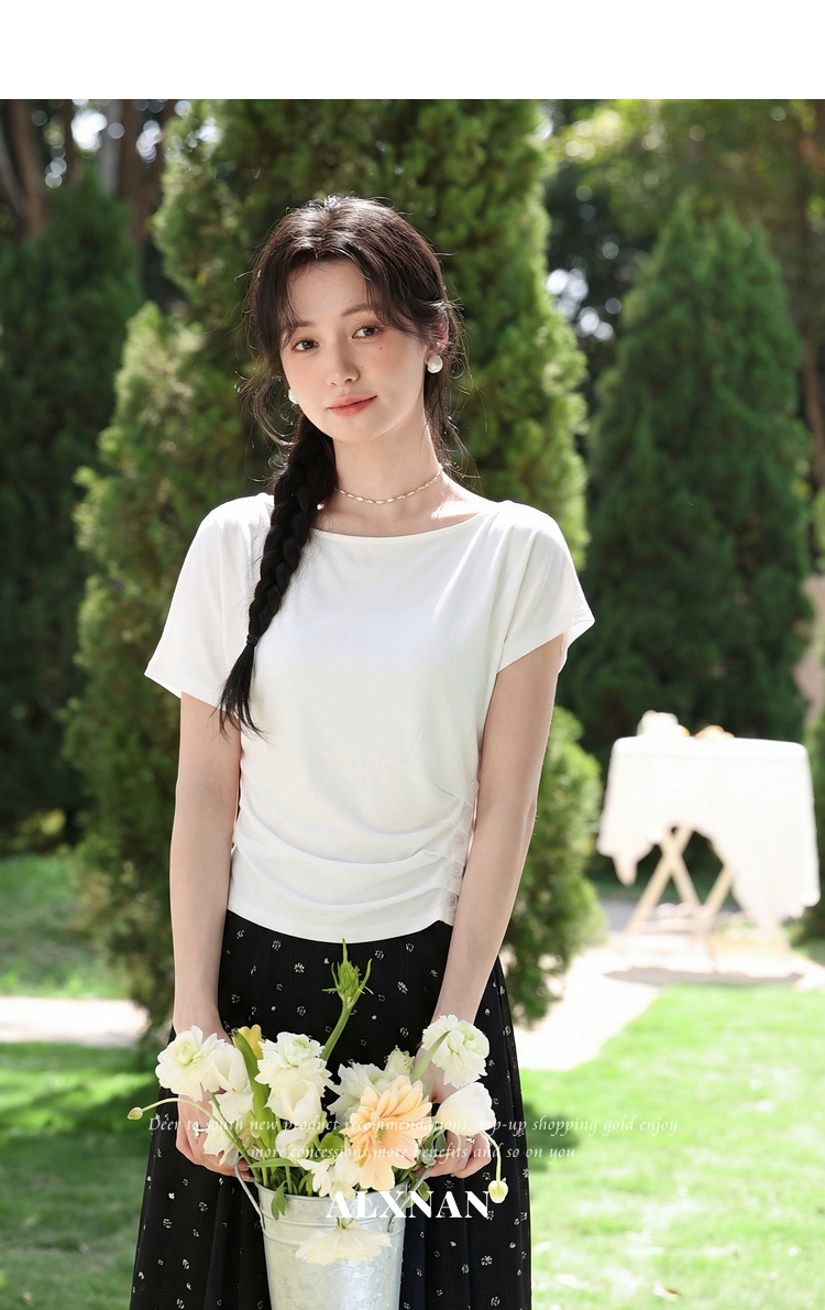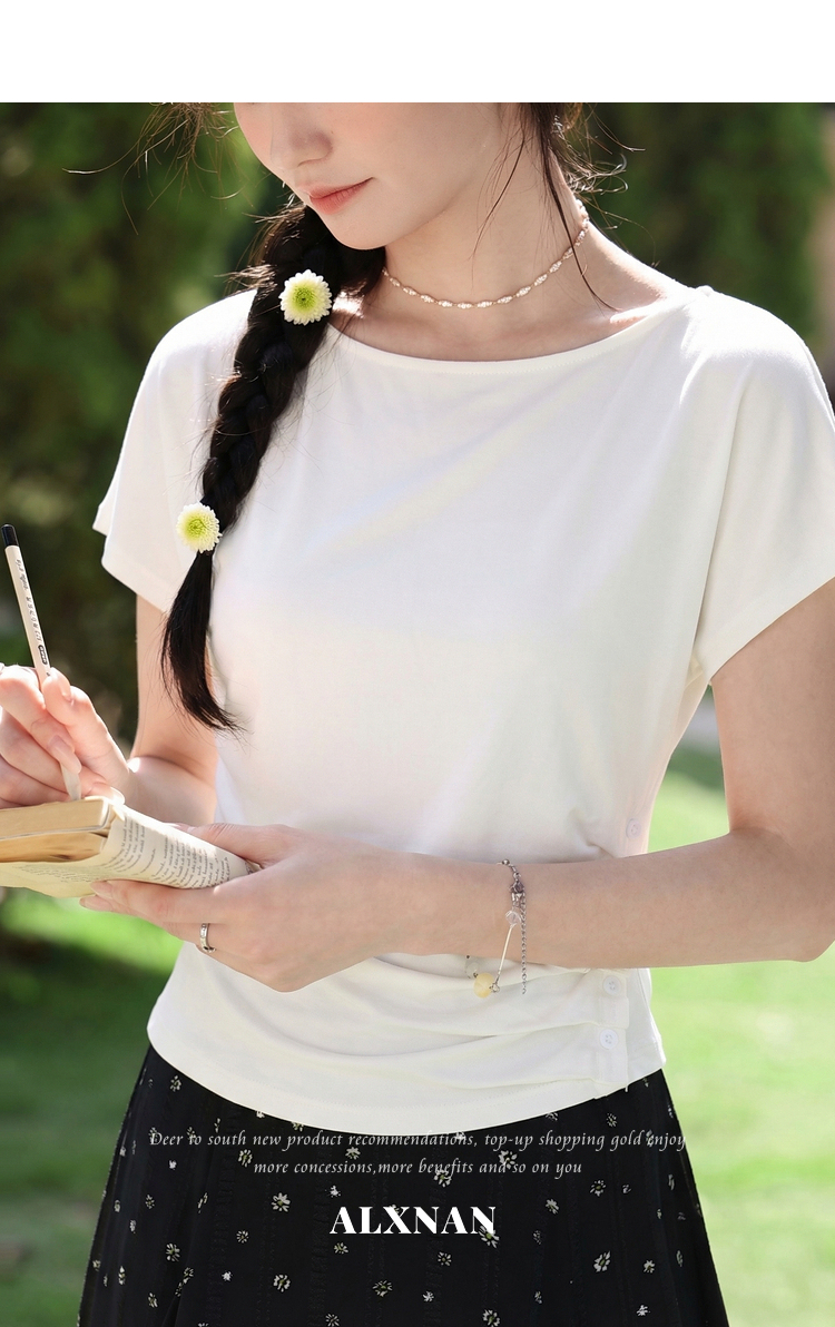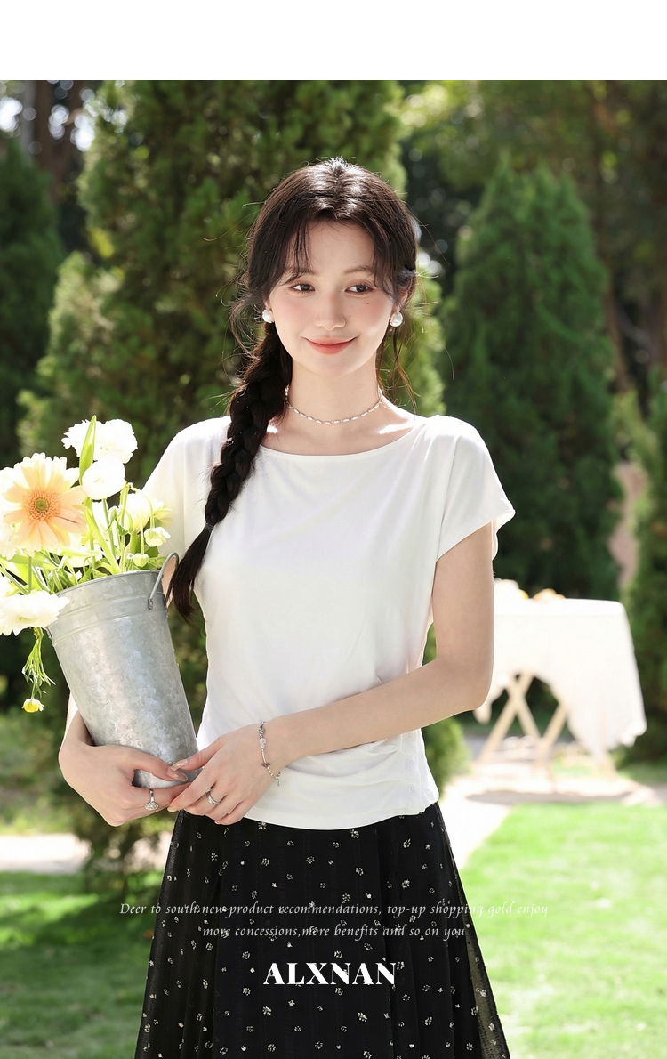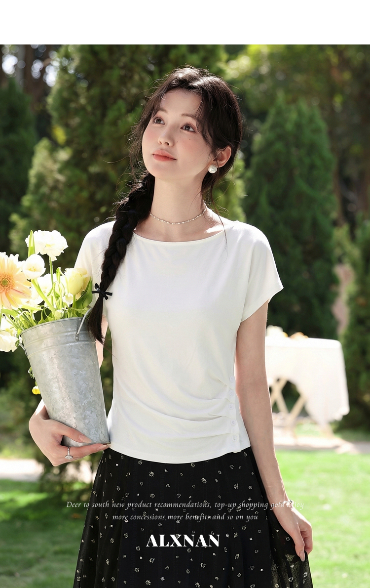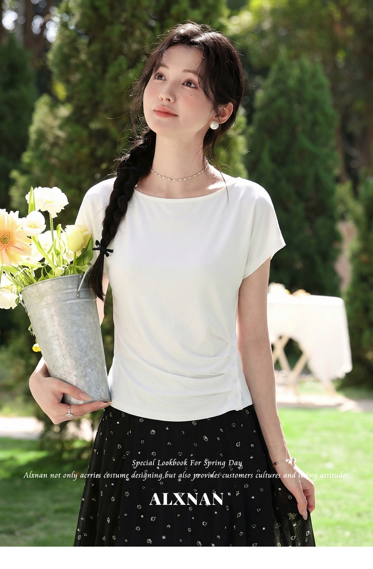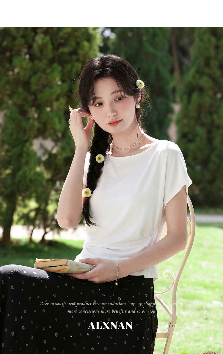 鹿向南「白栀轻语」简约白色圆领T恤女2026夏季新款收腰显瘦上衣