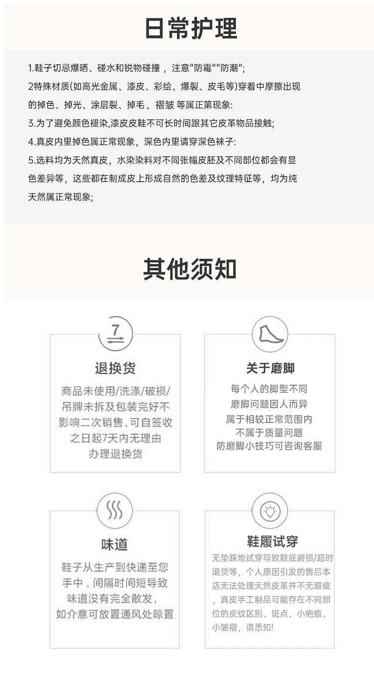 【特别提醒】试穿请用垫子垫好鞋底,在干净的地面上试穿,避免鞋底留下印子影响二次销售。鞋子都是真皮材质,不能水洗,用湿纸巾擦拭即可