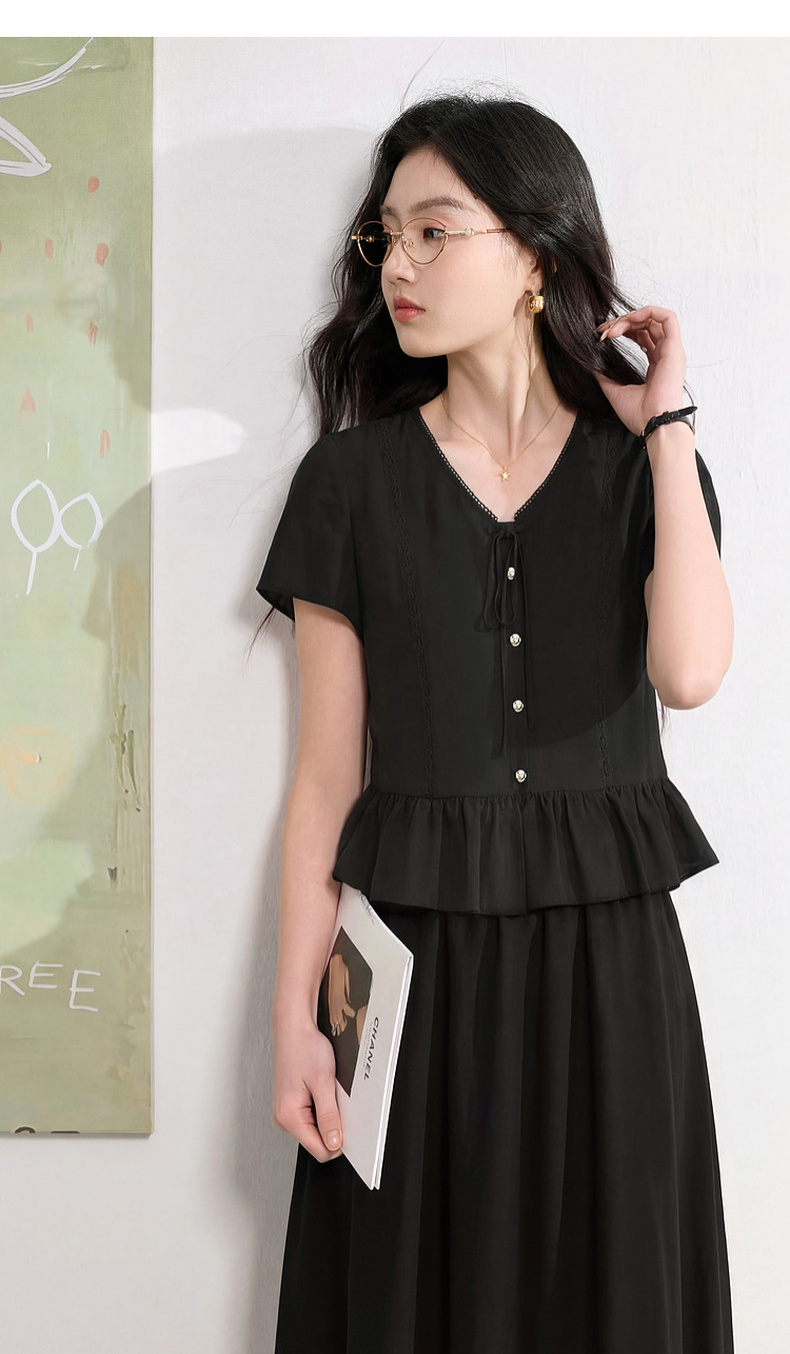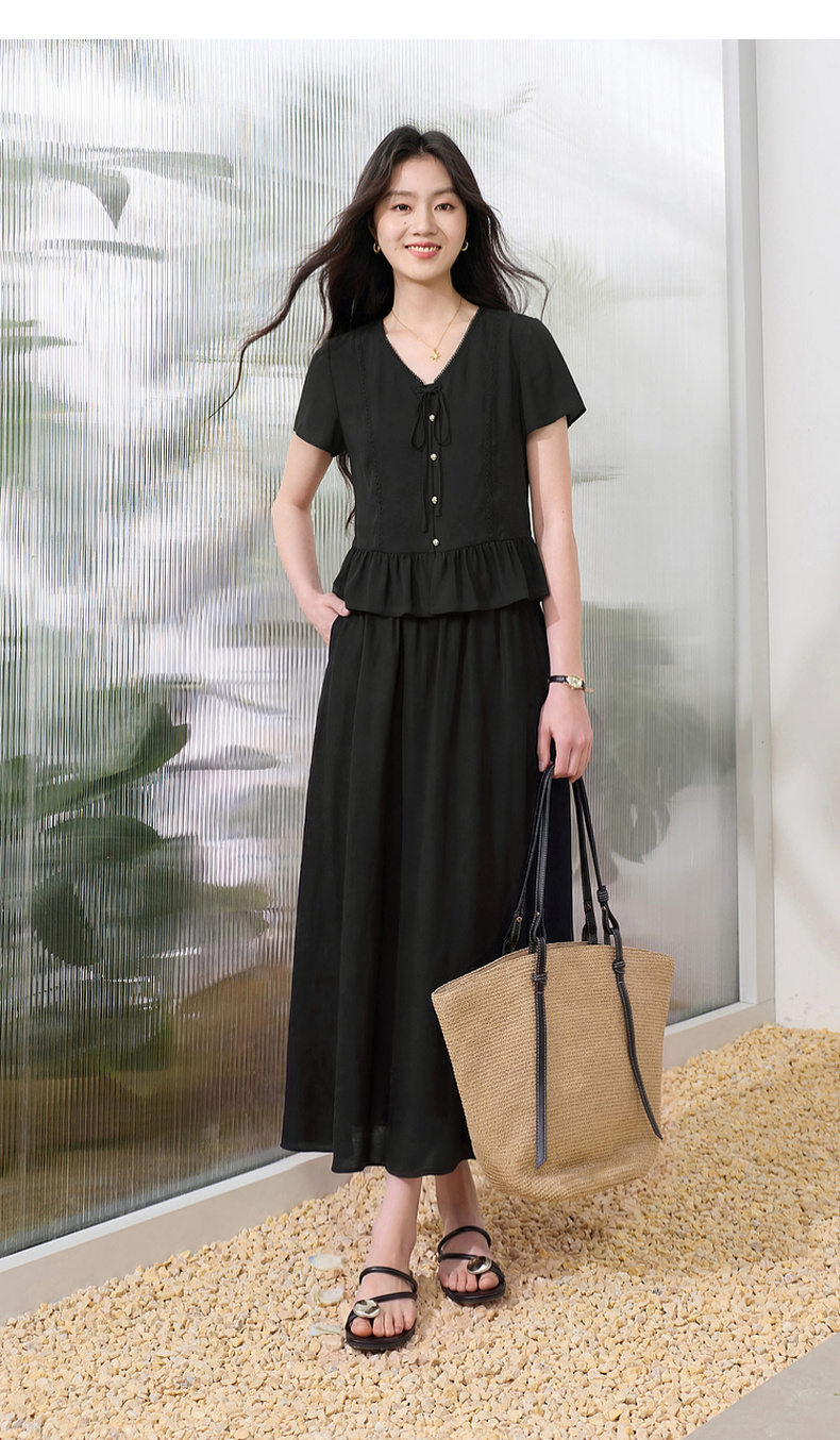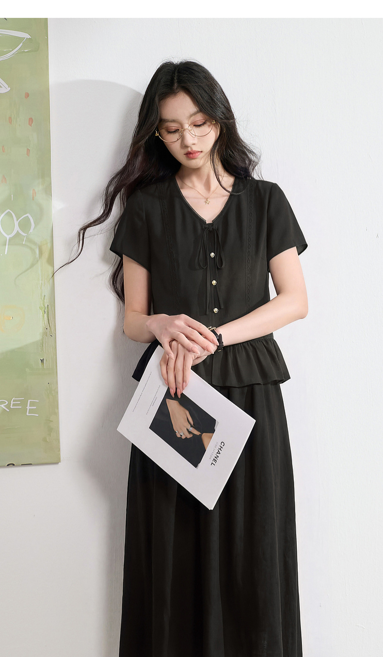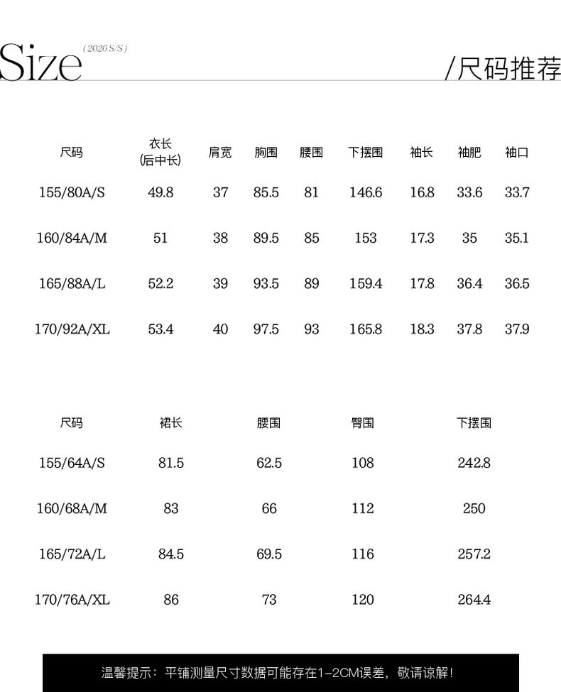 【醋酸】三彩2026夏季新款套装V领衬衫上衣半身裙A字长裙两件套S