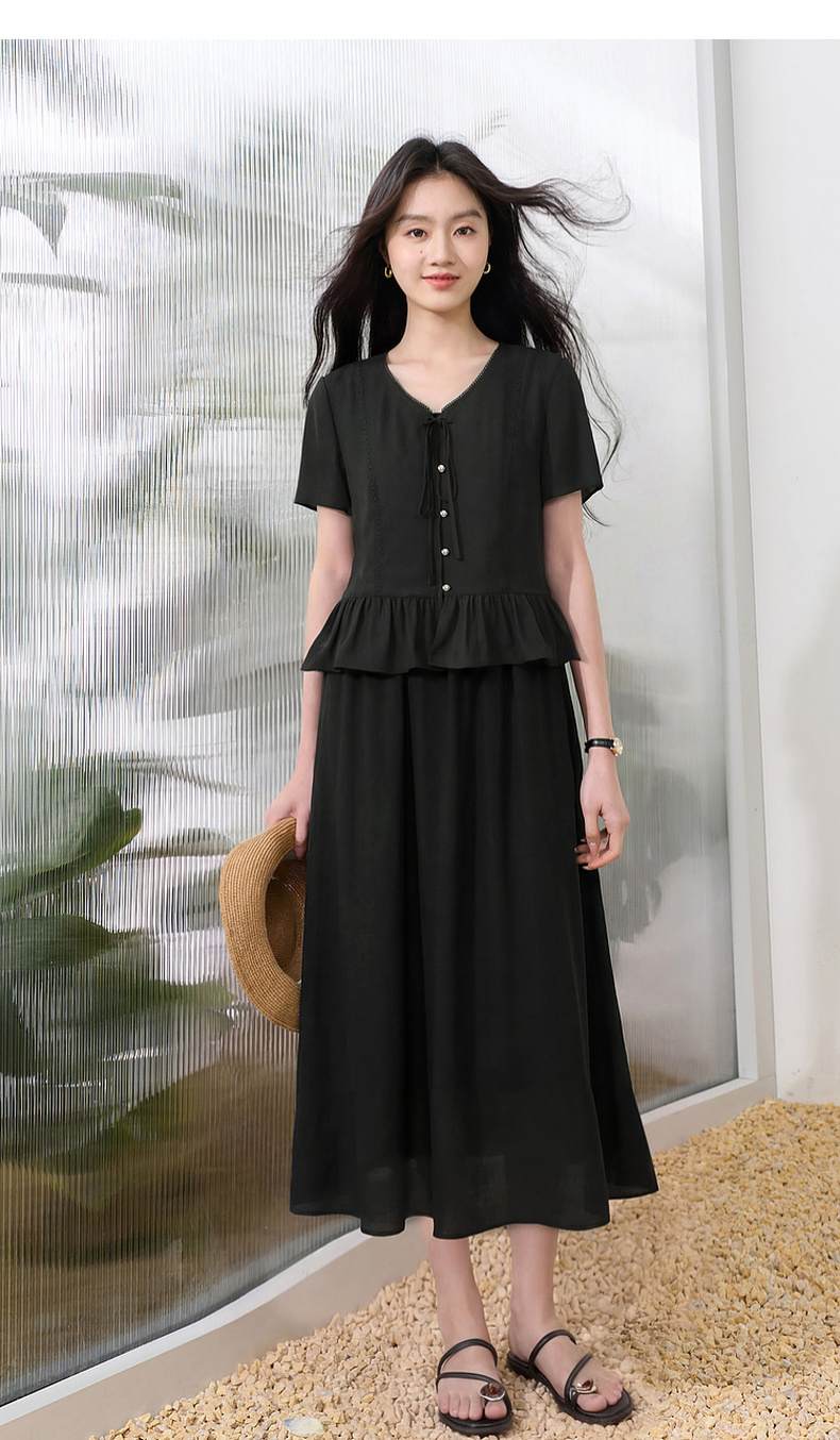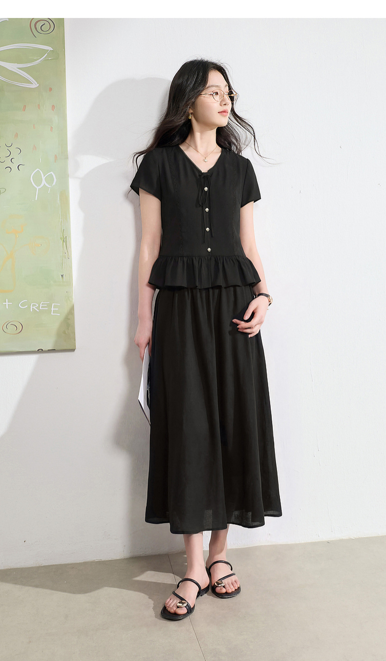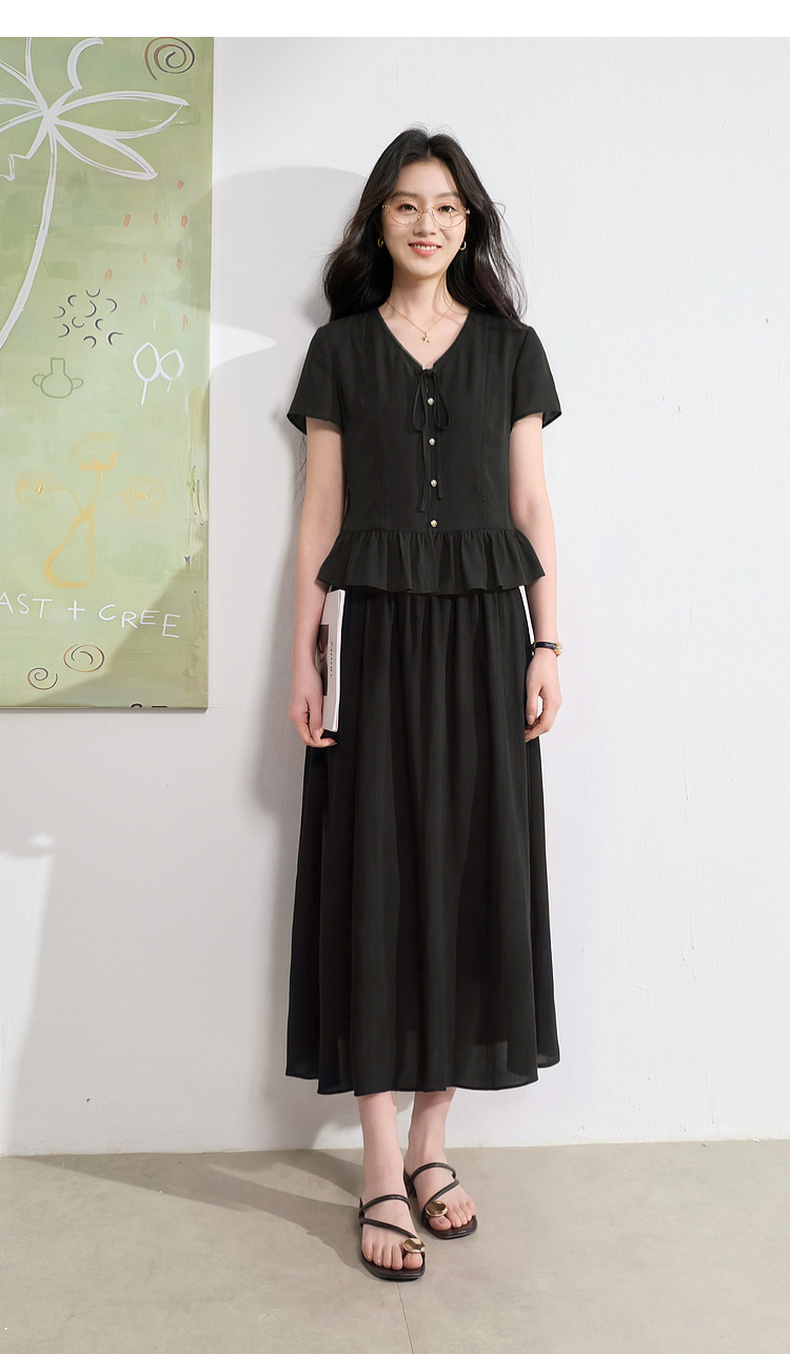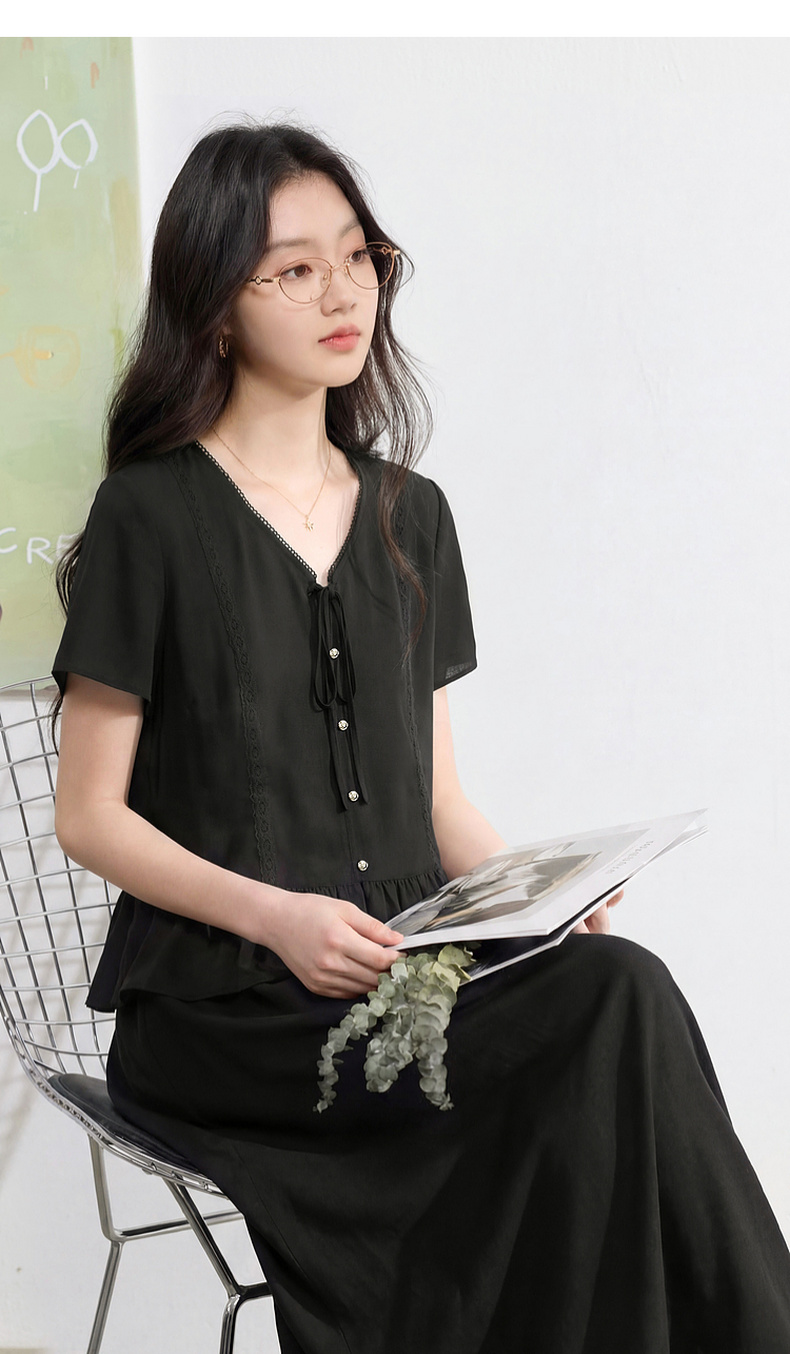 【醋酸】三彩2026夏季新款套装V领衬衫上衣半身裙A字长裙两件套S